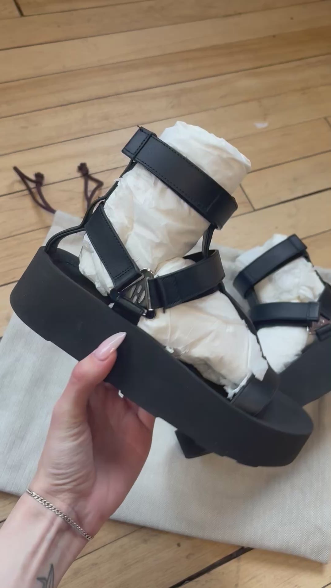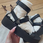 Hermes 'Enid Gladiator' platform sandals with black leather gladiator style velcro straps. Features signature silver 'H diamond' buckle details, and ultra light soles.