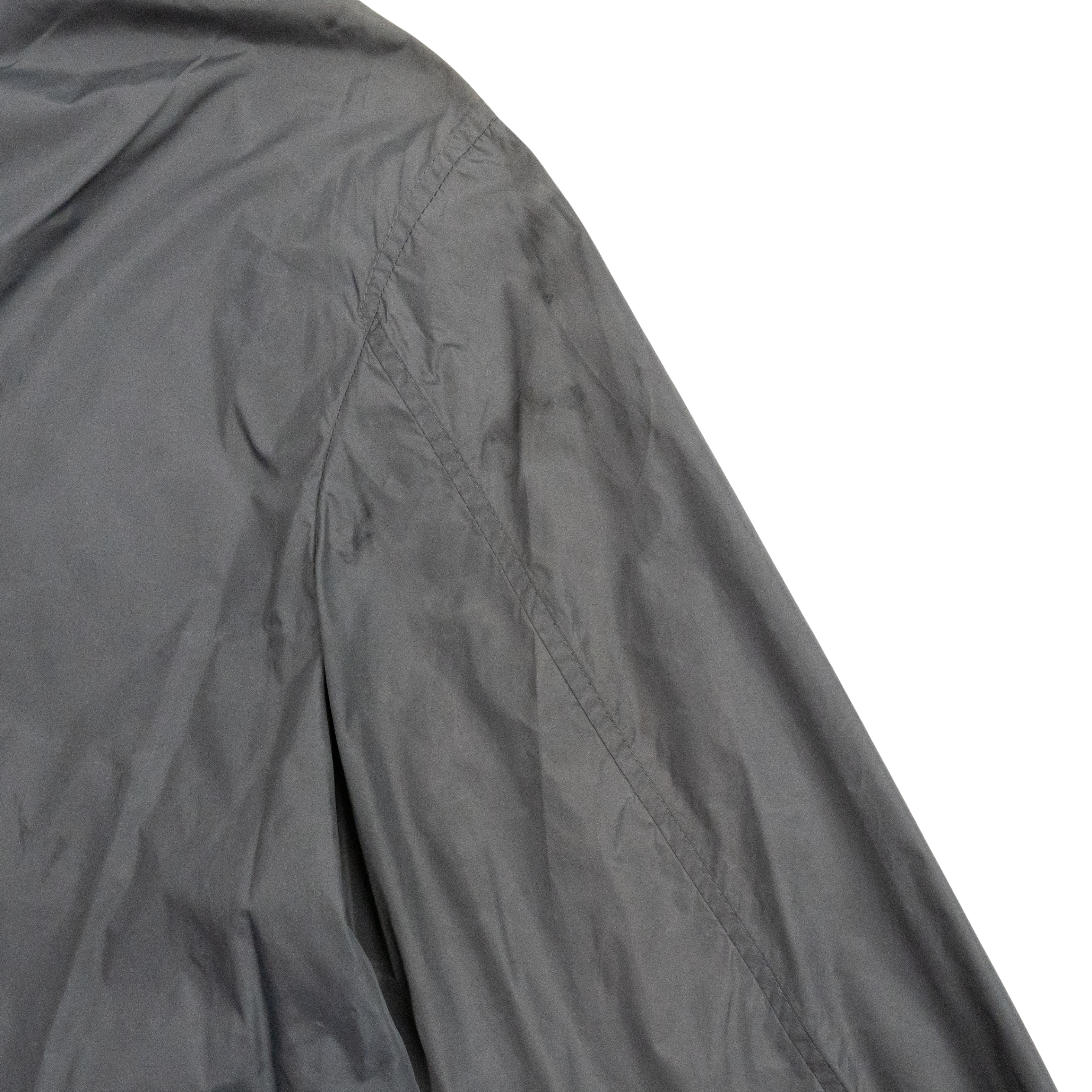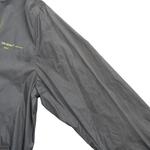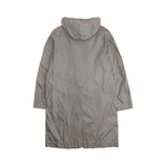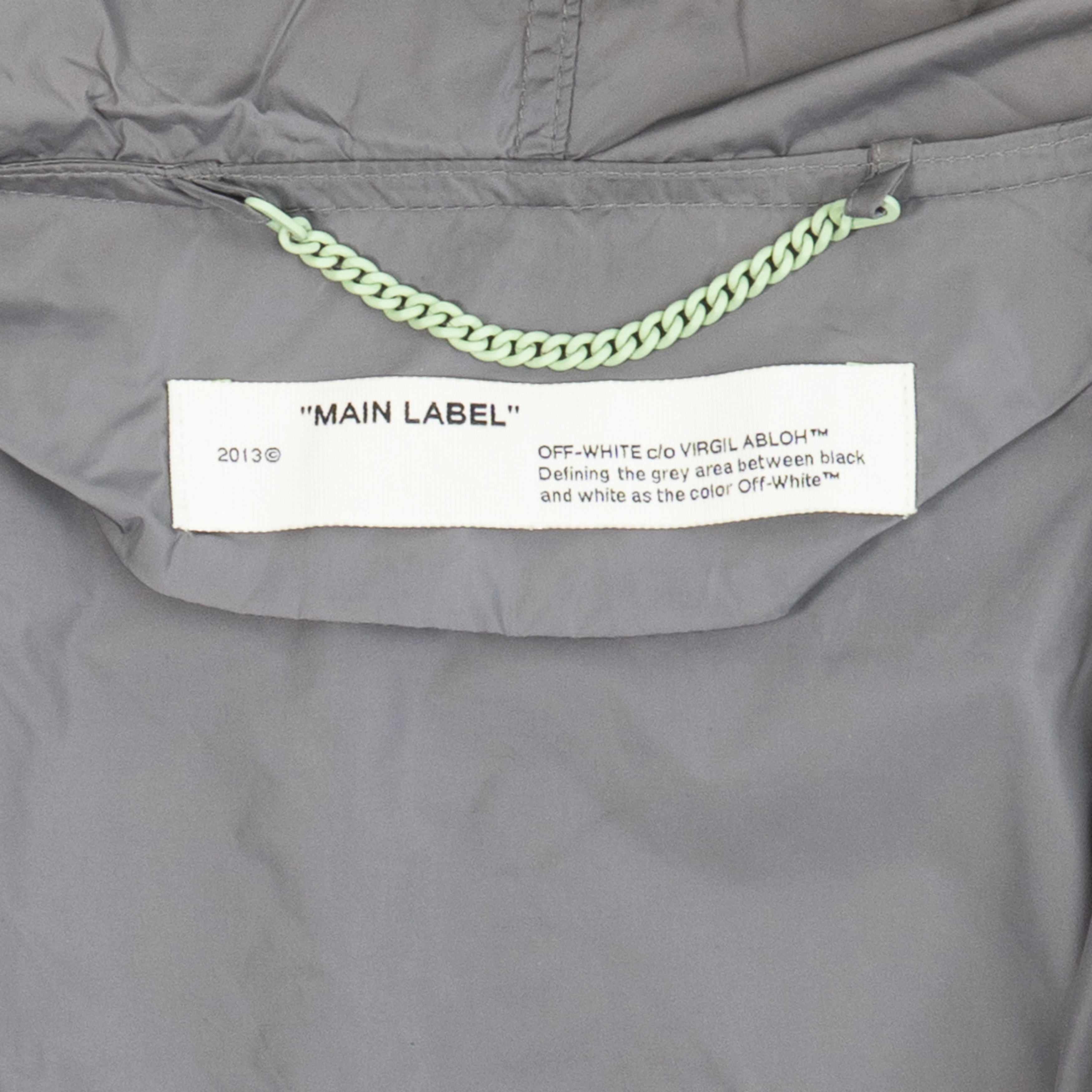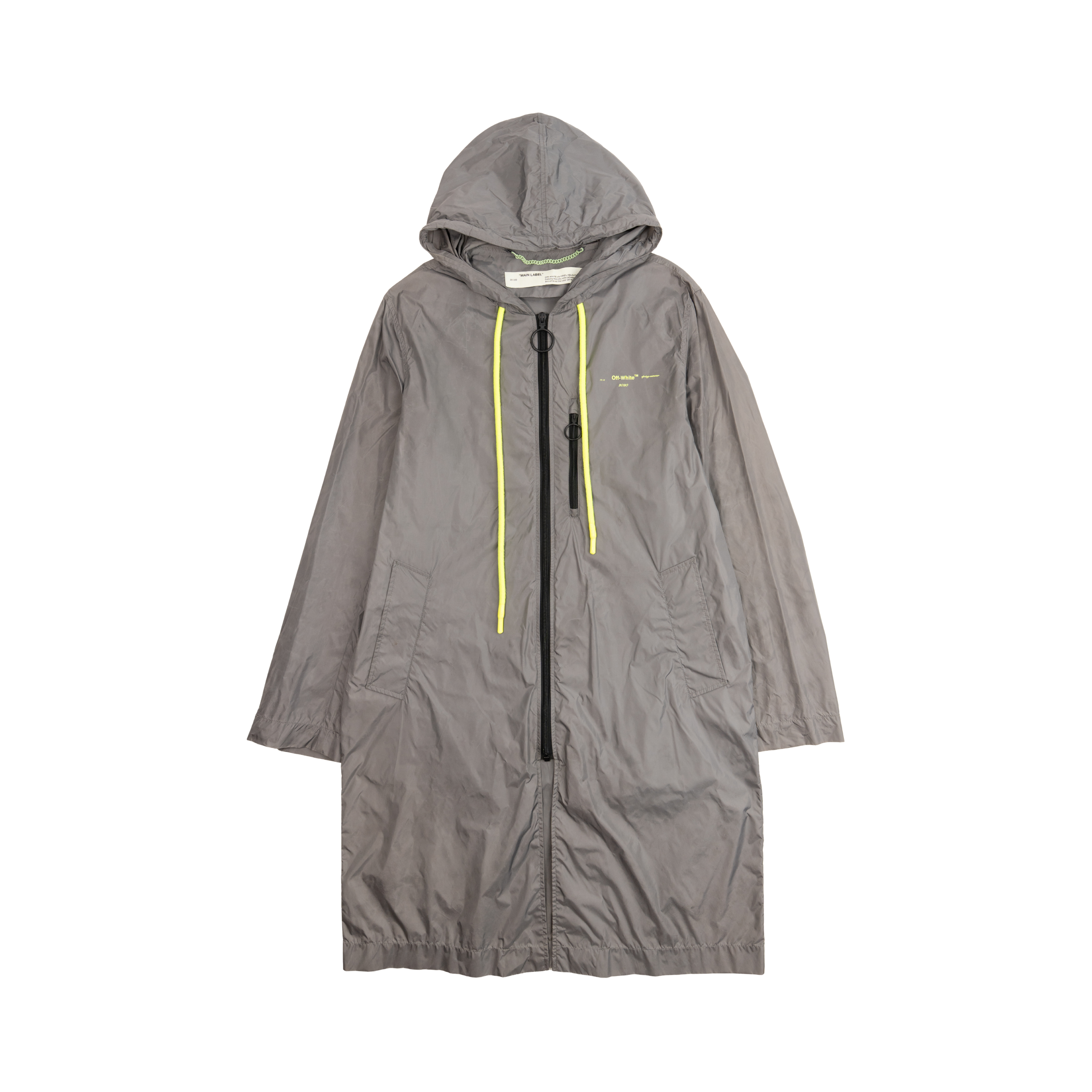 Off-White long hooded raincoat jacket in slate grey with fluorescent yellow details from Spring/Summer 2020 collection. Features fluorescent yellow drawstrings, a fluorescent logo on the chest, slip pockets on the front, black zippers with O-ring zipper pulls down the front of jacket and on chest pocket.