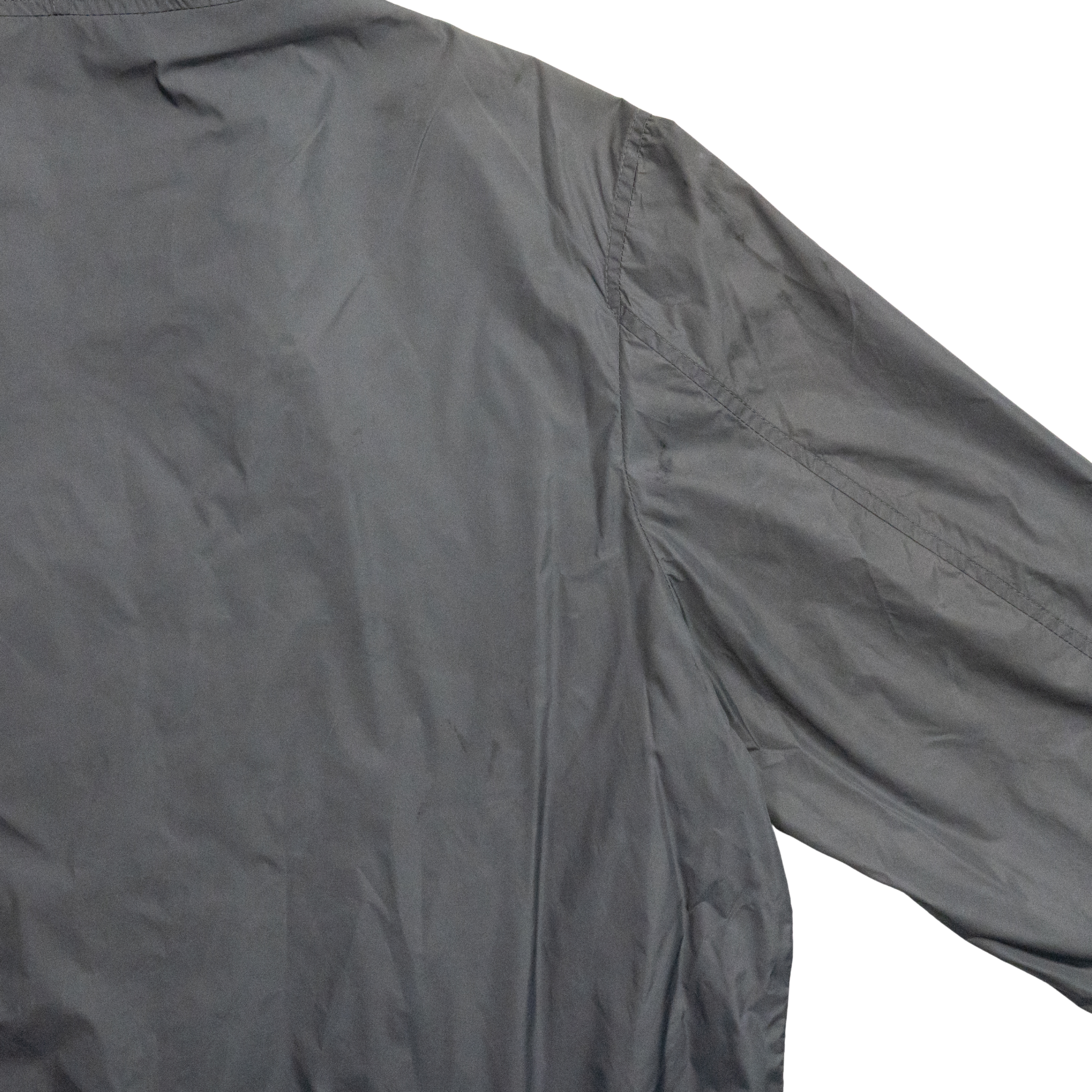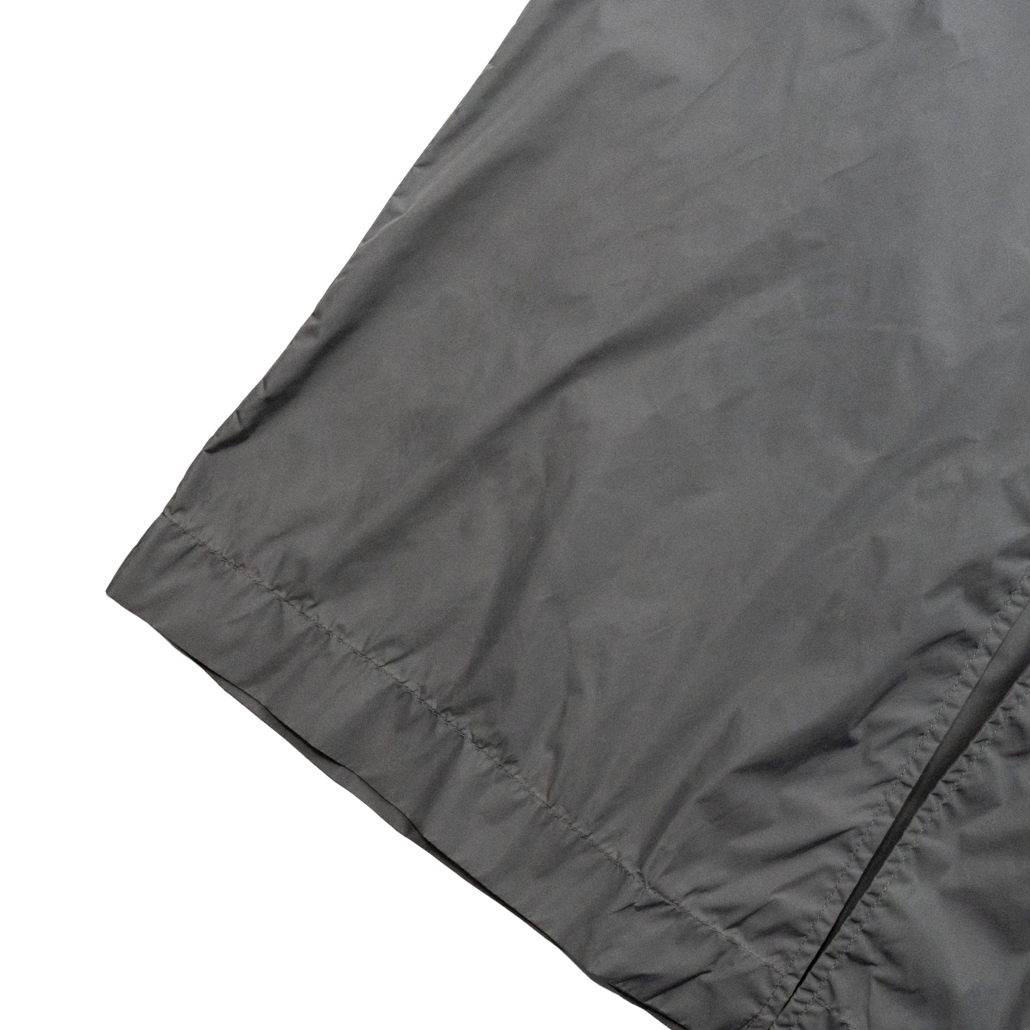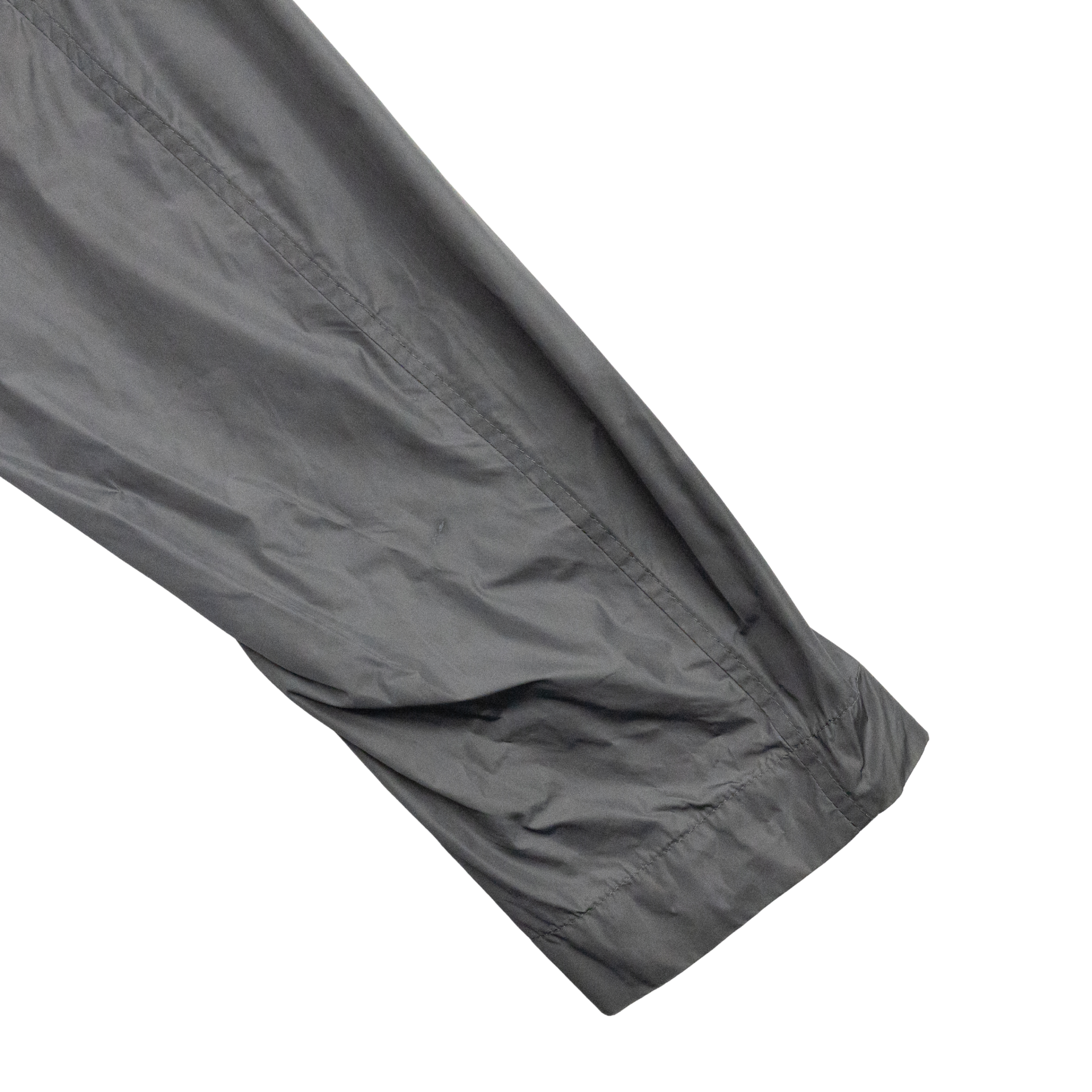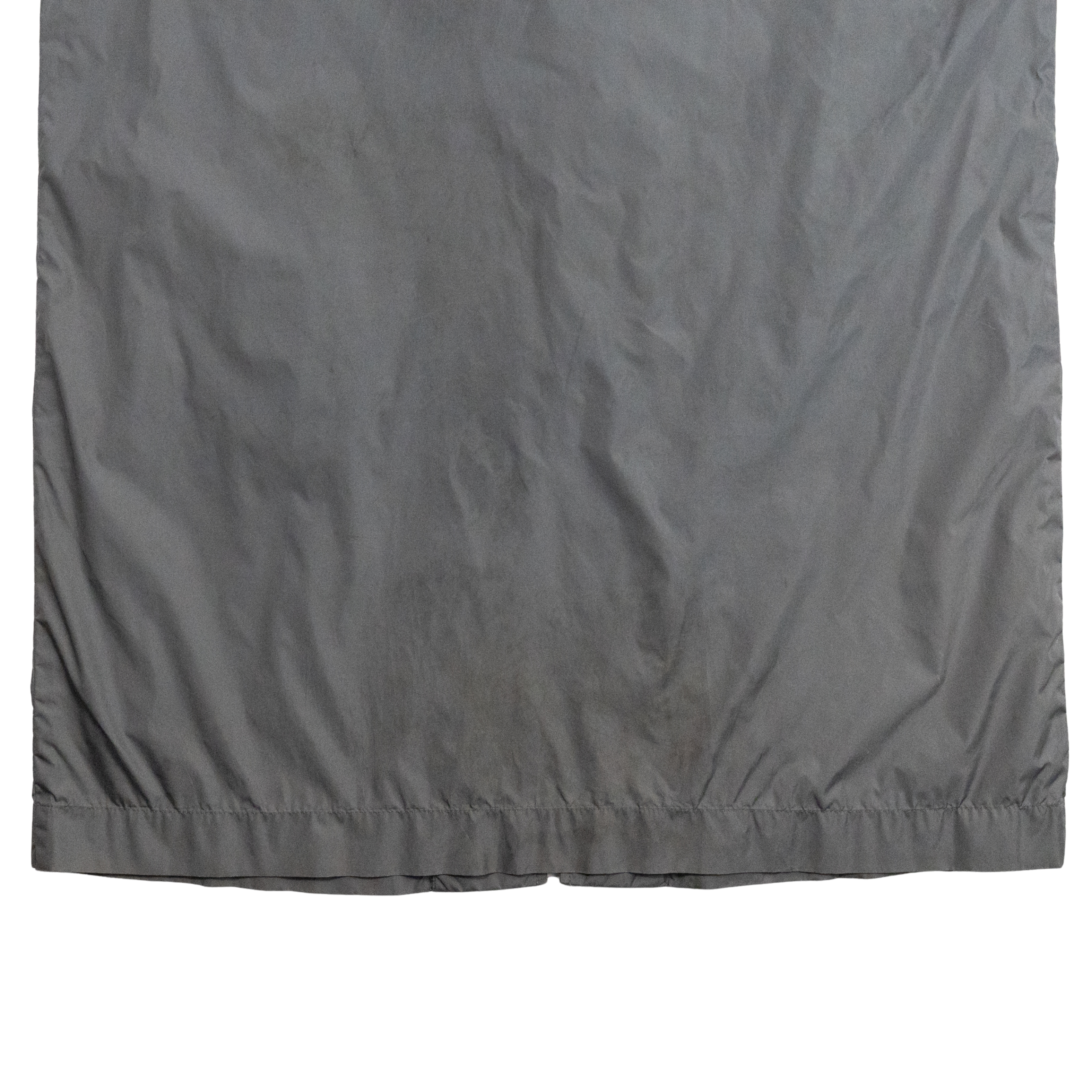 Off-White long hooded raincoat jacket in slate grey with fluorescent yellow details from Spring/Summer 2020 collection. Features fluorescent yellow drawstrings, a fluorescent logo on the chest, slip pockets on the front, black zippers with O-ring zipper pulls down the front of jacket and on chest pocket.
