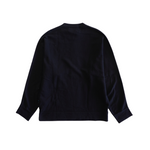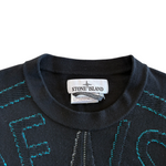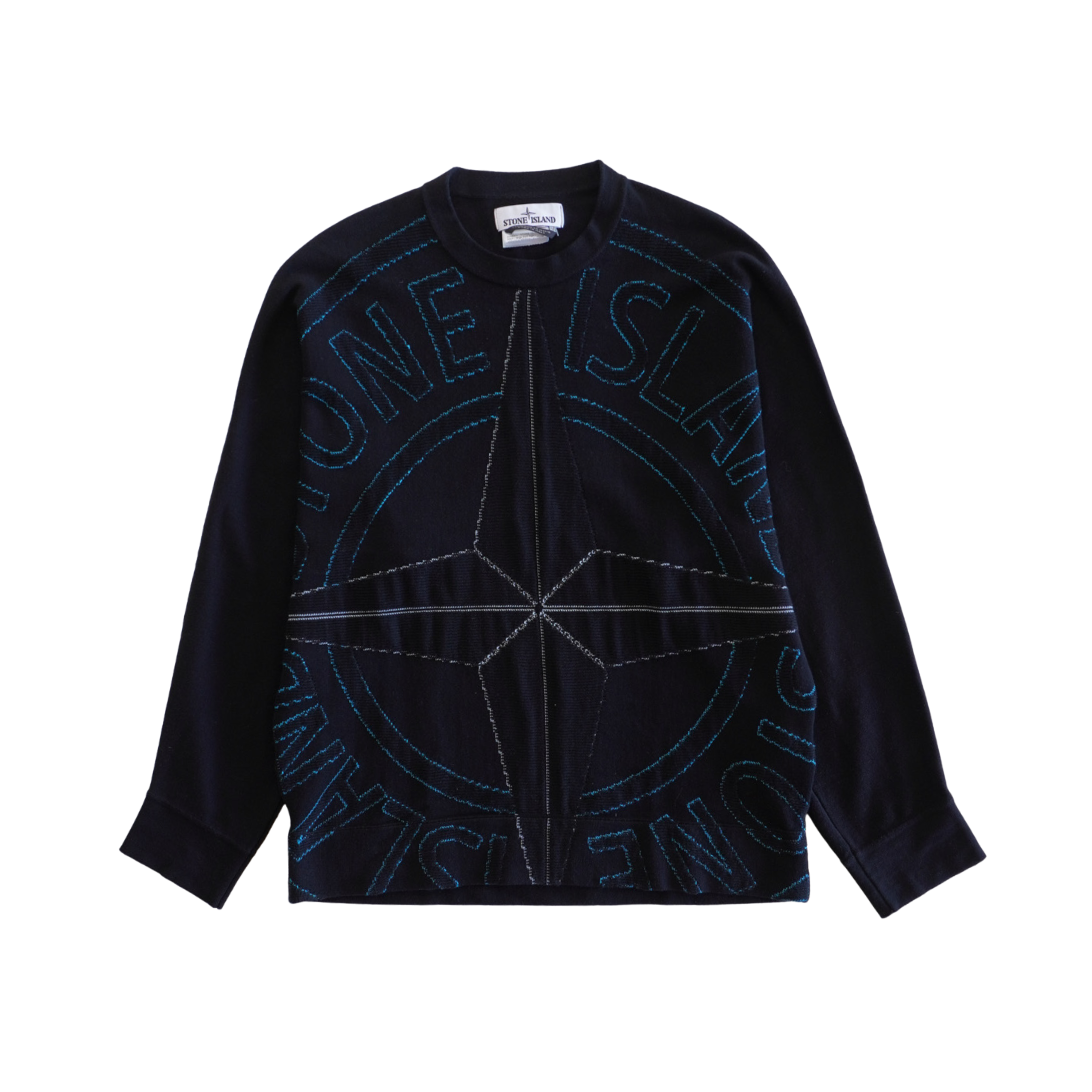 Stone Island knit sweater in black cotton with a large reverse stitched blue and white logo graphic on the front.