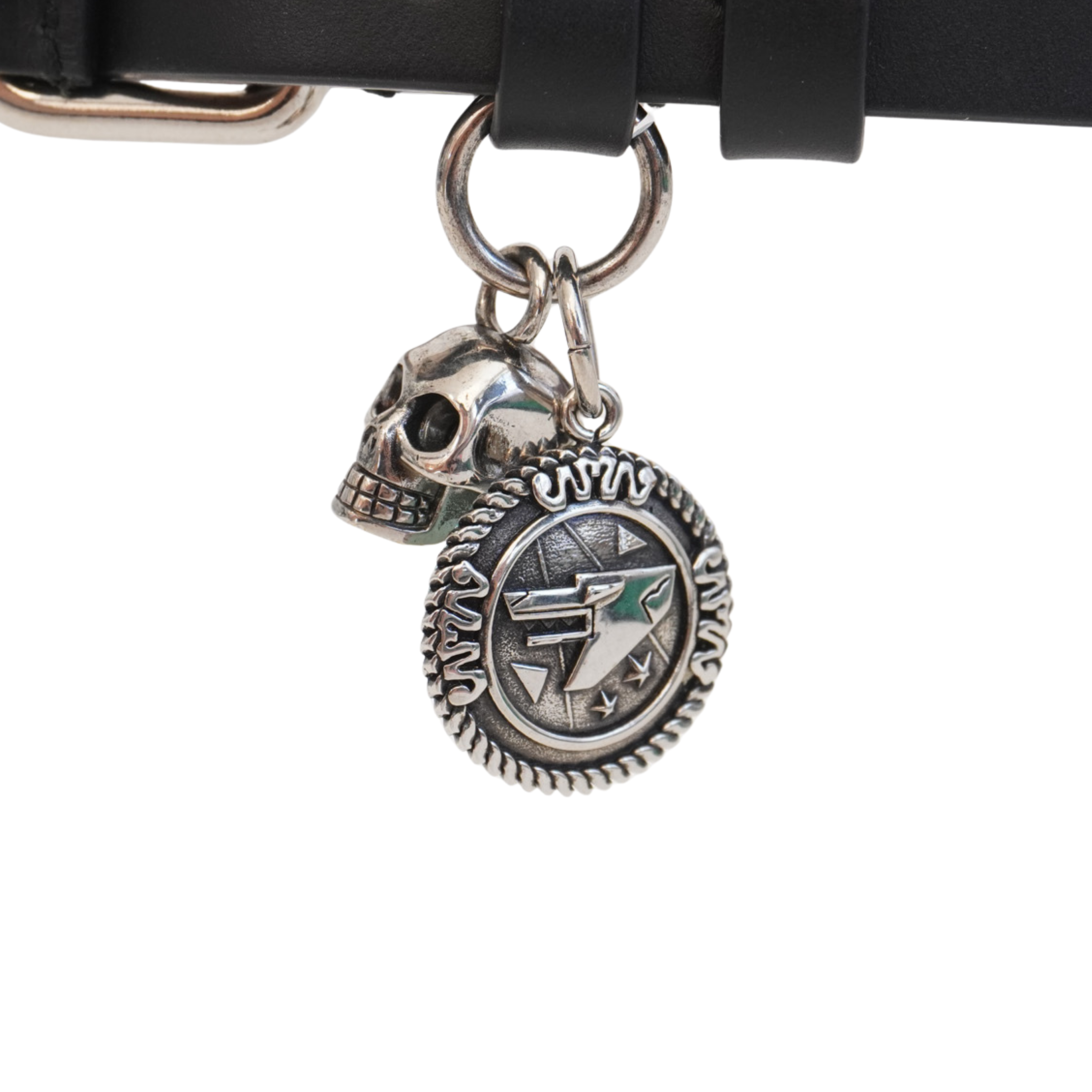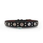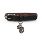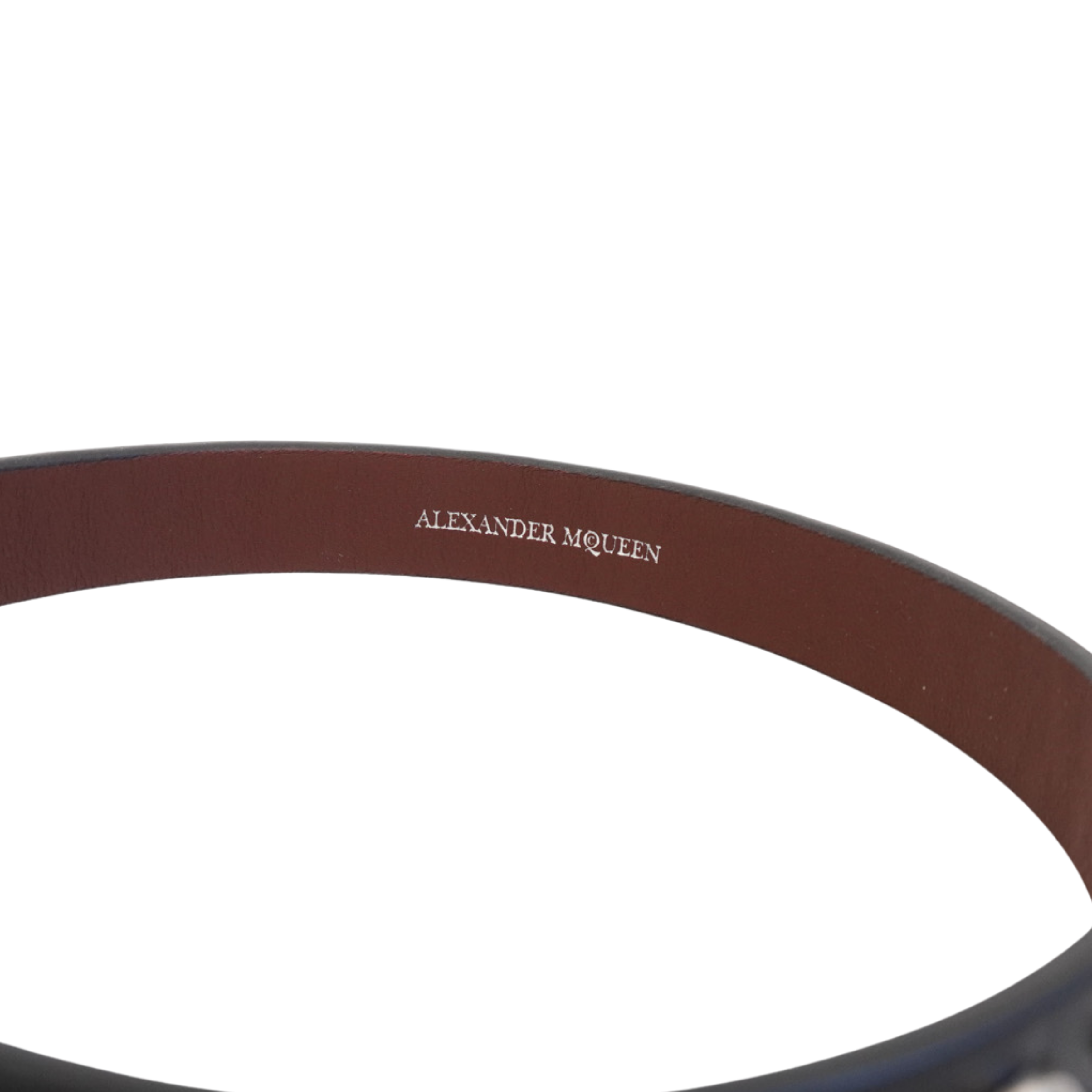 Alexander McQueen collar style choker necklace in black leather with silver studs throughout. Features adjustable buckle closure with small silver skull charm and round pendant charm hanging off.