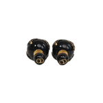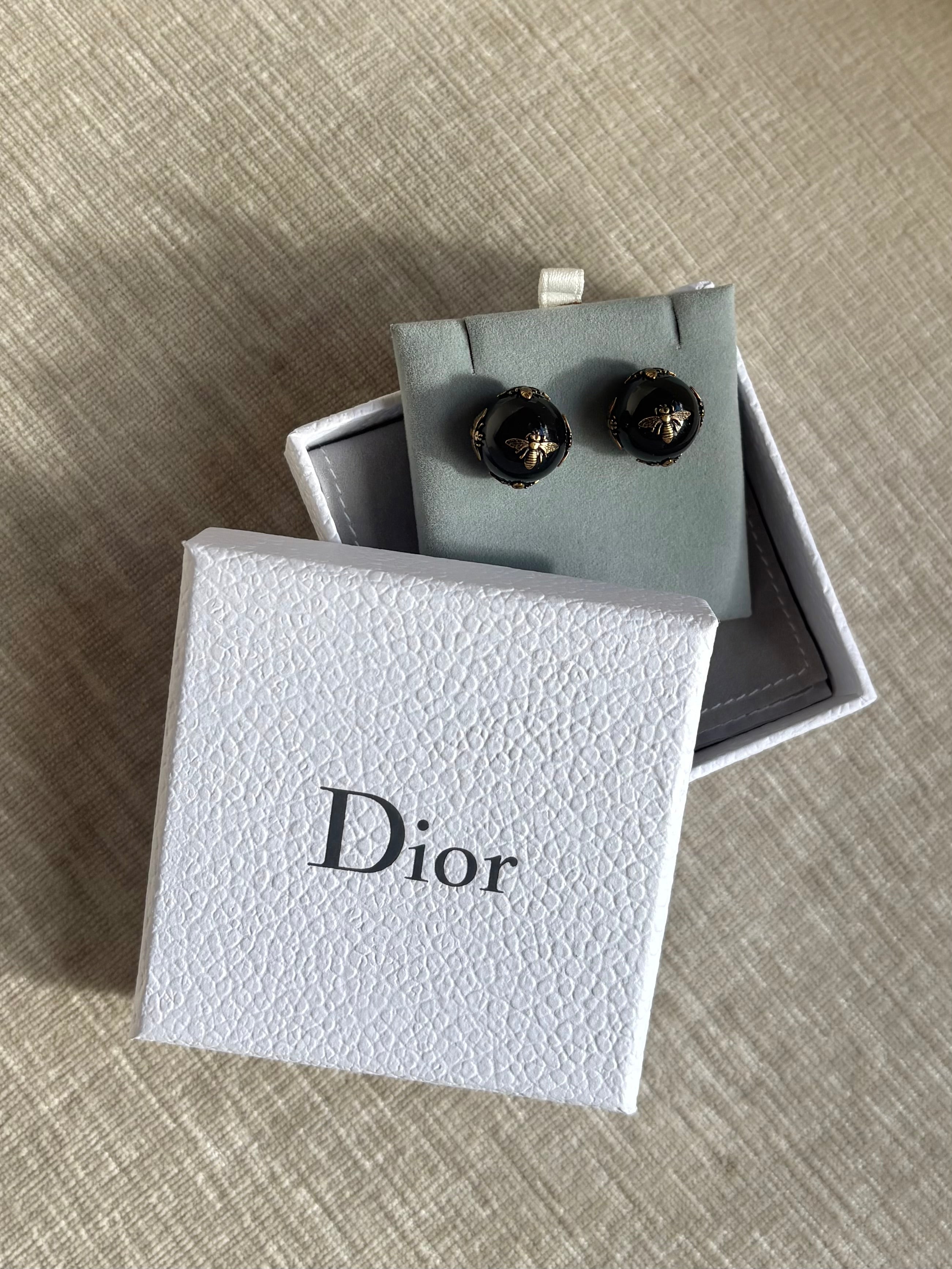 Christian Dior 'Tribales' stud earrings in black with brushed gold bees and a 'CD' logo on the back.