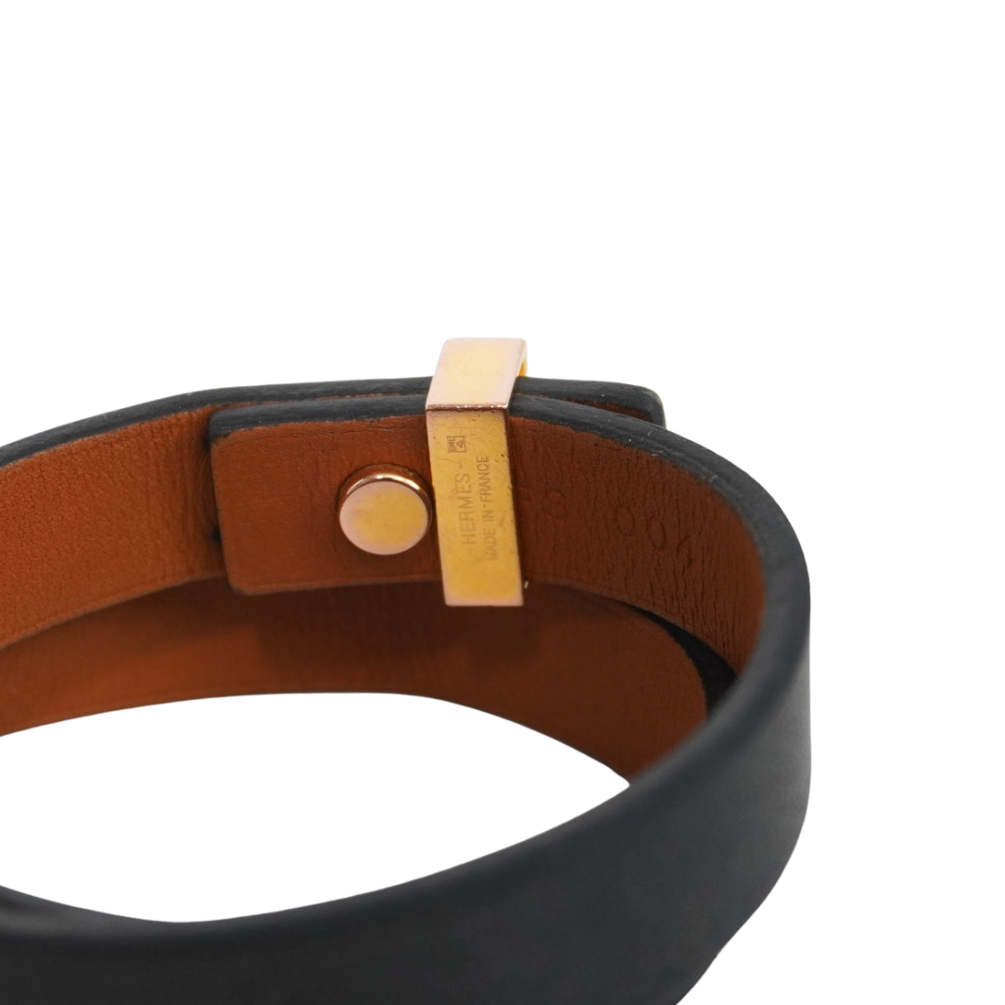 Hermes 'Mini Dog Double Tour' wrap bracelet in black leather featuring a 18K yellow gold-plated adjustable clasp.