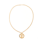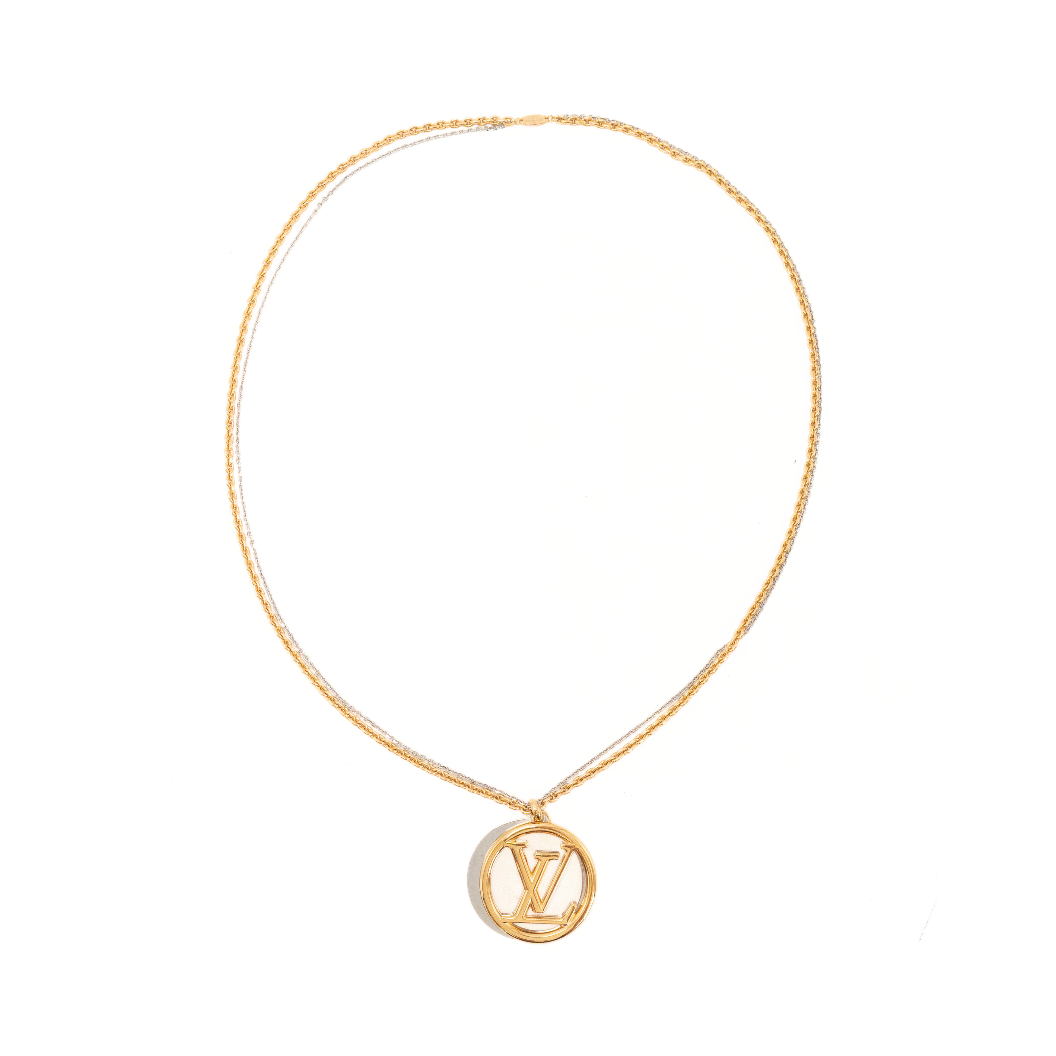 Louis Vuitton 'Stellar' necklace in gold finished 'LV' circle pendant suspended from a double chain with a silver backing and second chain.
