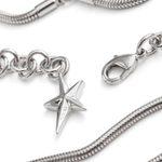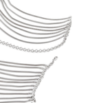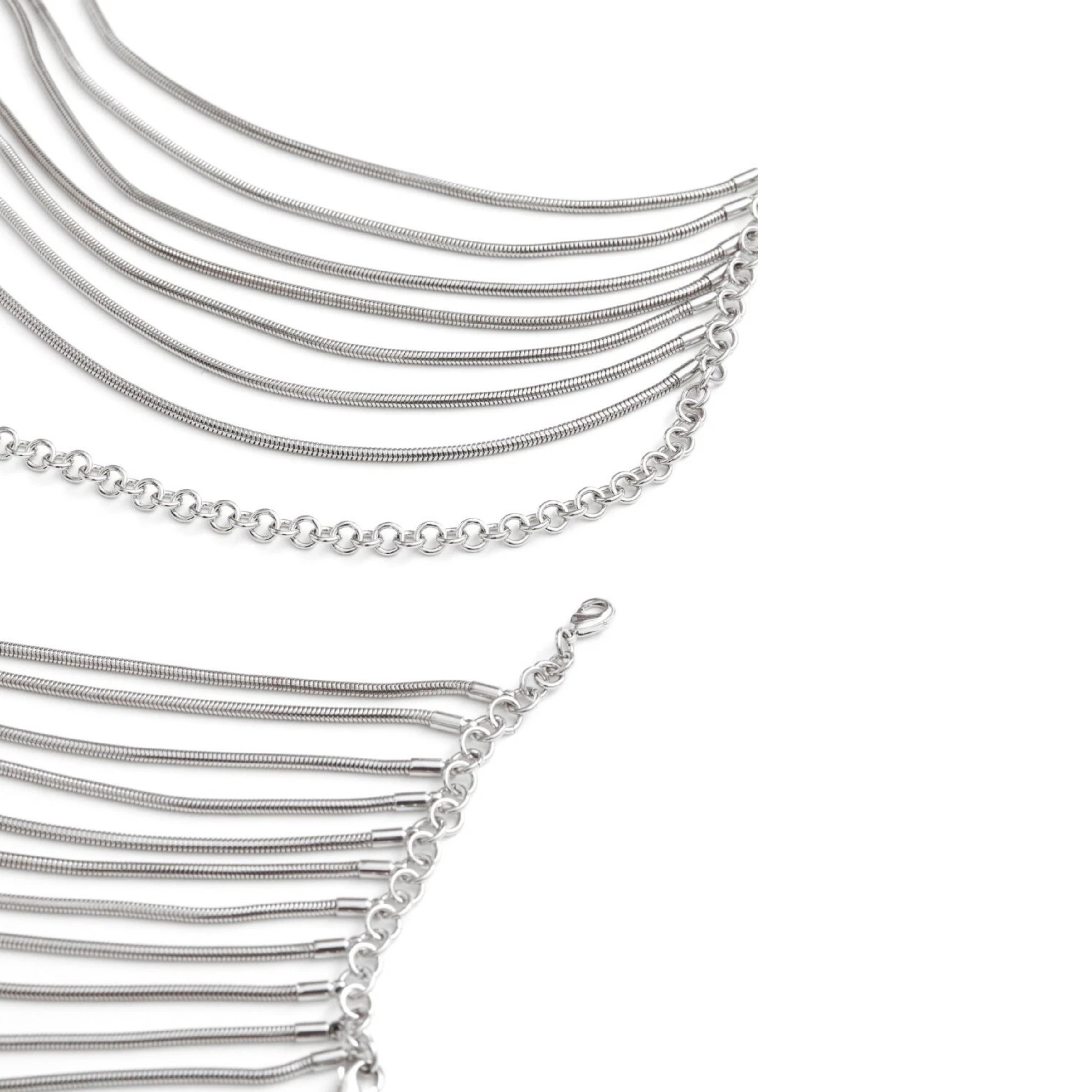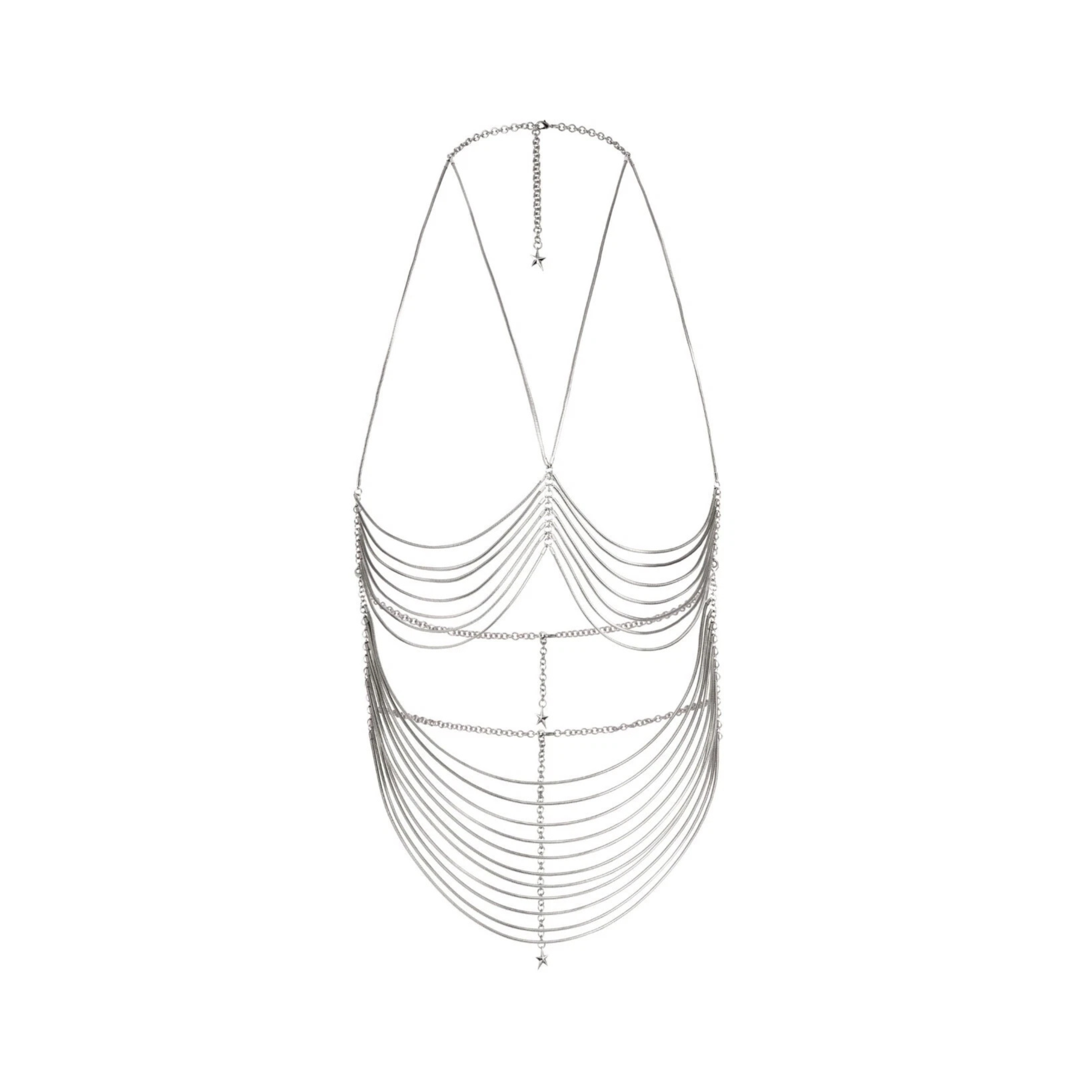 Mugler x H&M body chain in silver toned brass with multiple snake harness chains and back clasp closures with star pendant charms.