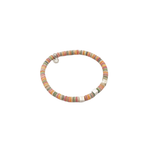 Tateossian elastic, beaded bracelet with multicolour thin disc beads all around. Features three square silver beads, one round silver bead, and a small silver logo tag.