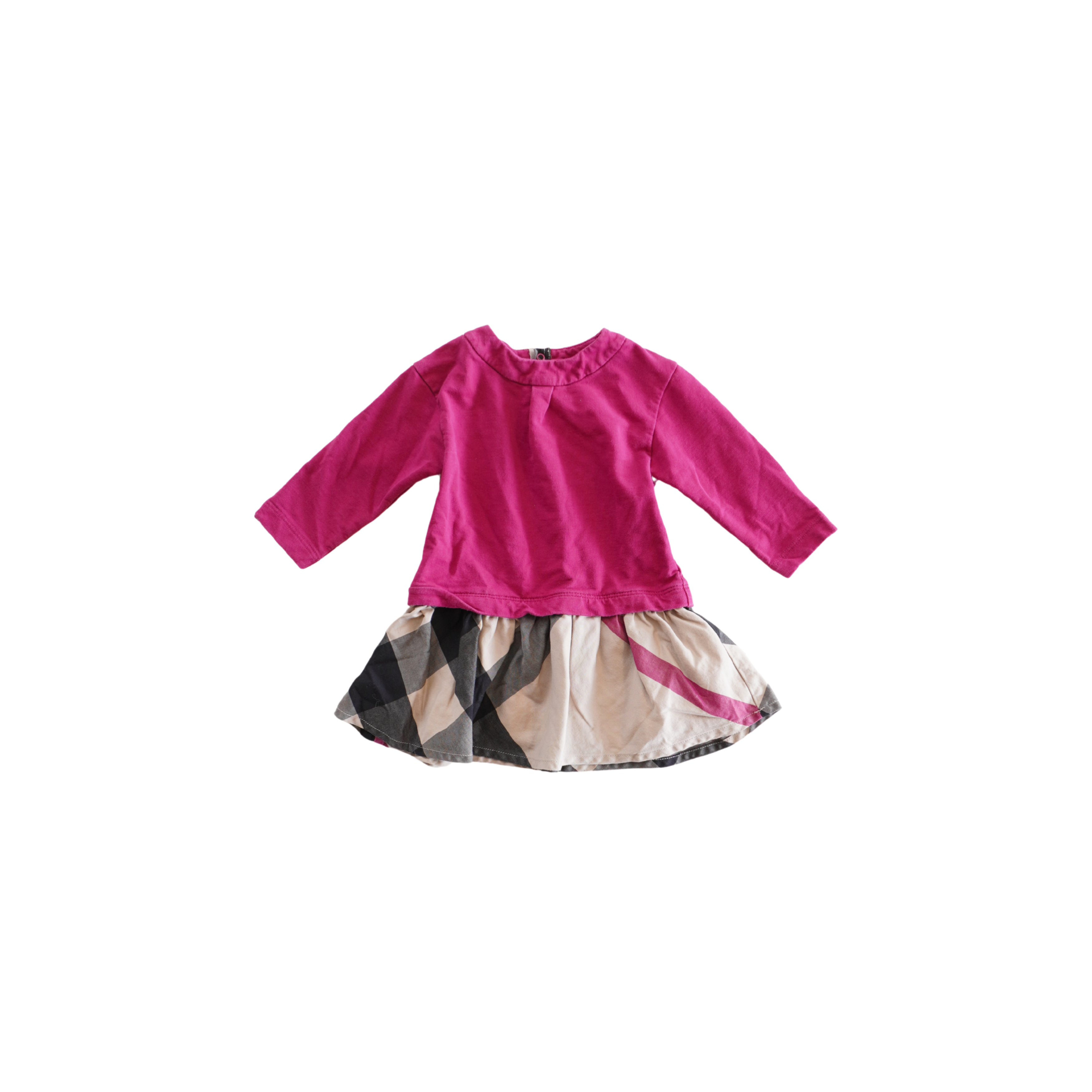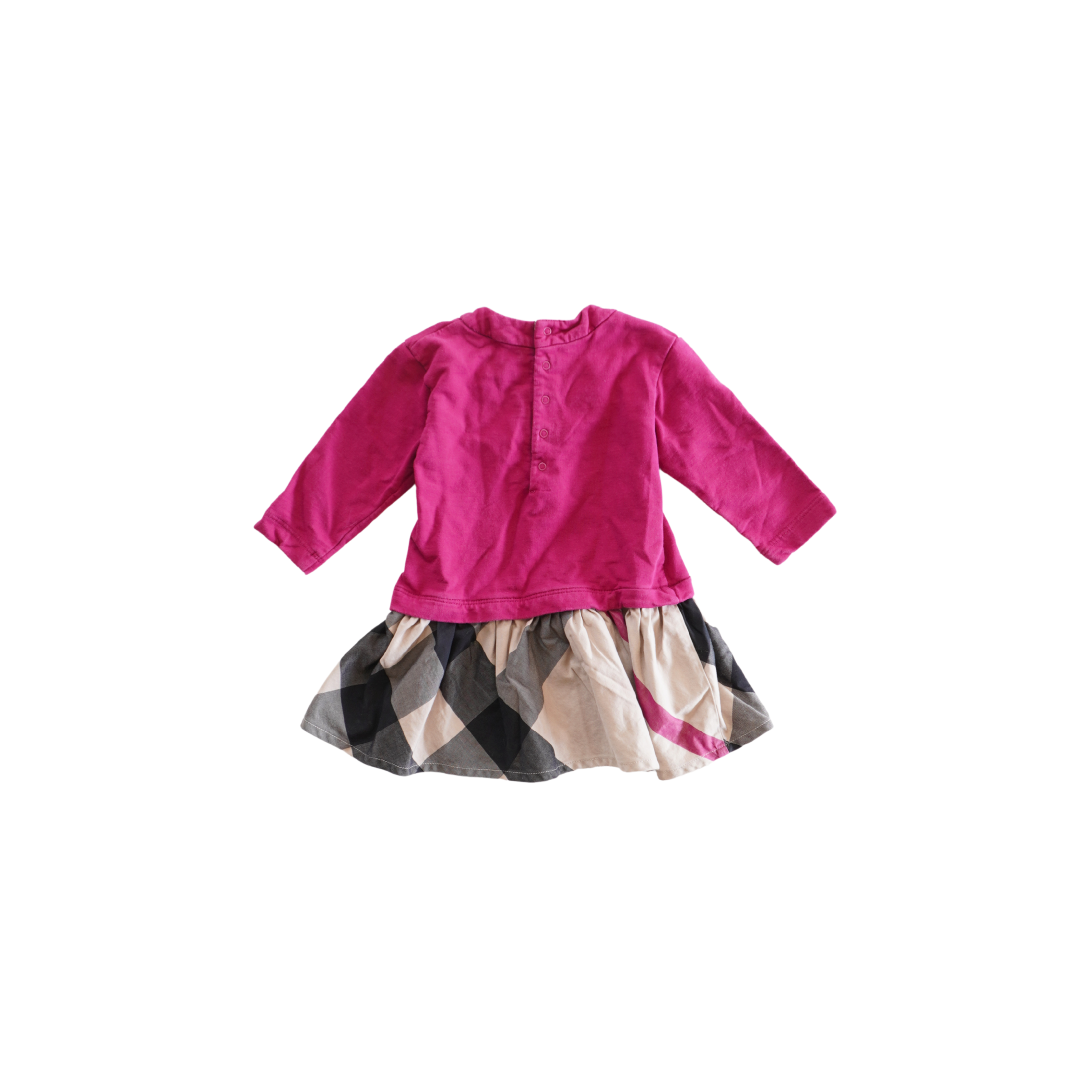 Burberry long sleeve sweater dress with magenta pink crewneck top and ruffled giant novacheck skirt.