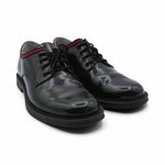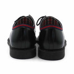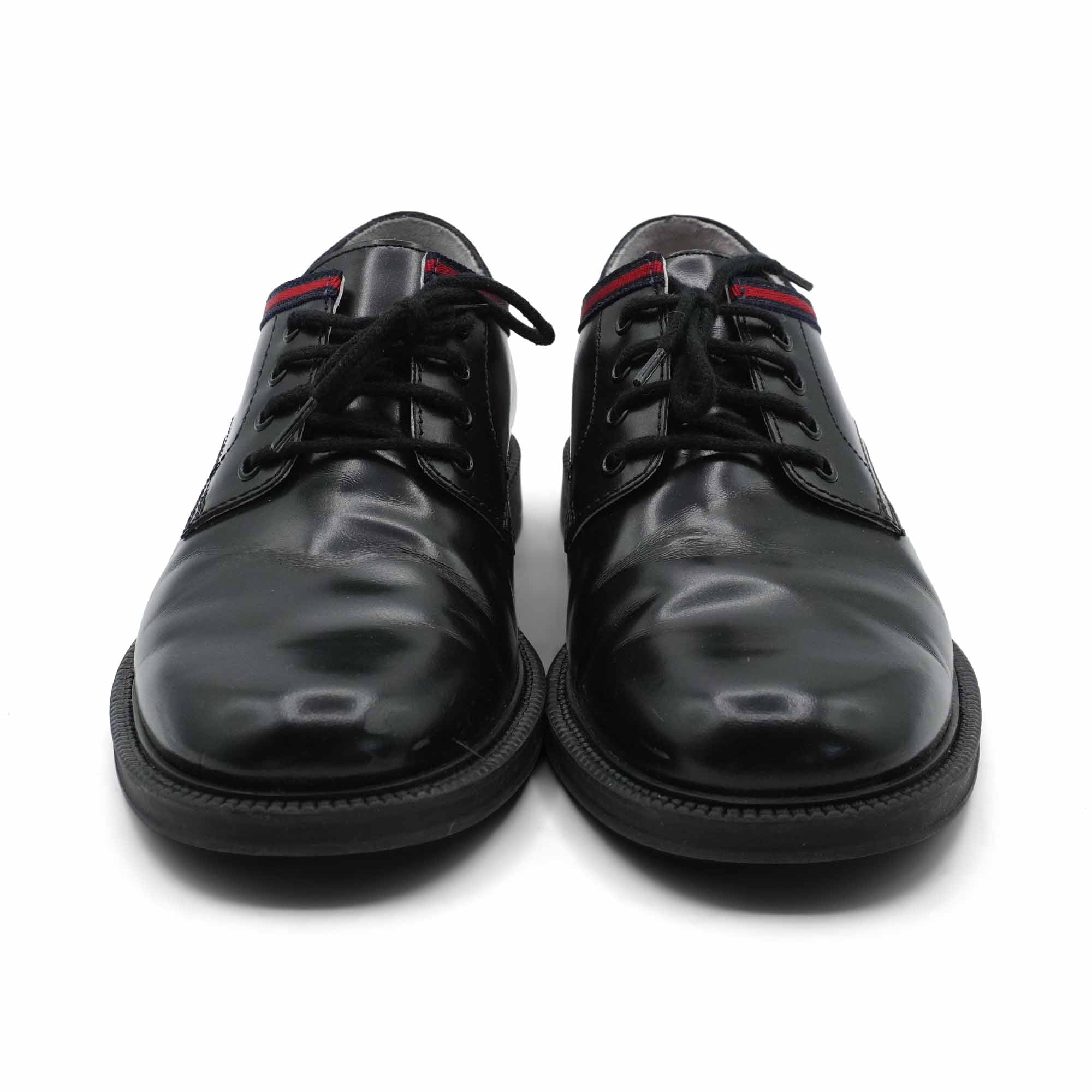 Gucci 'Oxford' dress shoes in black glossy leather with red and navy racing strip webbing detail.