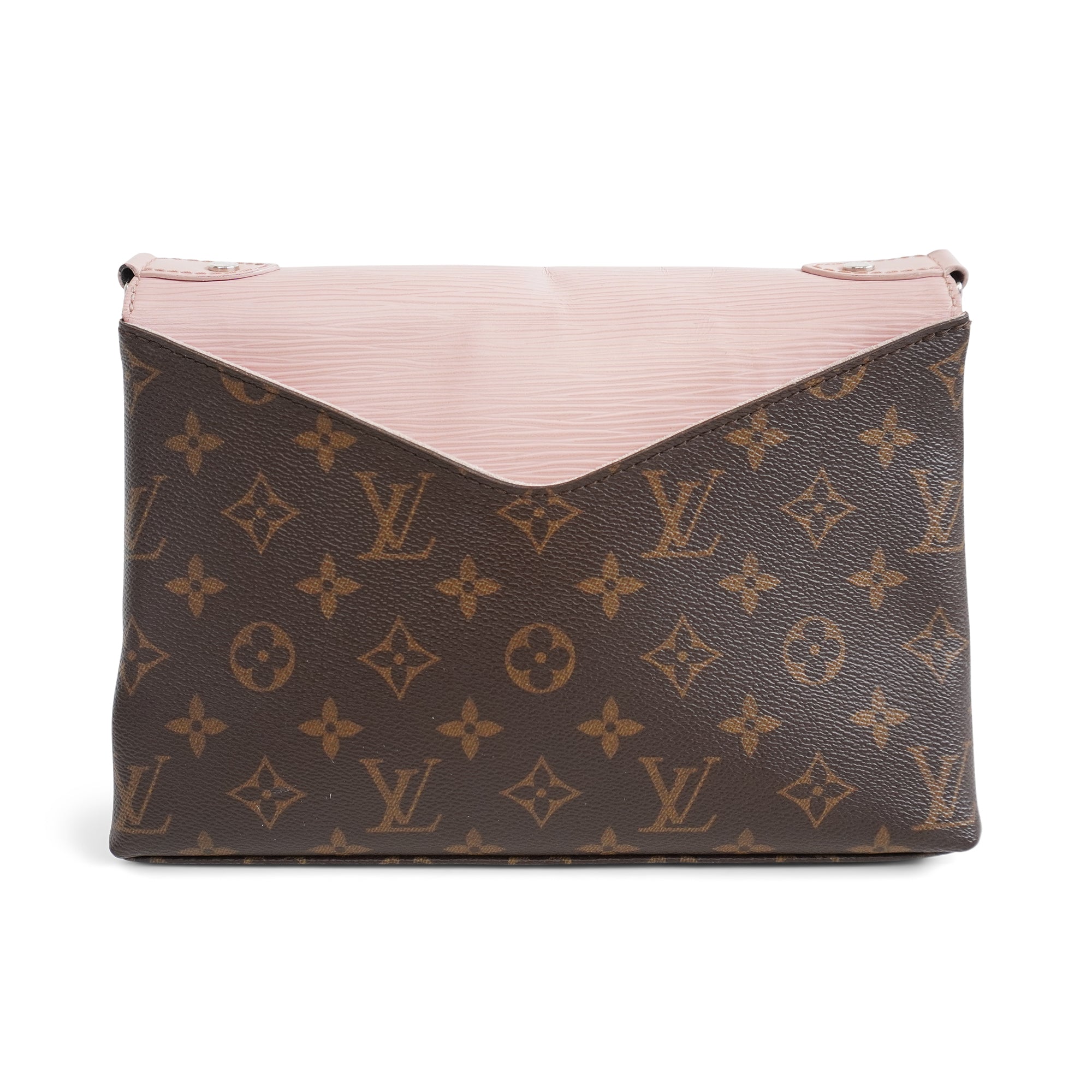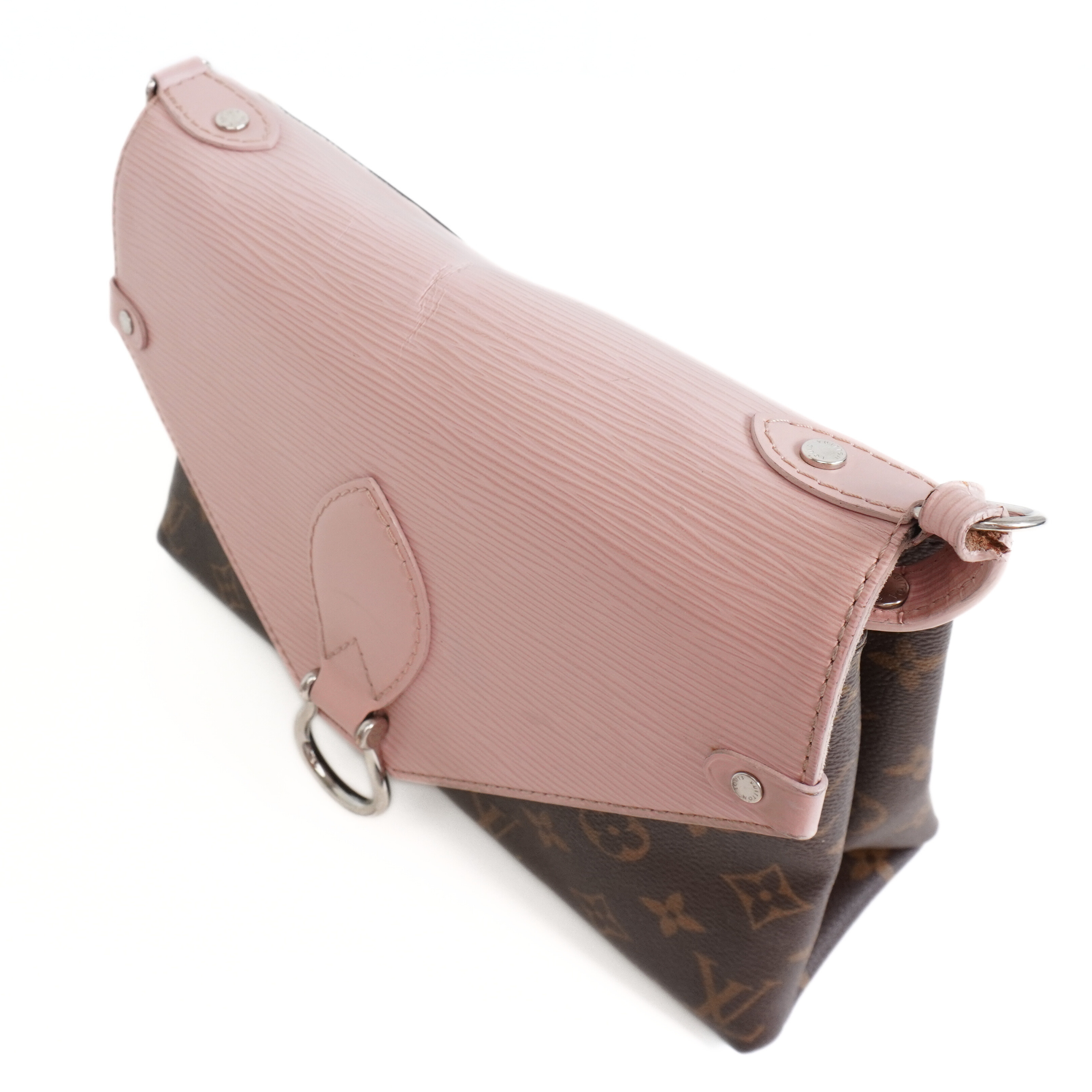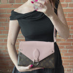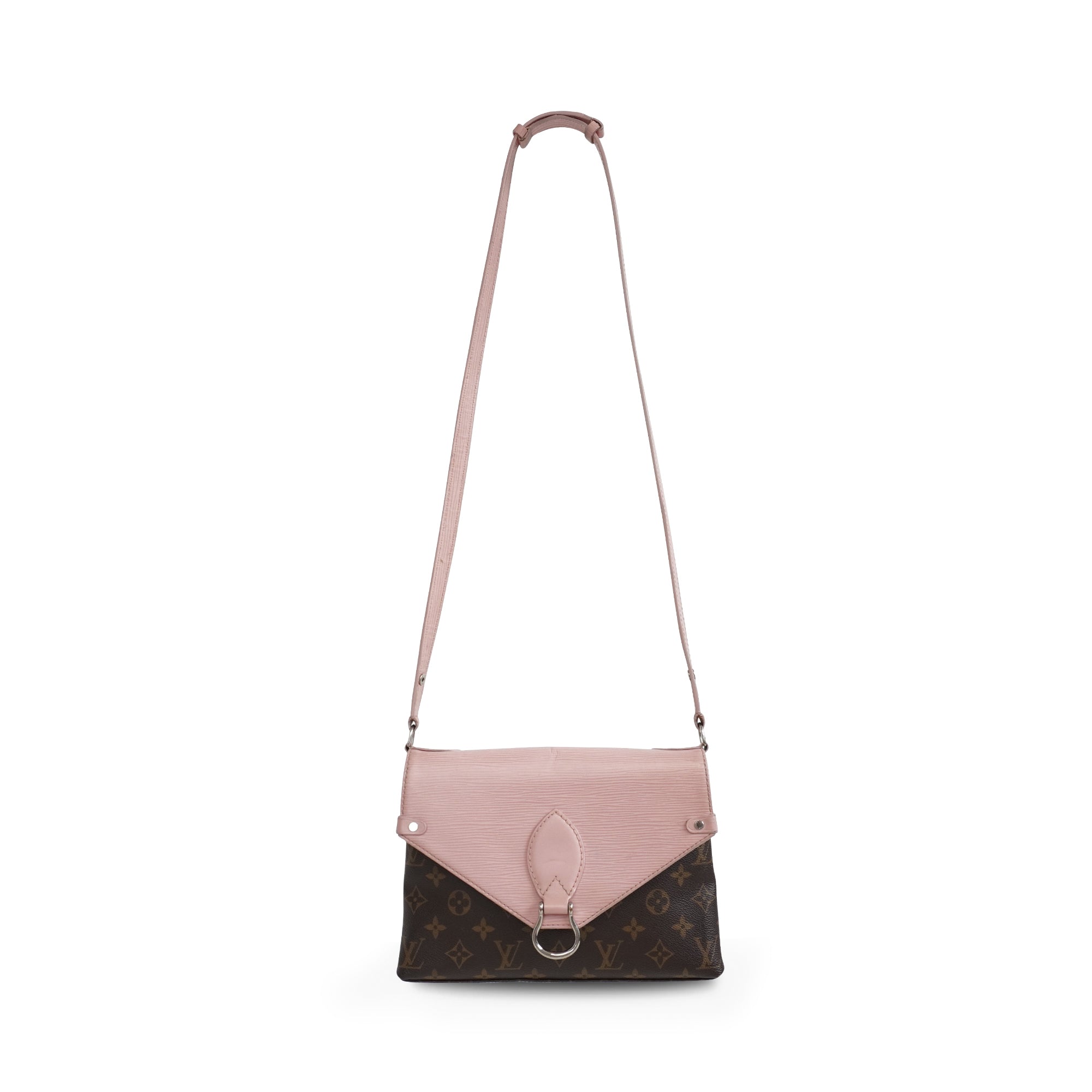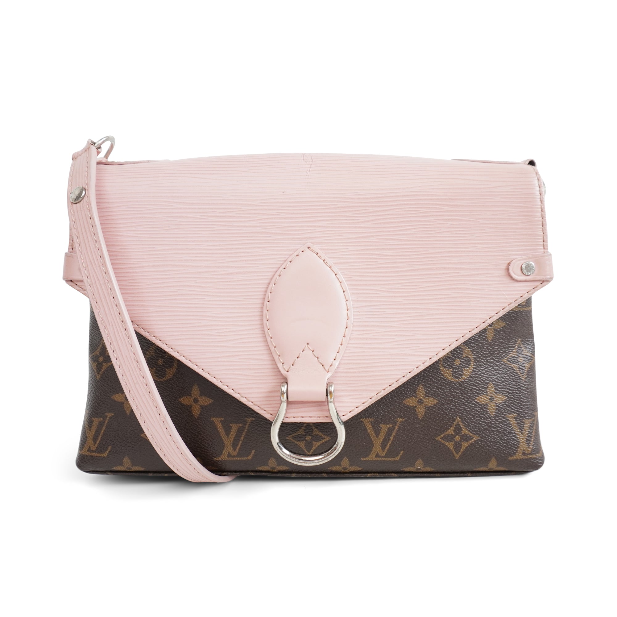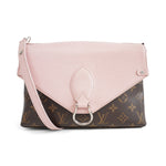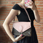 Louis Vuitton 'Epi Saint Michel' shoulder bag in brown monogram print coated canvas with a light pink epi-leather front flap and adjustable flat leather strap that allow cross-body styling. Features a front magnetic snap closure and back slip pocket.