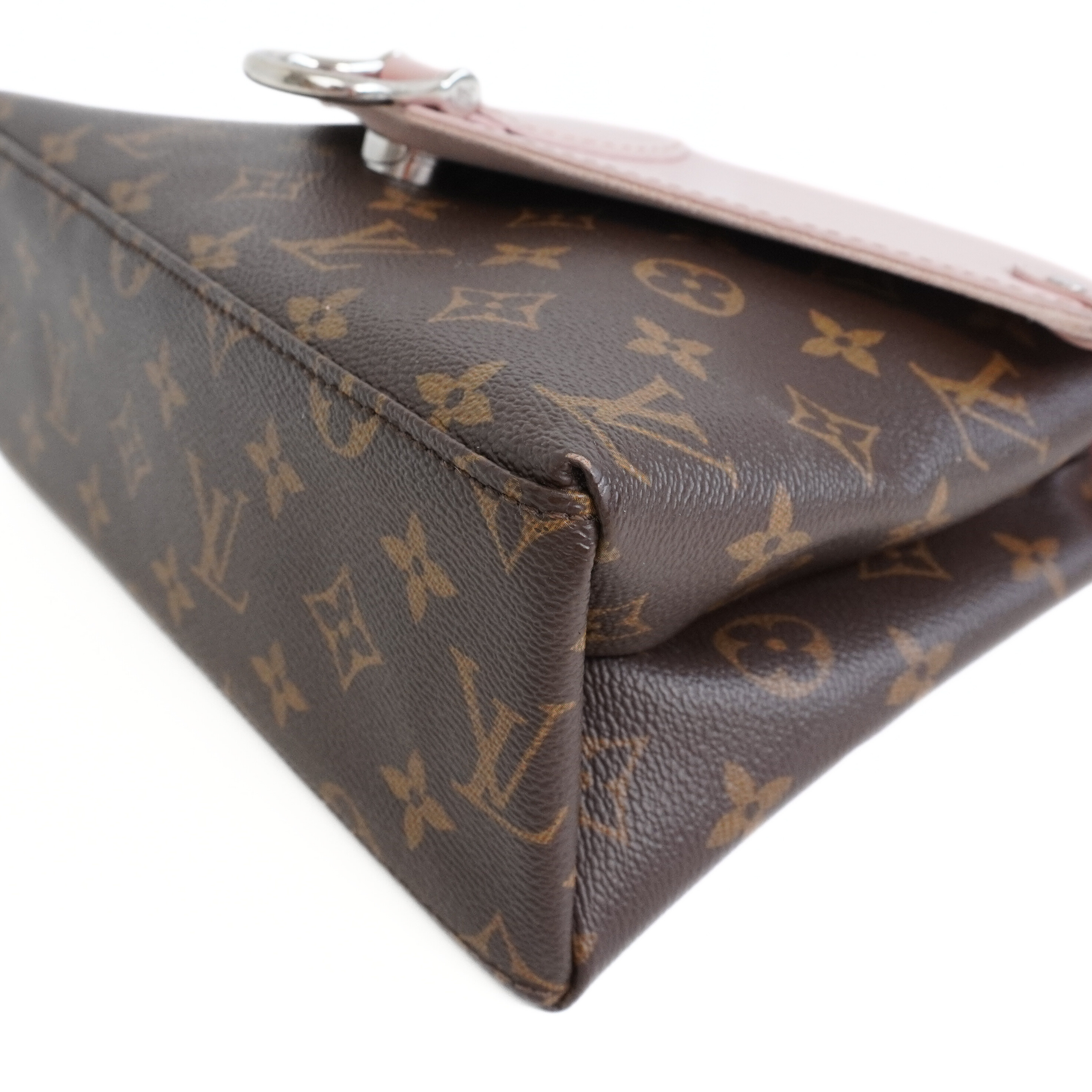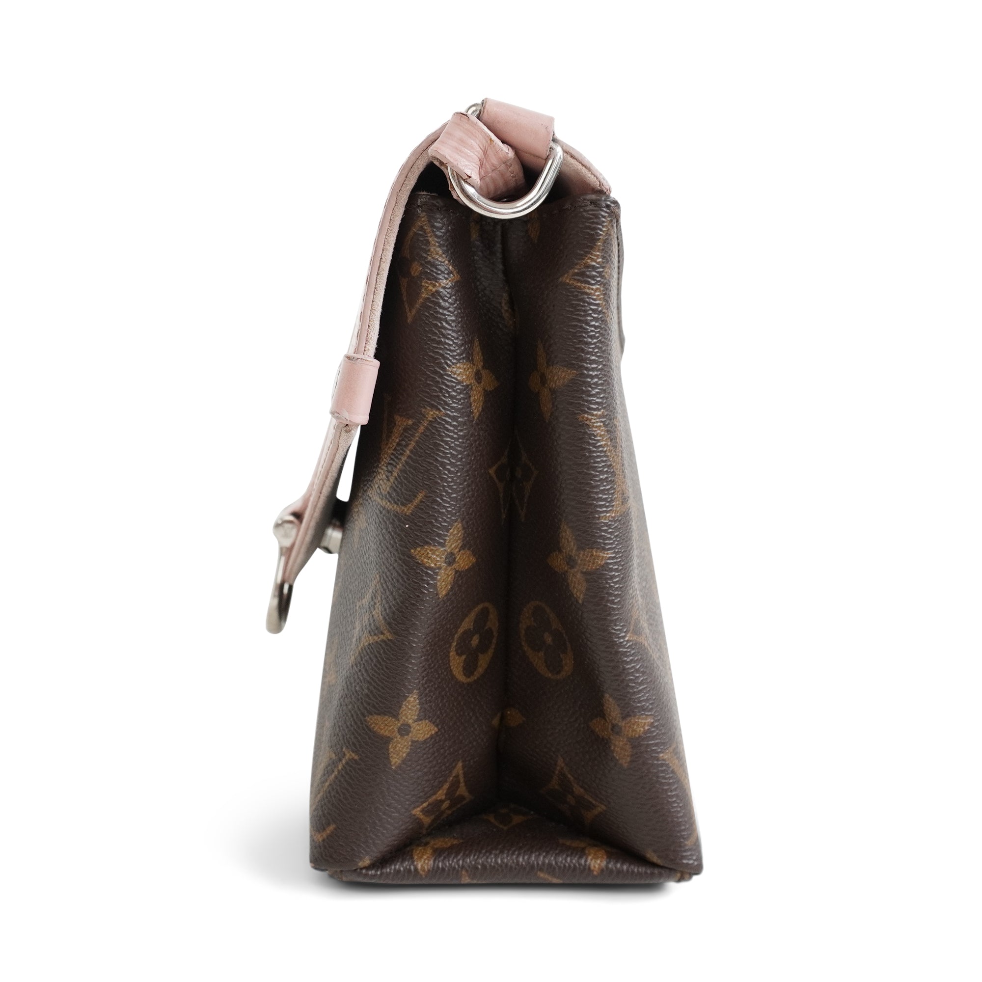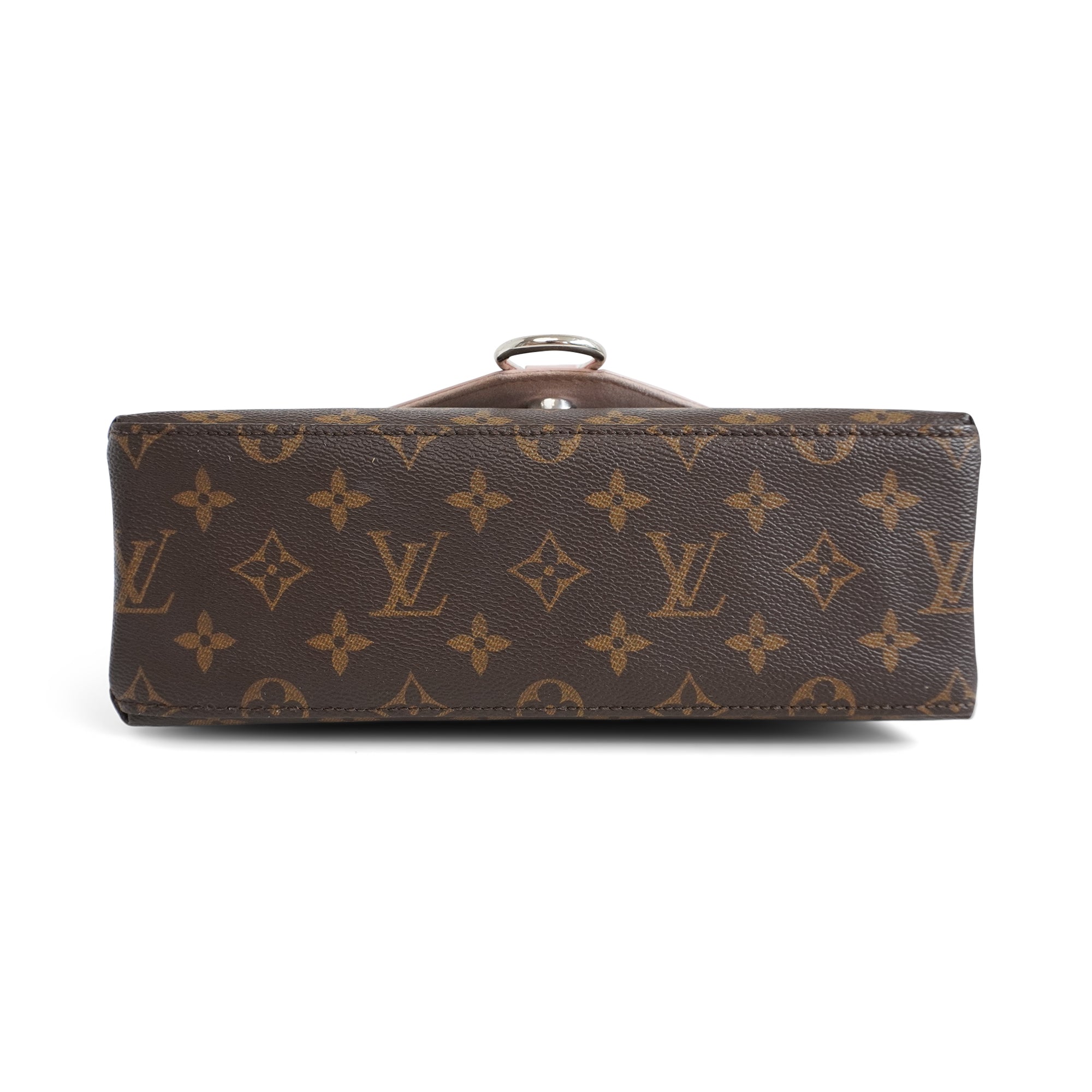 Louis Vuitton 'Epi Saint Michel' shoulder bag in brown monogram print coated canvas with a light pink epi-leather front flap and adjustable flat leather strap that allow cross-body styling. Features a front magnetic snap closure and back slip pocket.