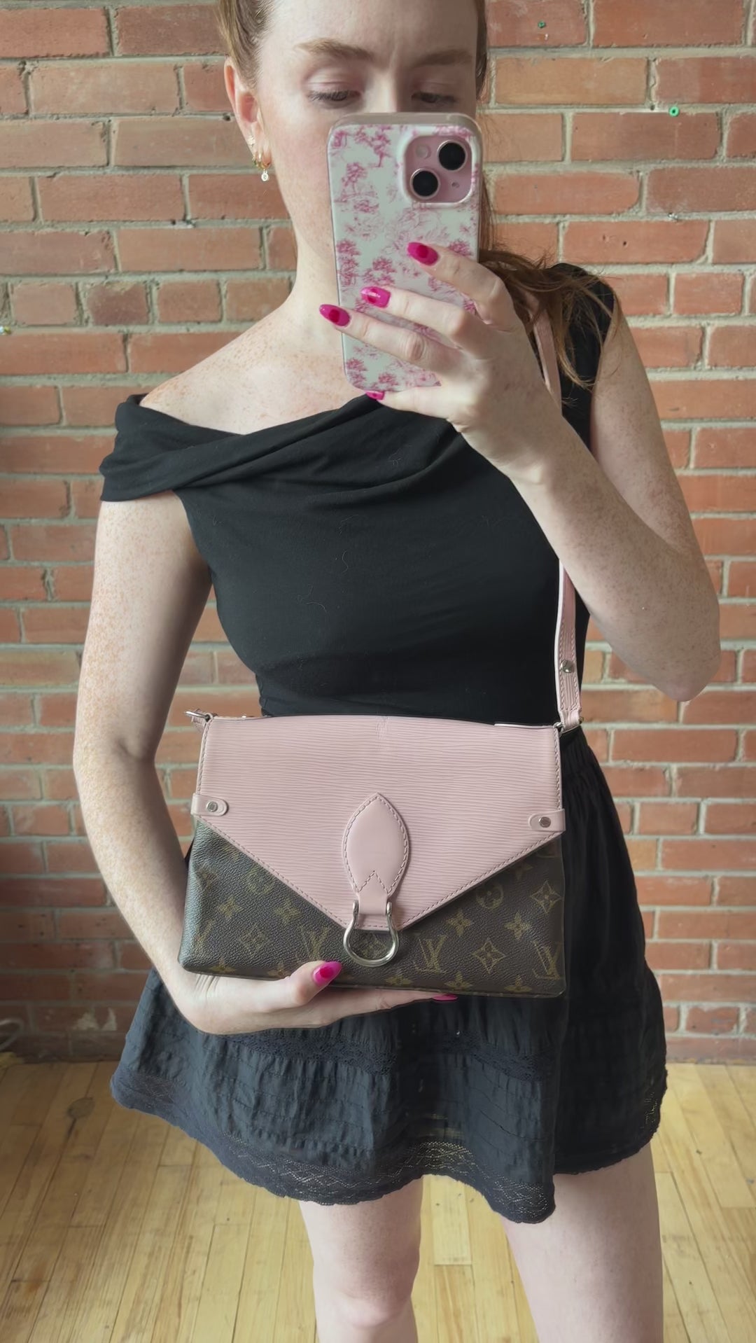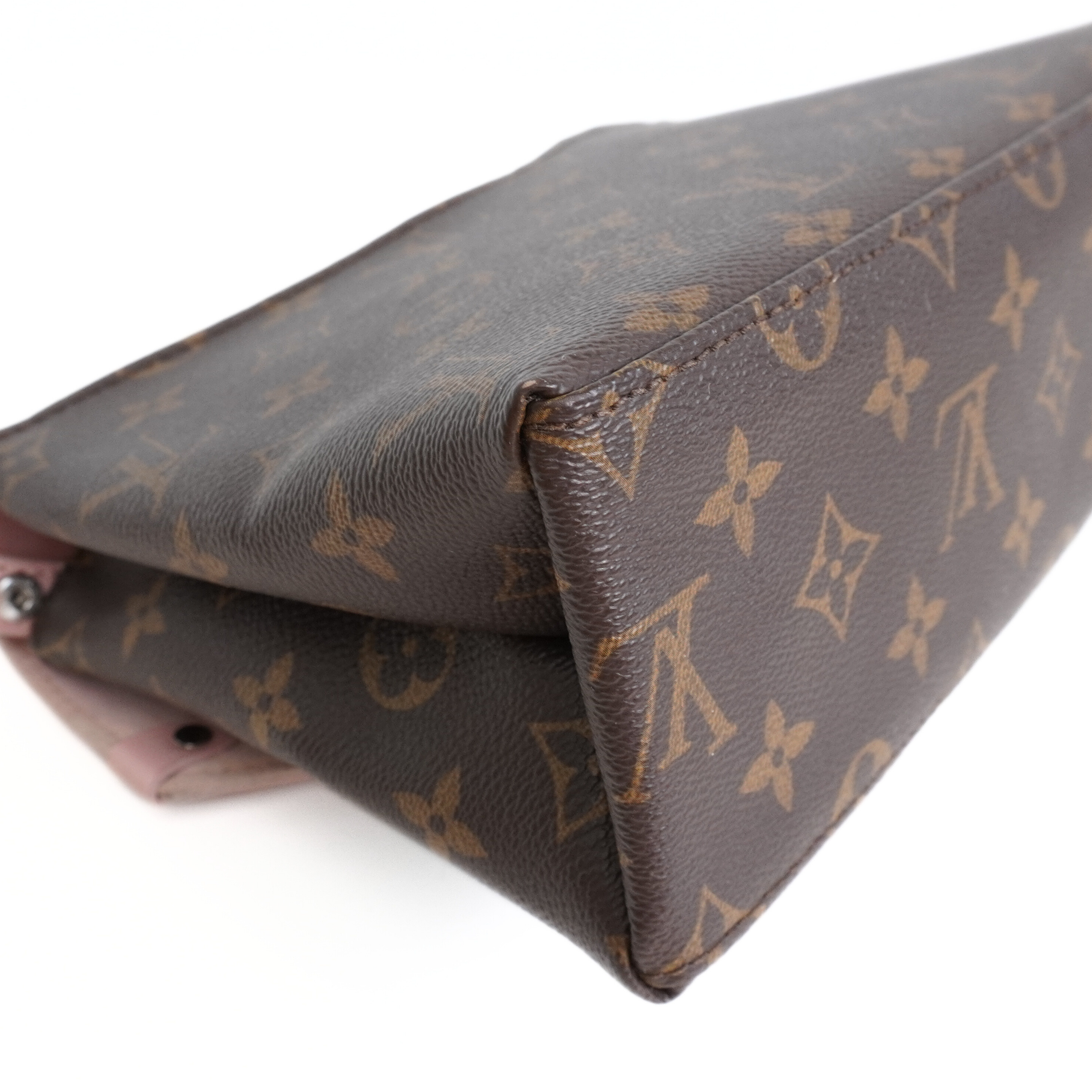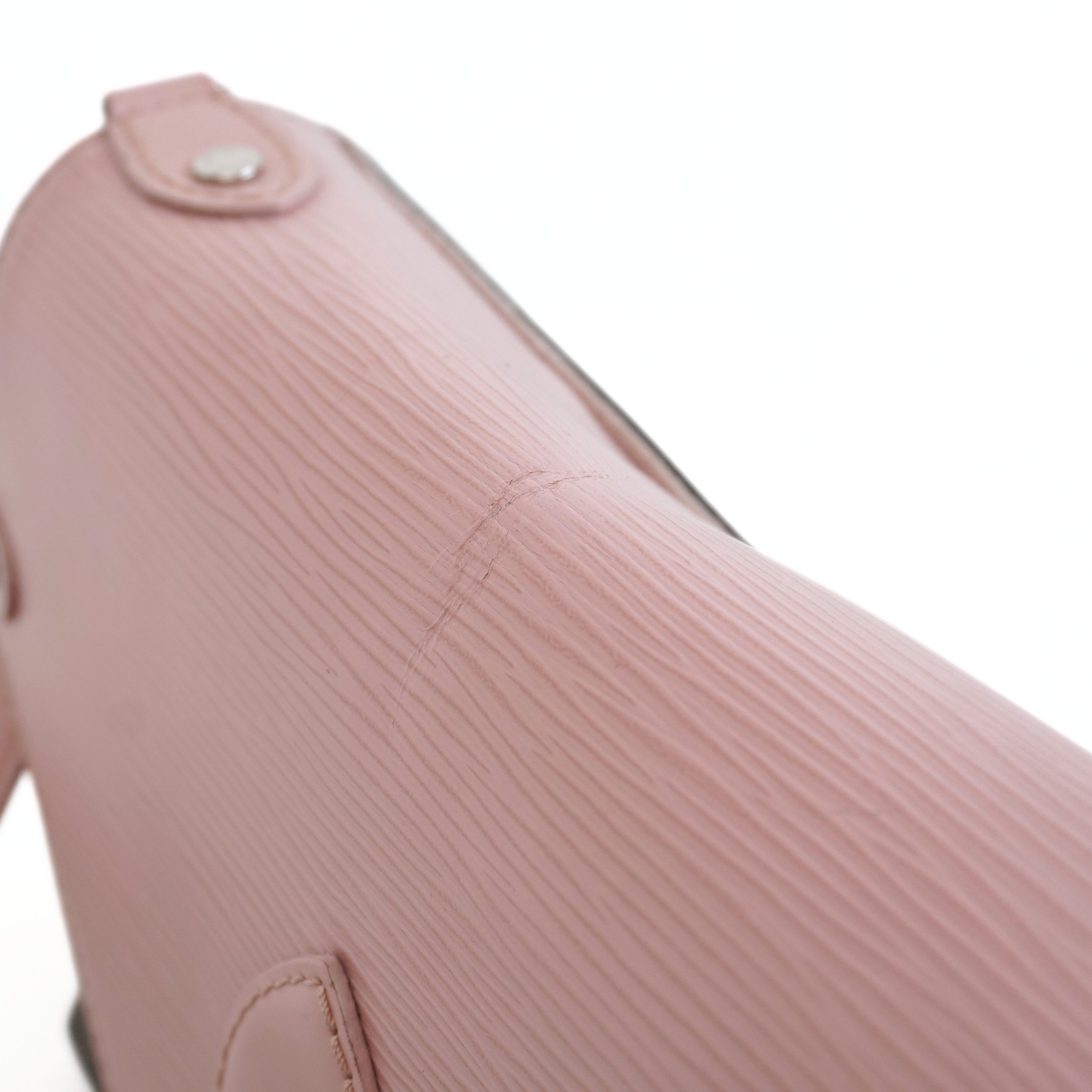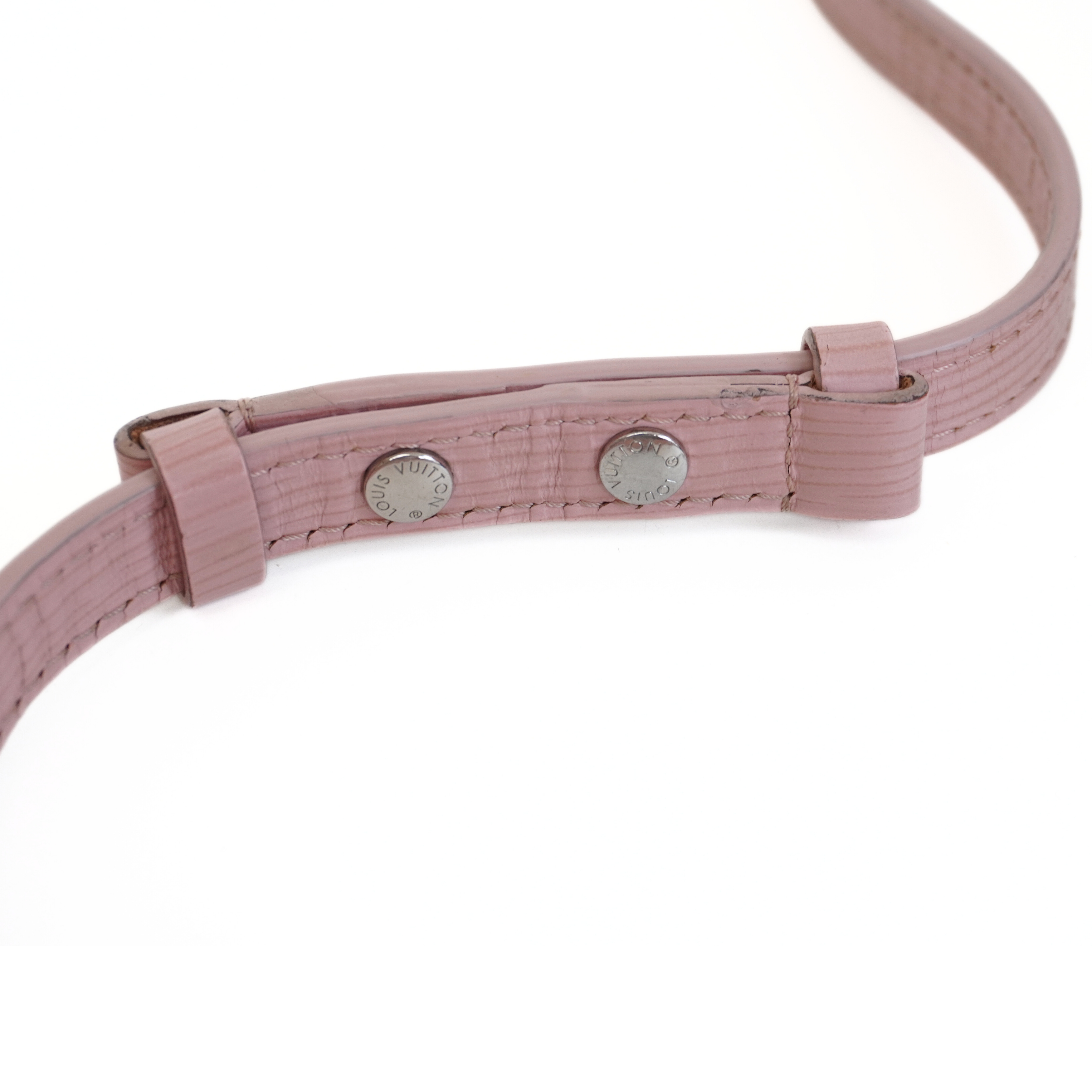 Louis Vuitton 'Epi Saint Michel' shoulder bag in brown monogram print coated canvas with a light pink epi-leather front flap and adjustable flat leather strap that allow cross-body styling. Features a front magnetic snap closure and back slip pocket.