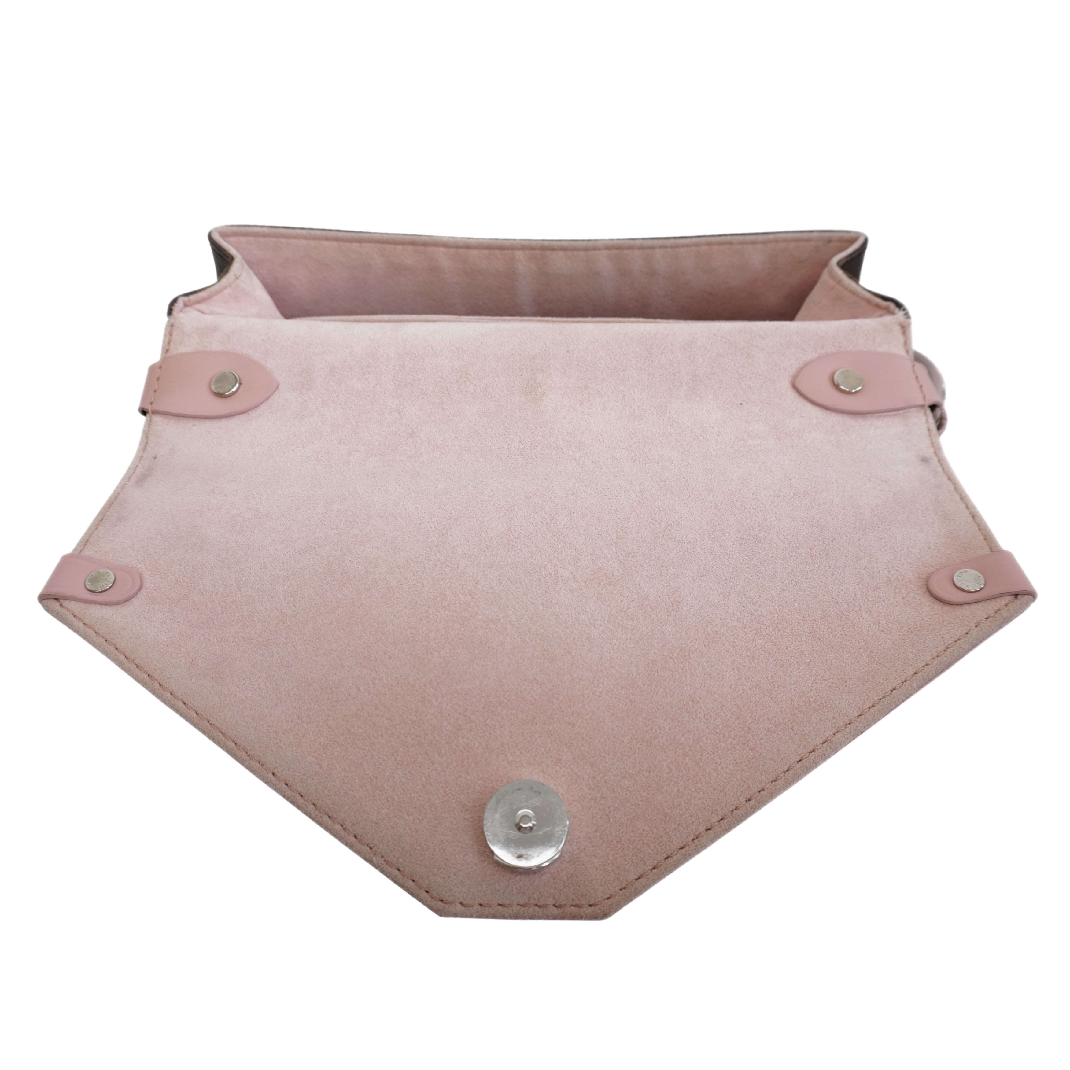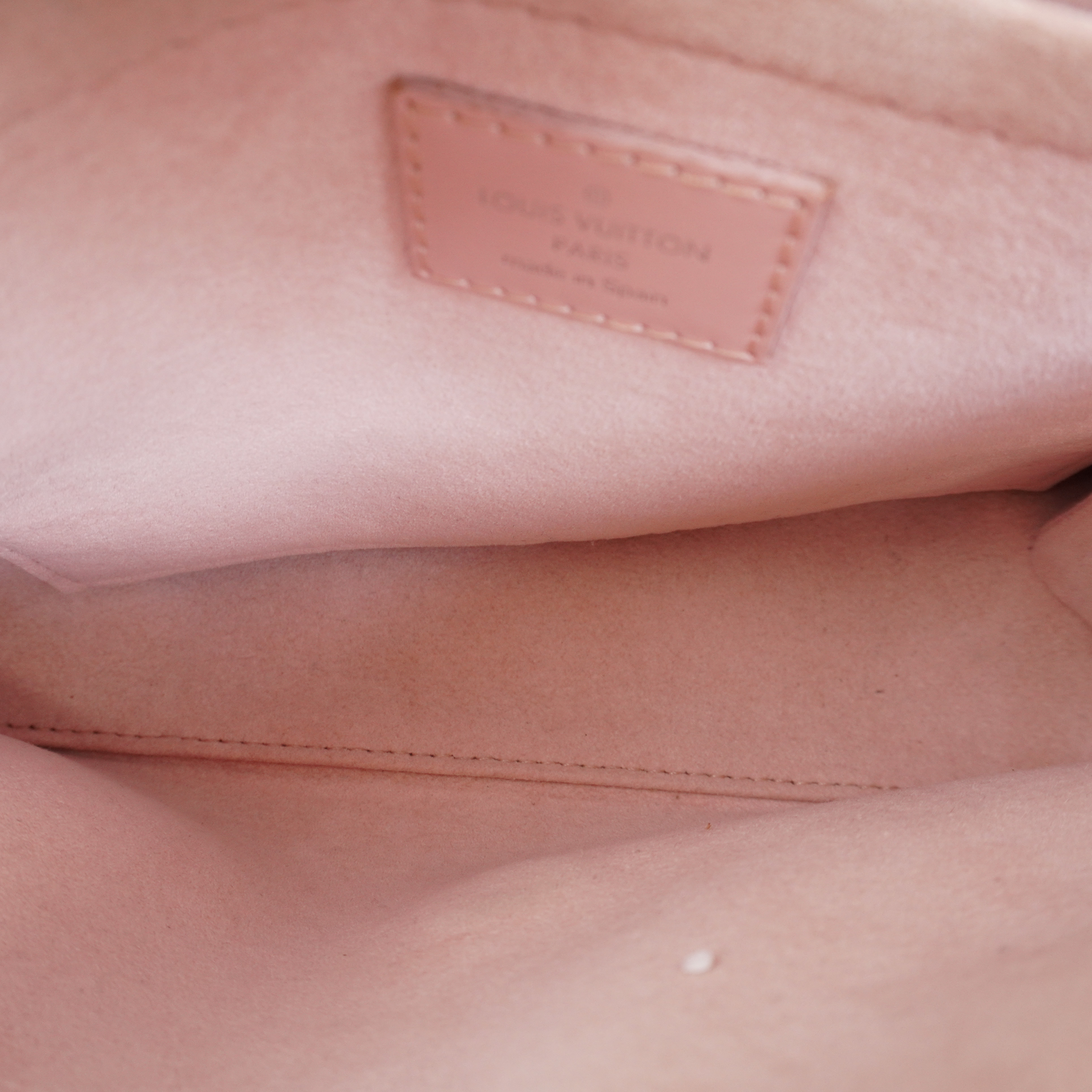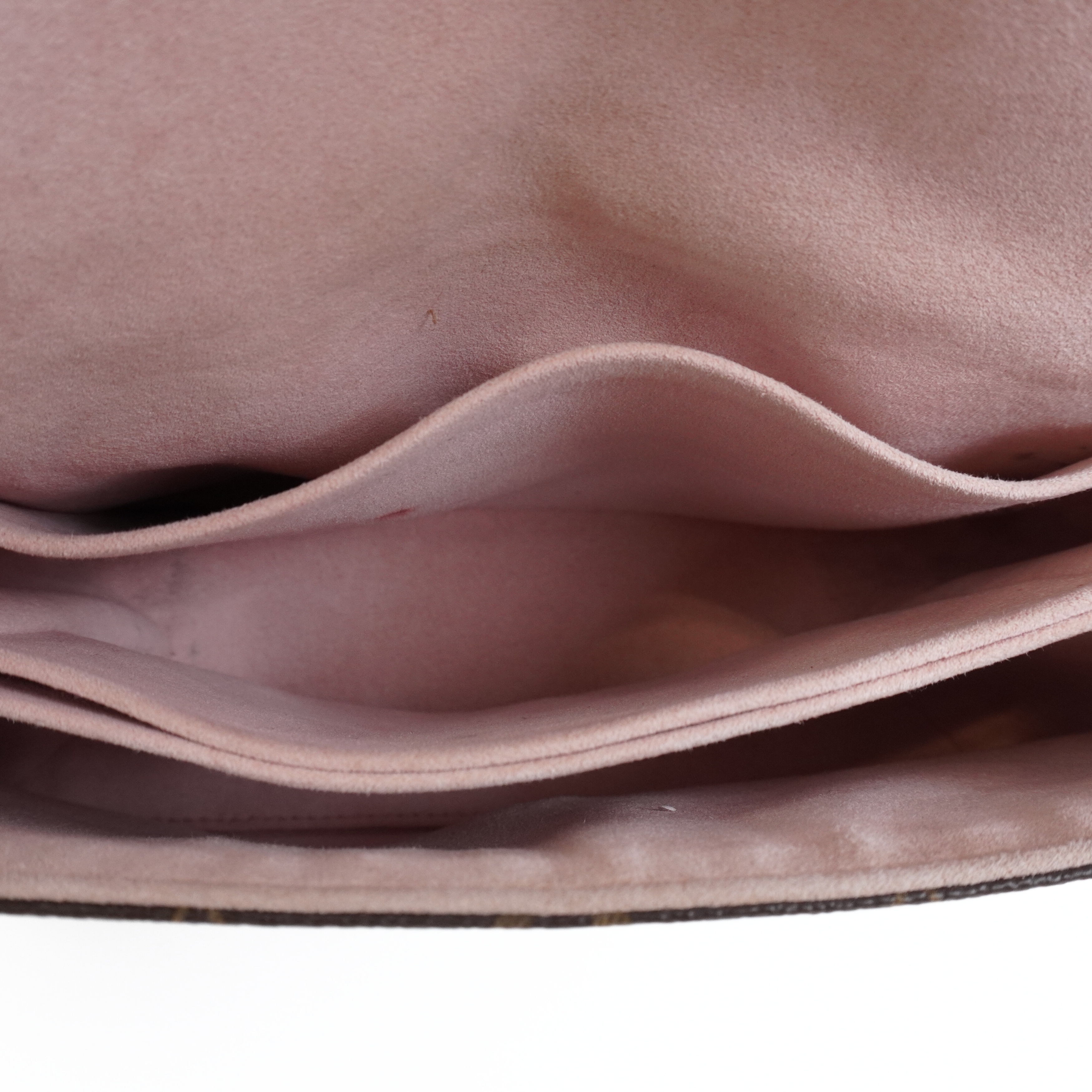 Interior features a light pink suede lining with three slip pockets.