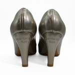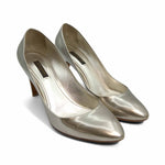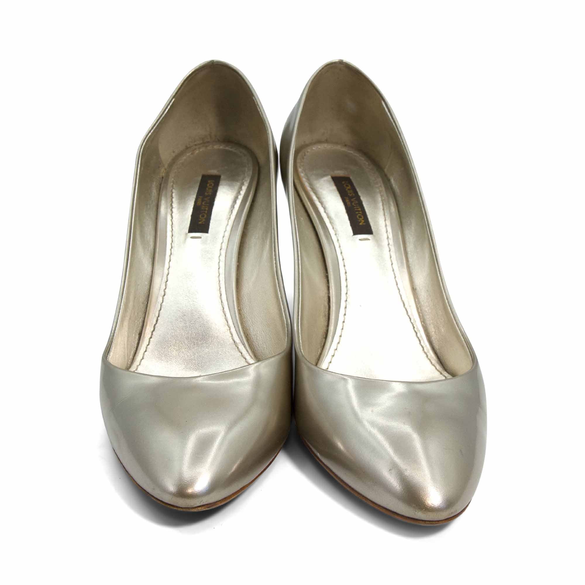 Louis Vuitton pumps in silver leather with an almond toe and embossed logo on the heels.