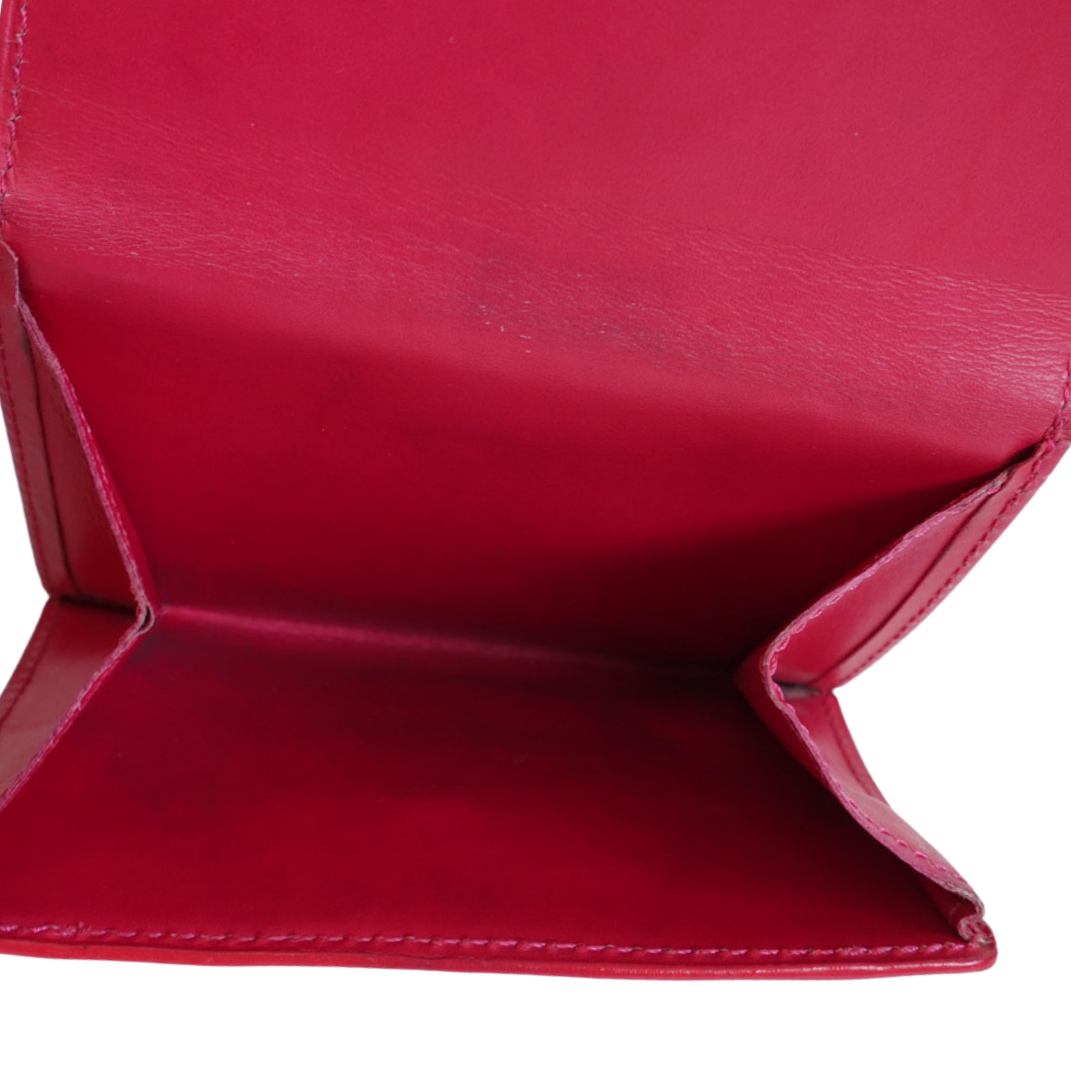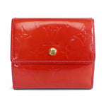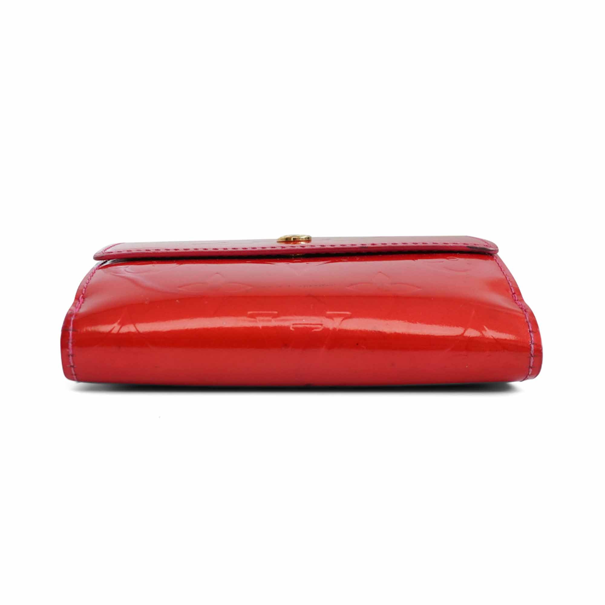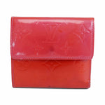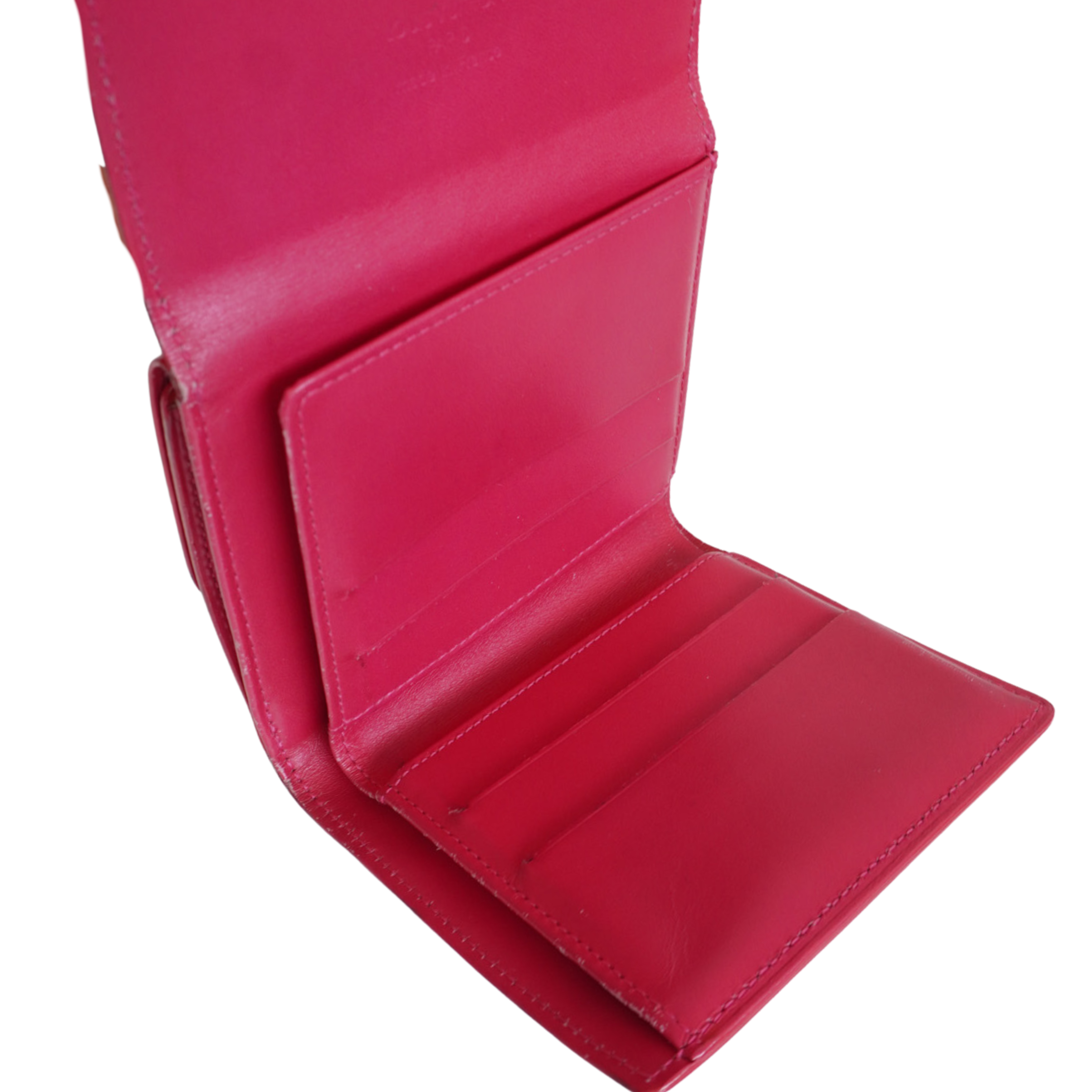 Louis Vuitton snap wallet in red monogram embossed vernis leather with fuschia pink leather lining and dual snap openings with gold snap button hardware.
