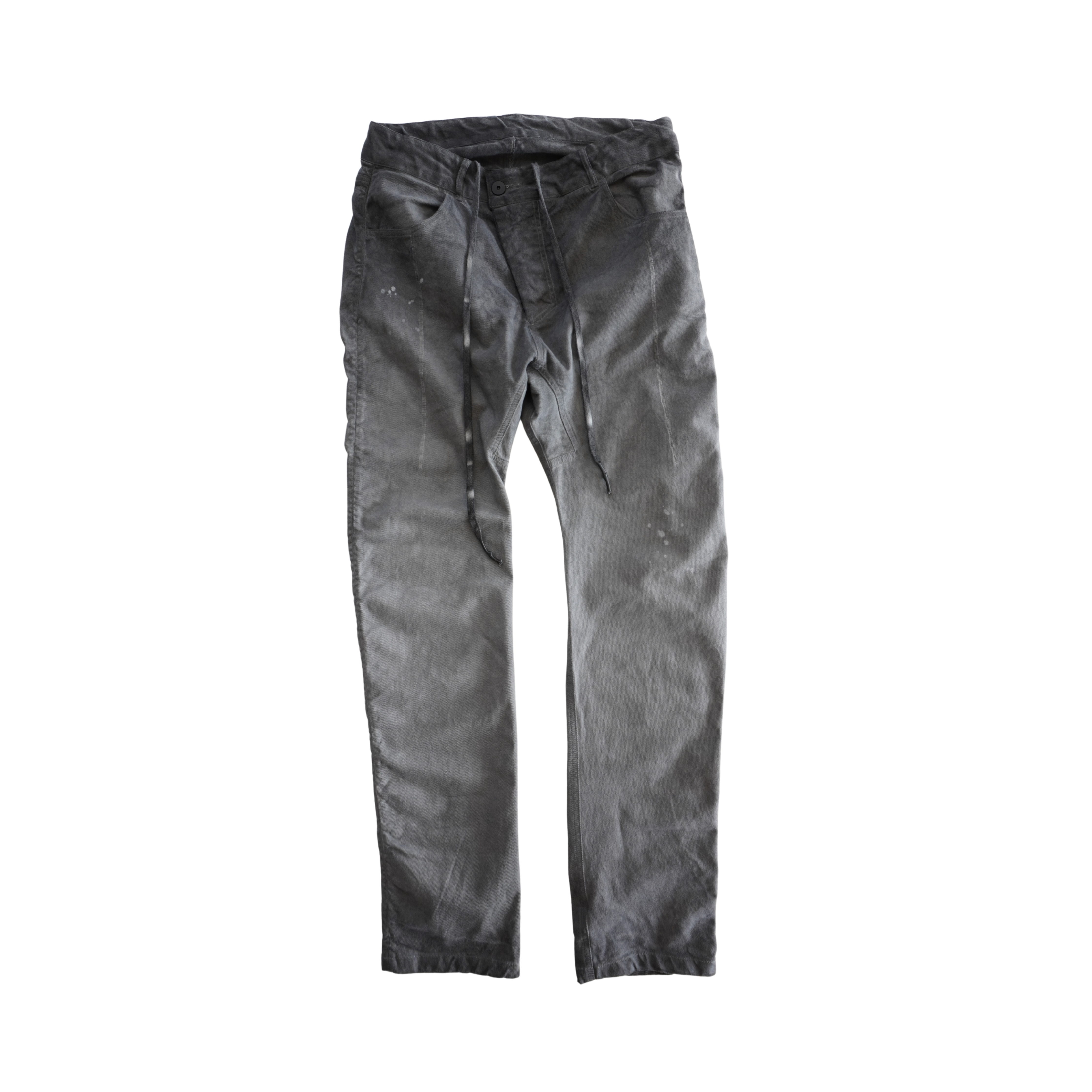 11 by Boris Bidjan Saberi 'P1C' straight leg jeans in faded grey denim with paint splatter details throughout, an asymmetrical front-button closure, and long drawstrings at the waist.