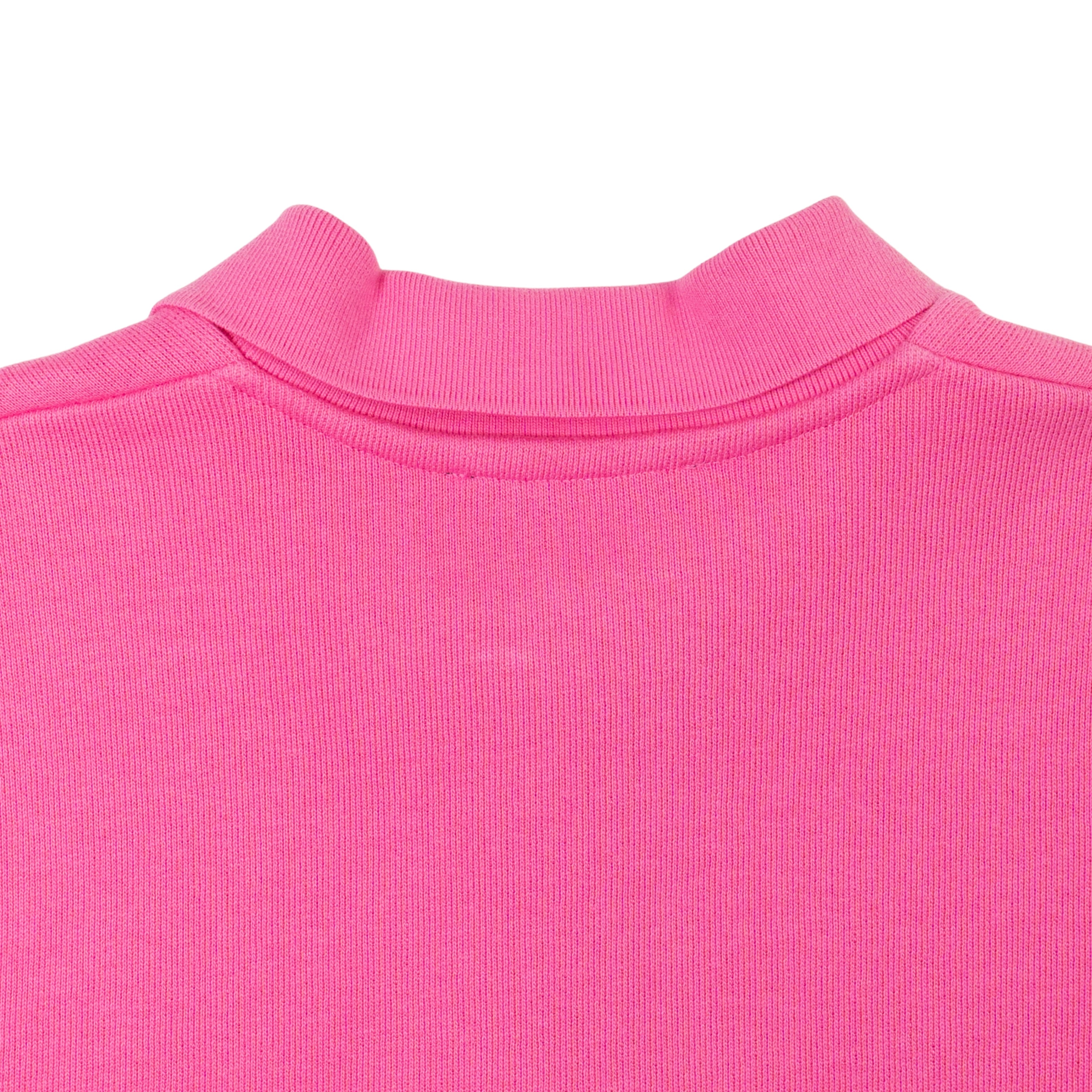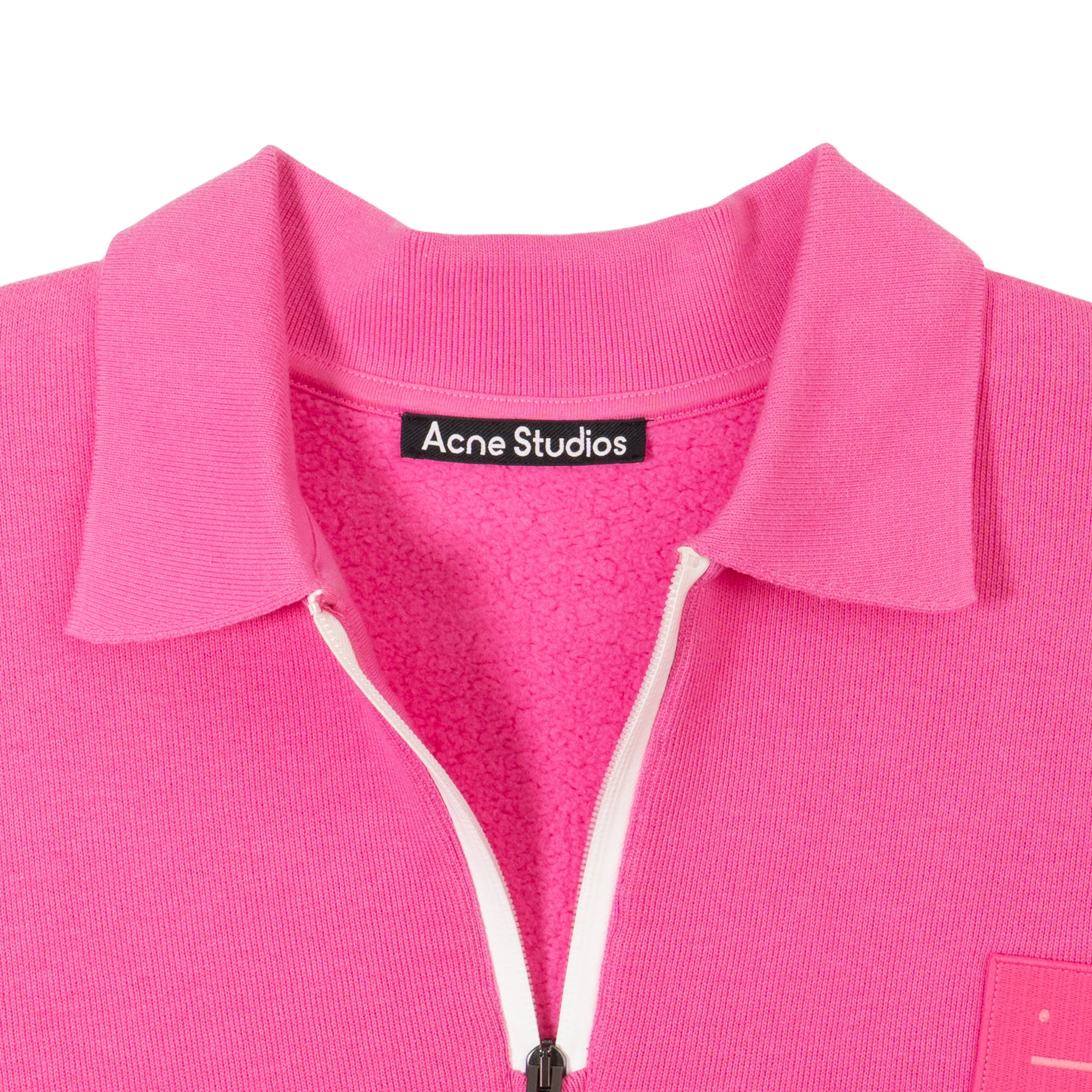 Acne Studios quarter zip sweater in knit pink cotton with white exposed zipper and logo patch on the chest.