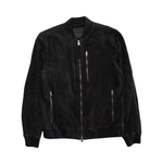 All Saints 'Kemble' bomber jacket in black suede with ribbed trim, a front zip opening in silver hardware, and zip pockets.