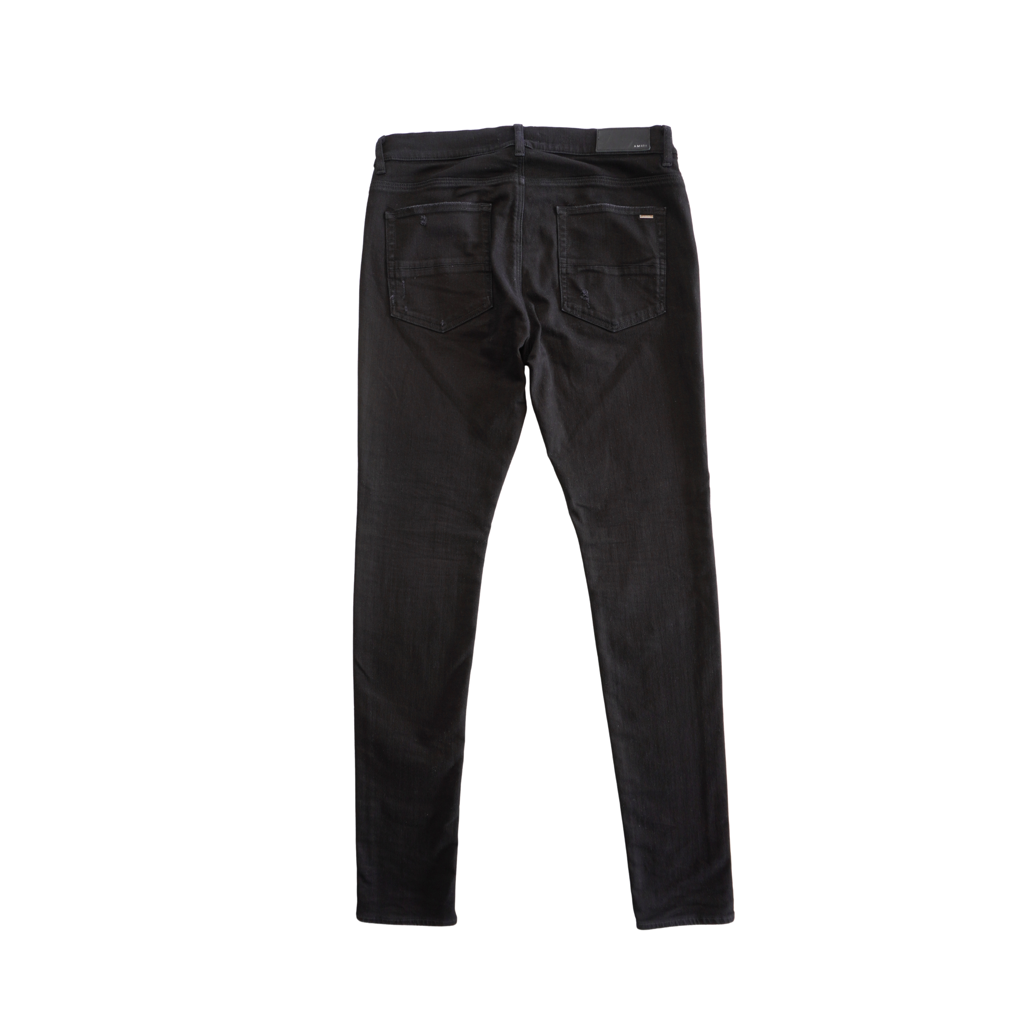 Amiri slim-fit jeans in black lightly distressed denim with silver hardware and button fly.