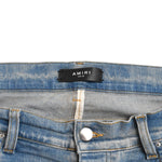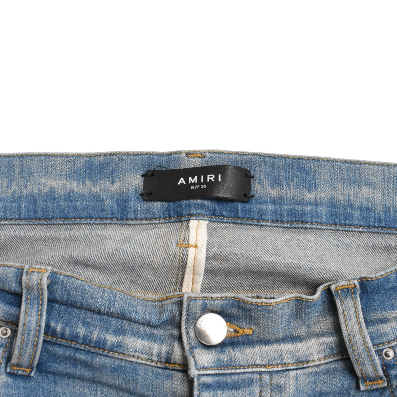 Amiri 'Thrasher' skinny jeans in a medium blue wash with five pocket styling and distressed legs with a brown ribbed underlay.