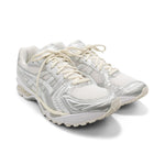 Asics x JJJOUND 'Gel-Kayano 14' lowtop sneakers in white mesh with silver and white panelling throughout. Featuring gel sole and round laces.
