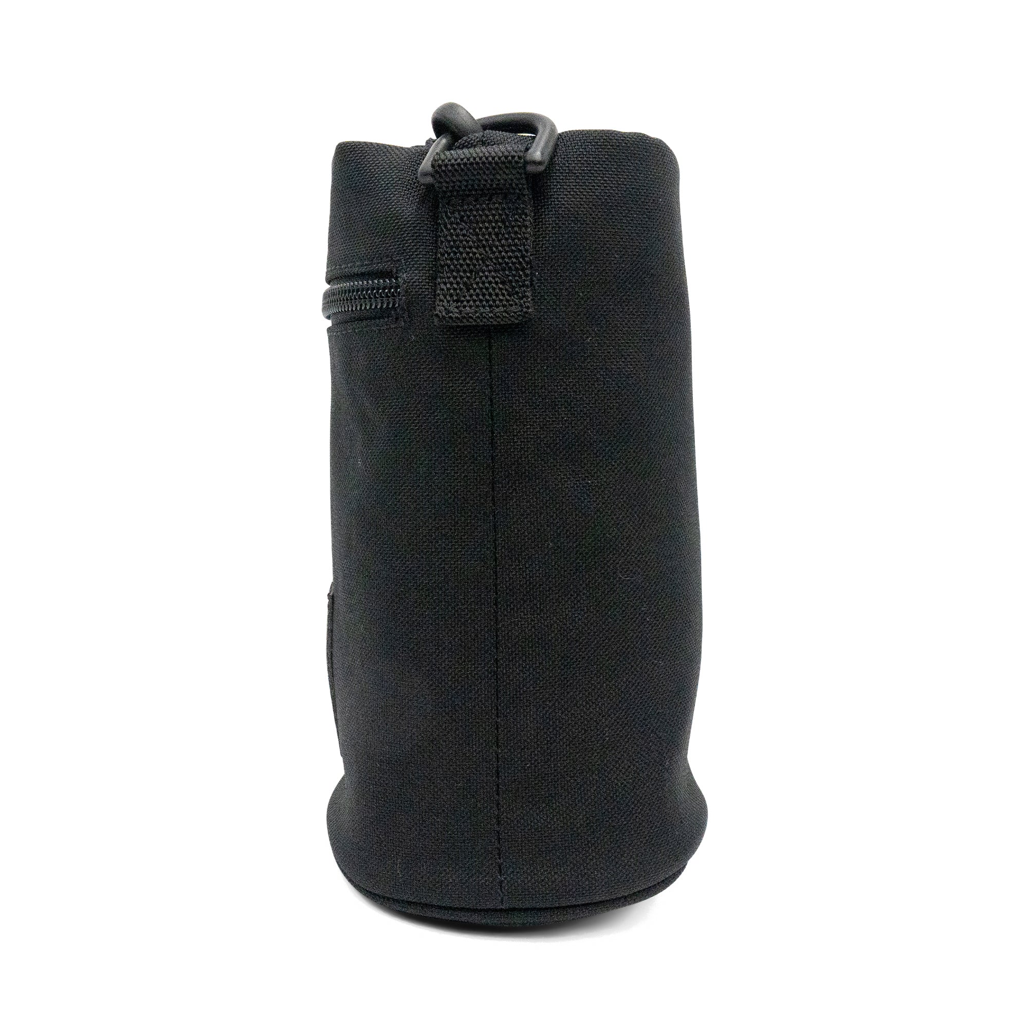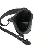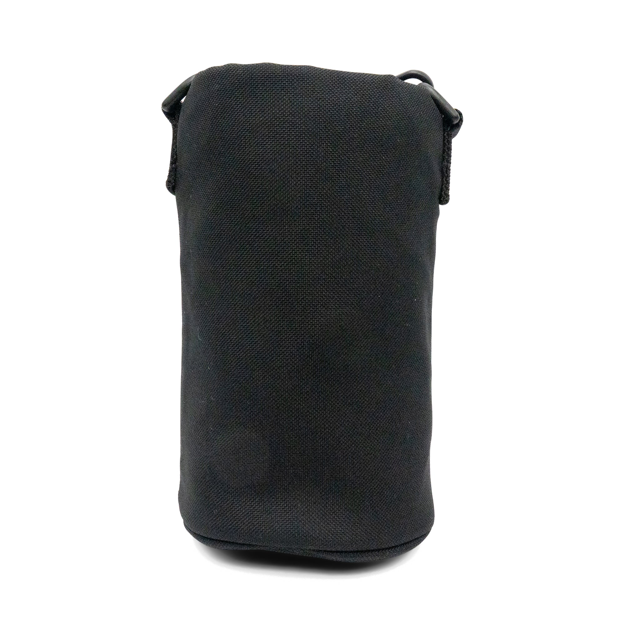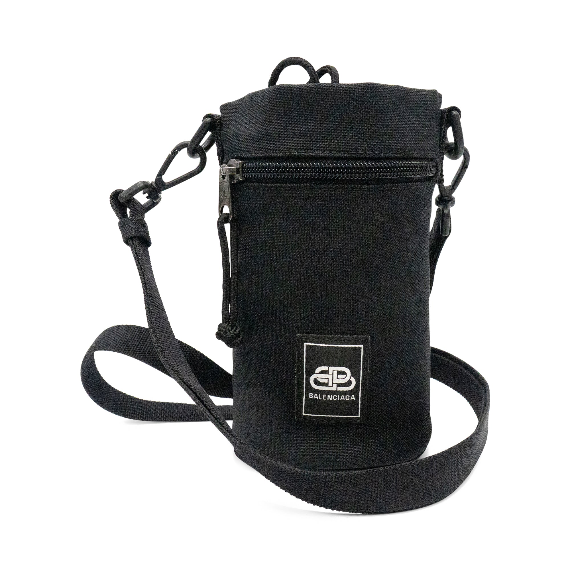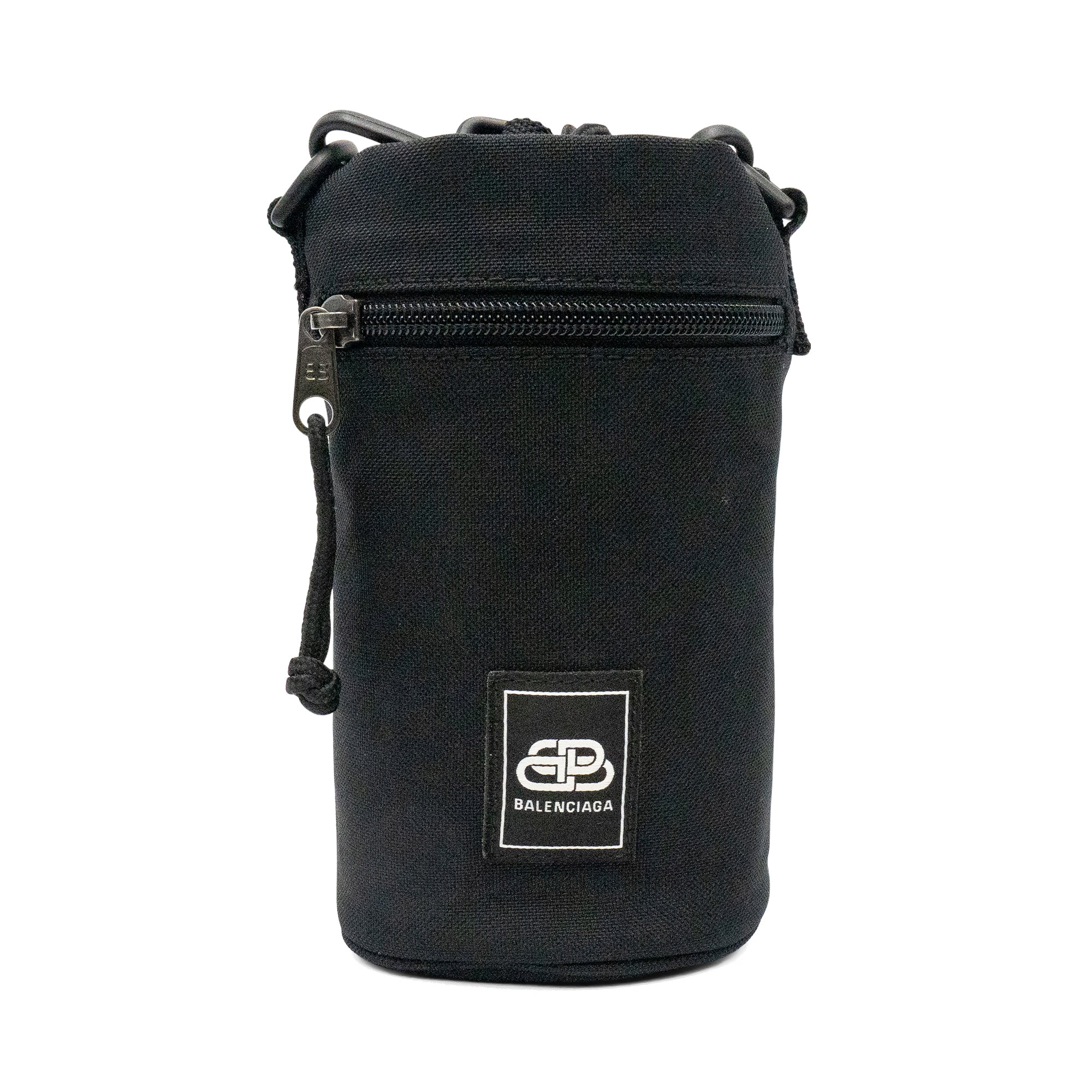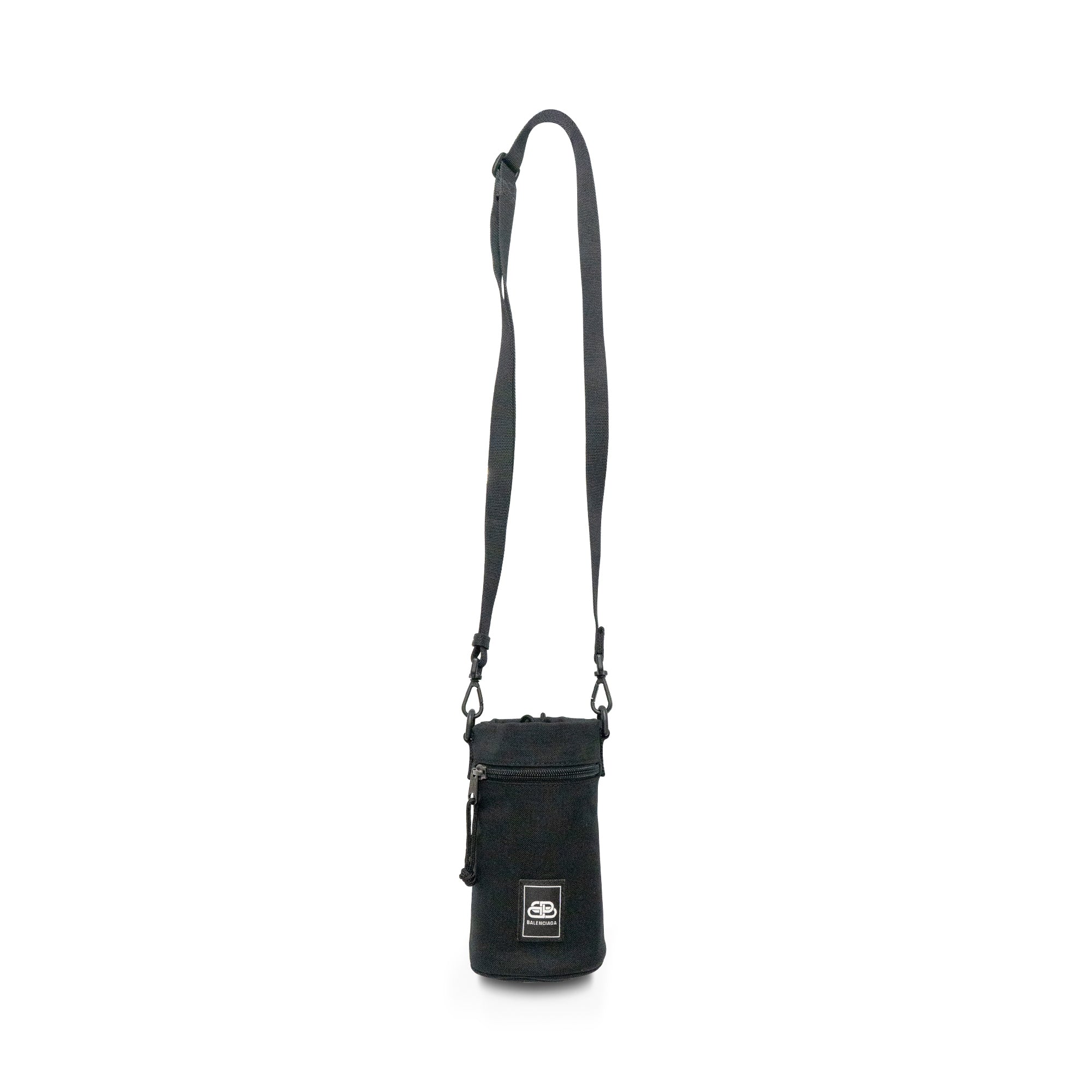 Balenciaga crossbody water bottle pouch with a square logo patch on the front. Features an adjustable crossbody strap, an outer zip pocket, and a drawstring closure.