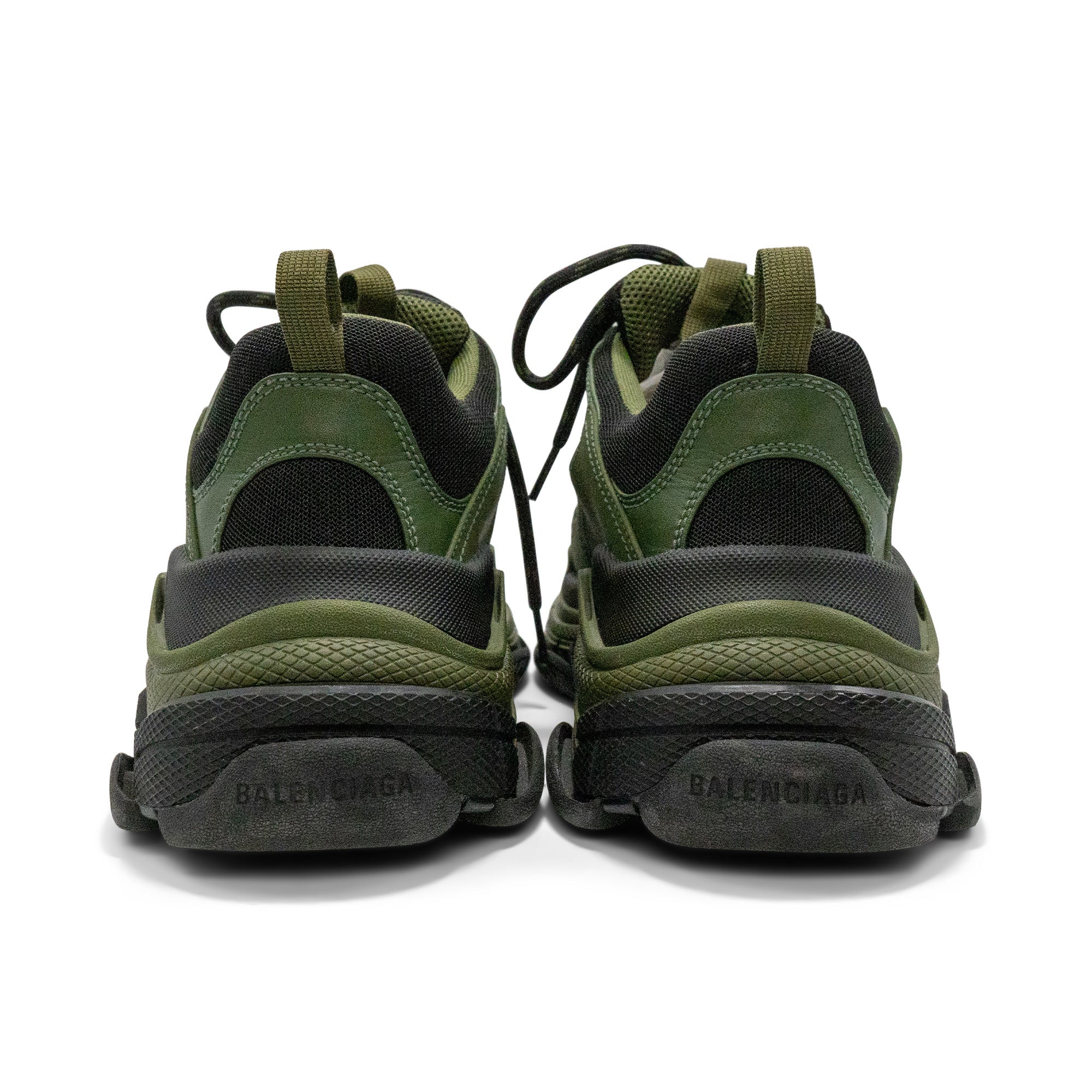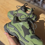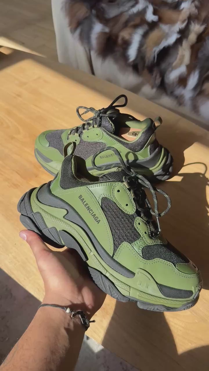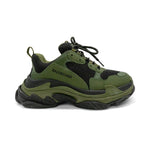 Balenciaga 'Triple S' chunky sneakers in black khaki colorway with army green nubuck leather main and black mesh panelling and extra-large rubber sole.