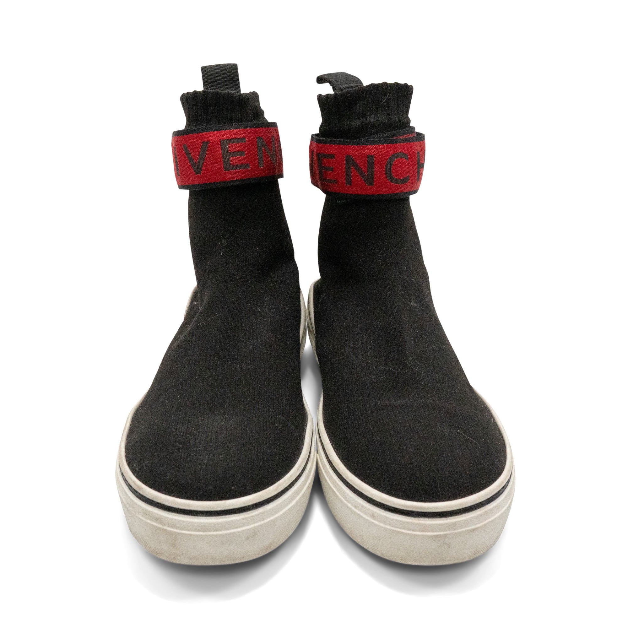 Givenchy 'George V' high top sock sneakers with black mesh uppers and a red velcro strap around the ankle with a black logo. Features a round toe, a white rubber sole, and a pull tab at the back of the ankle.