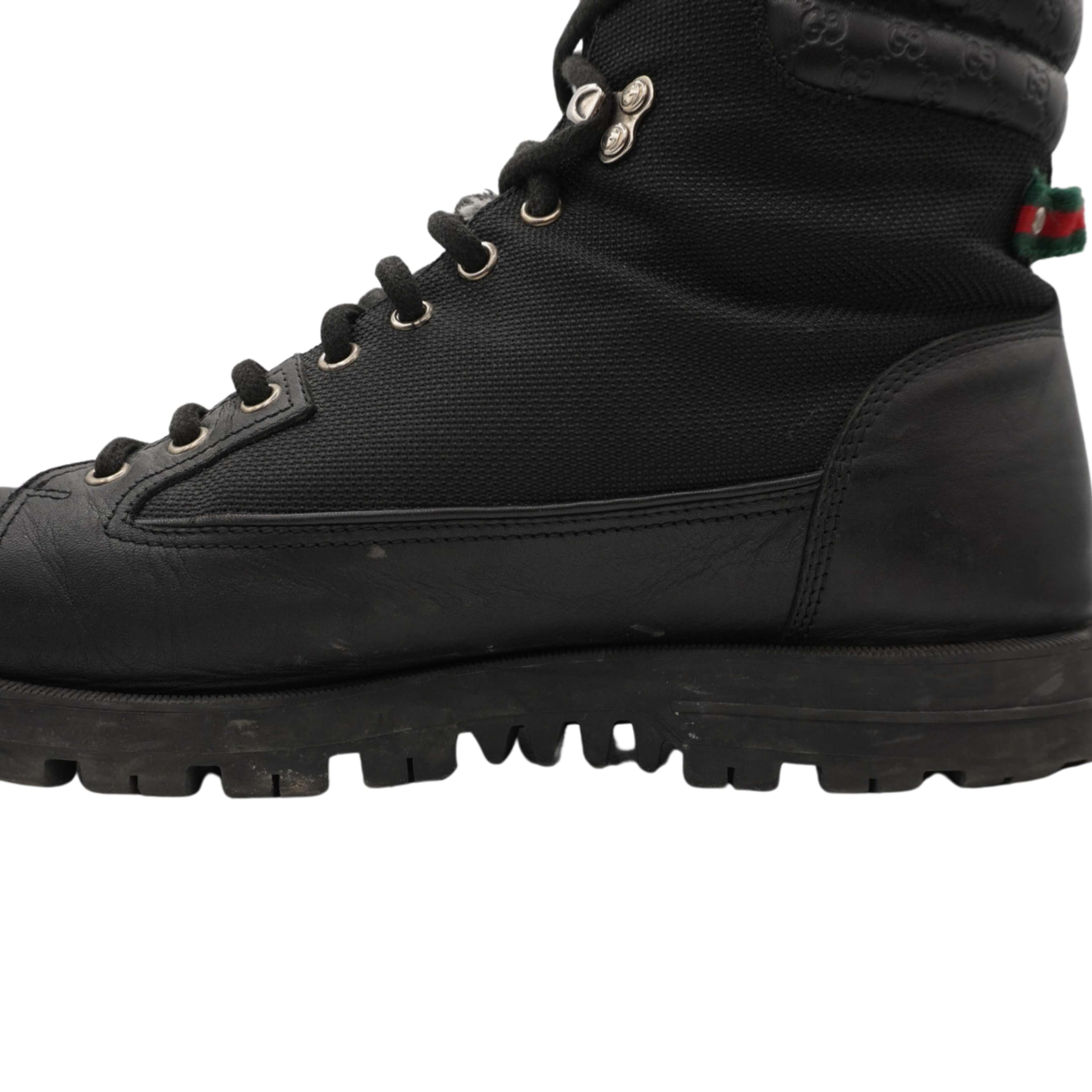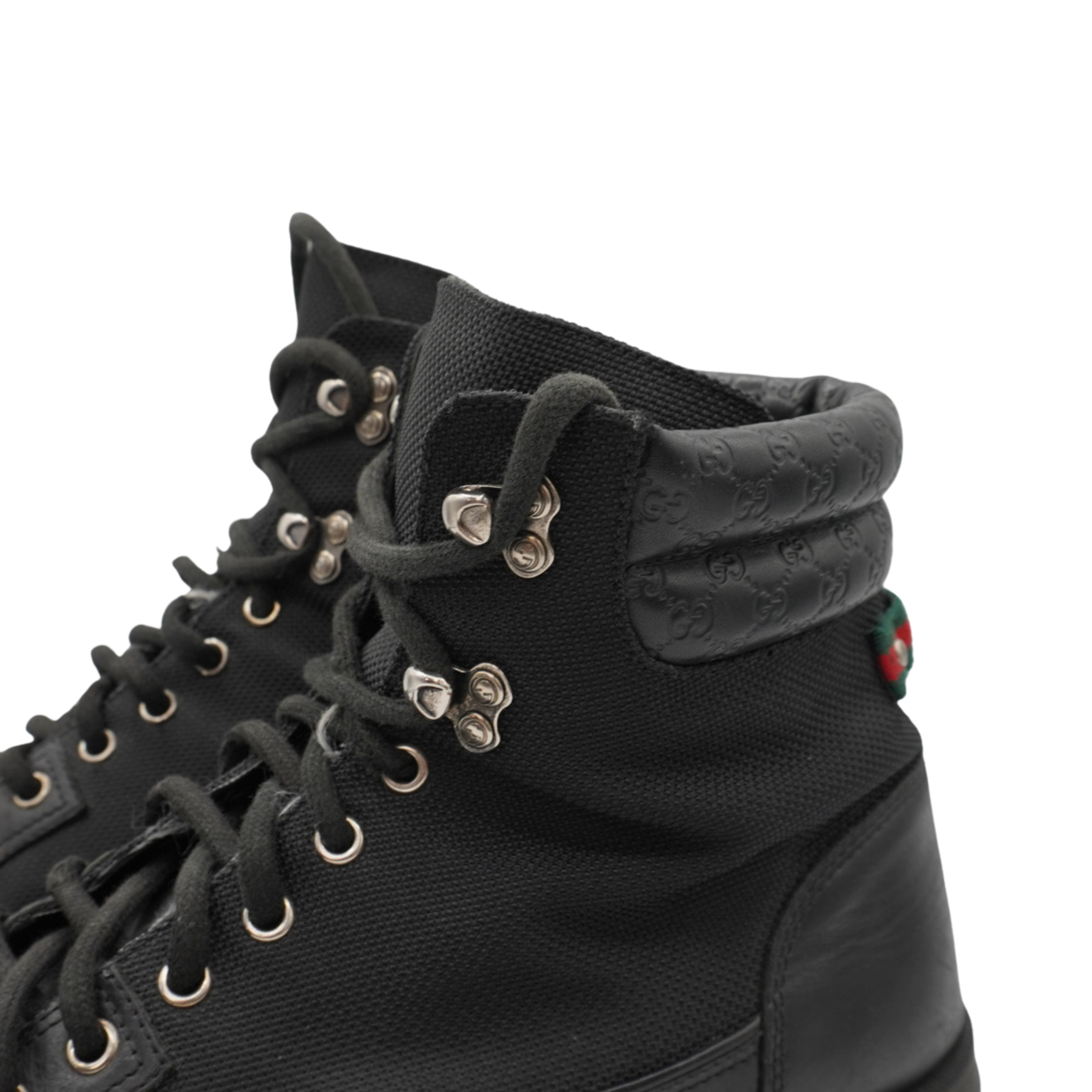 Gucci hiking boots in black canvas with black leather trim, a monogram embossed panel around the heel, a red and green canvas racing stripe tab, and a lace-up closure with silver grommet hardware. From the Fall 2012 collection.
