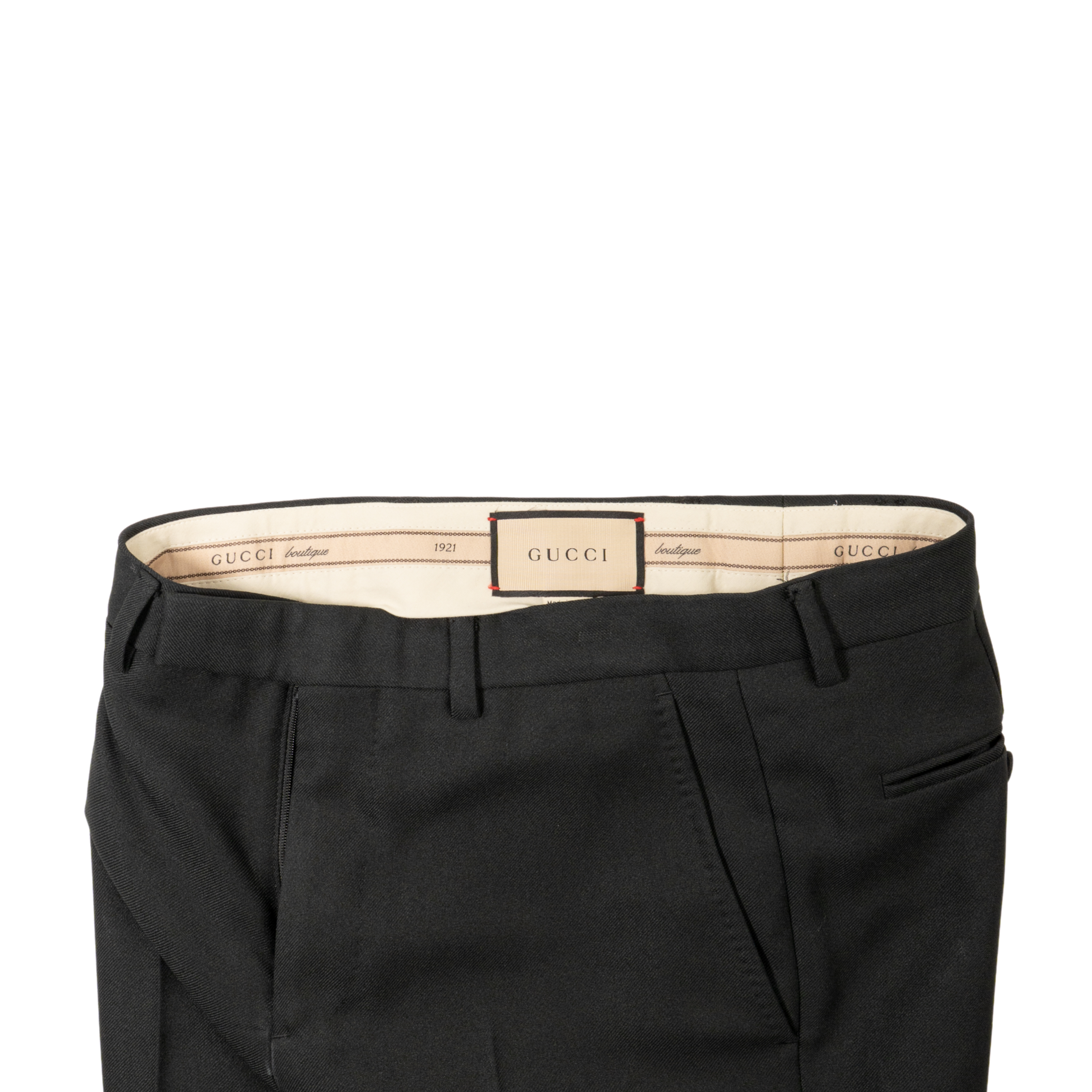 Gucci slim fit trousers in black suiting with four pocket styling.