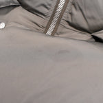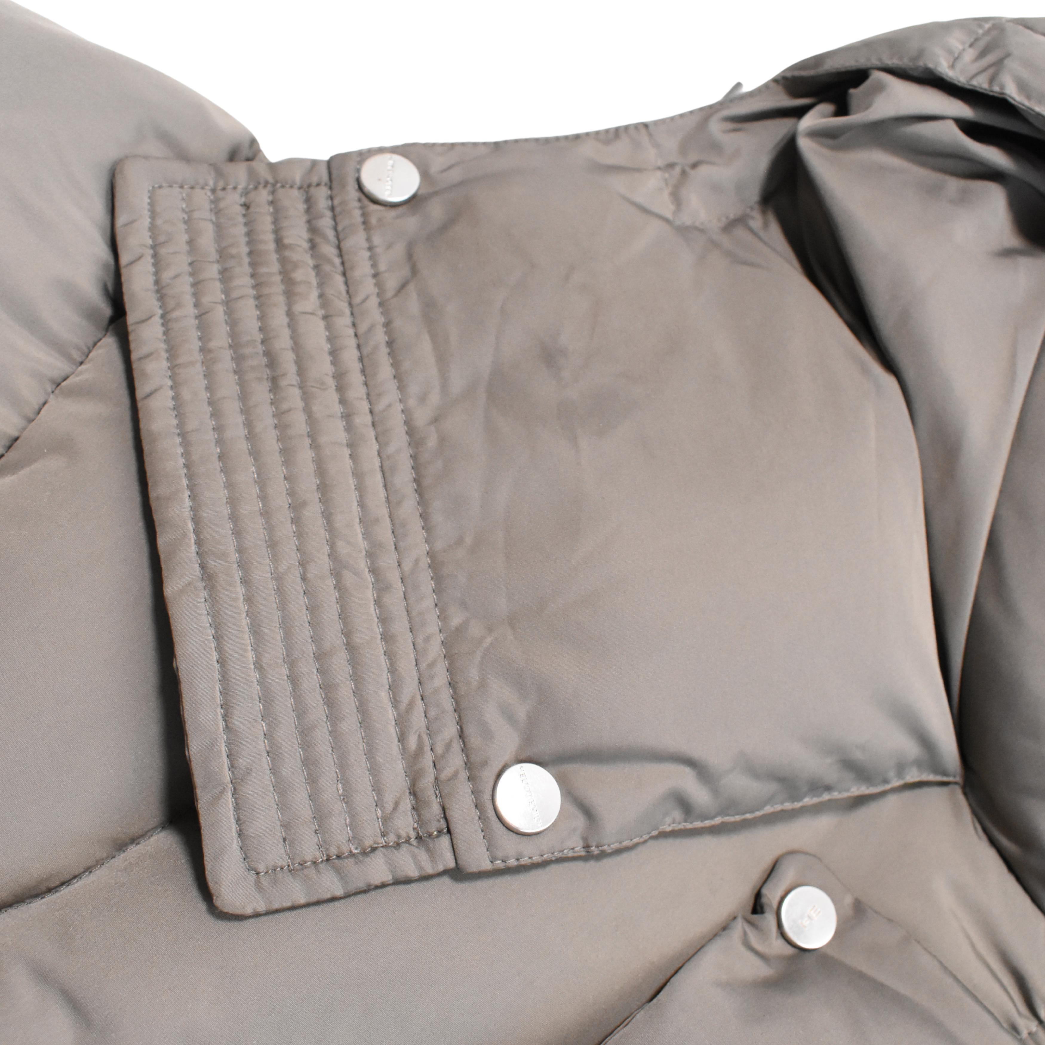 Heliot Emil 'Connective Down' puffer jacket in taupe nylon with a 2 way zip closure in silver hardware, a funnel neckline with a hood, and convertible stud detail panels on the front. The jacket has a drawstring hem and an embroidered logo on the back neckline.