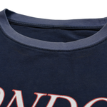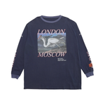Heron Preston 'For You, The World' long-sleeve t-shirt in navy cotton with a large heron graphic on the chest, text graphics across the front and back, and orange logo patch on the sleeve.
