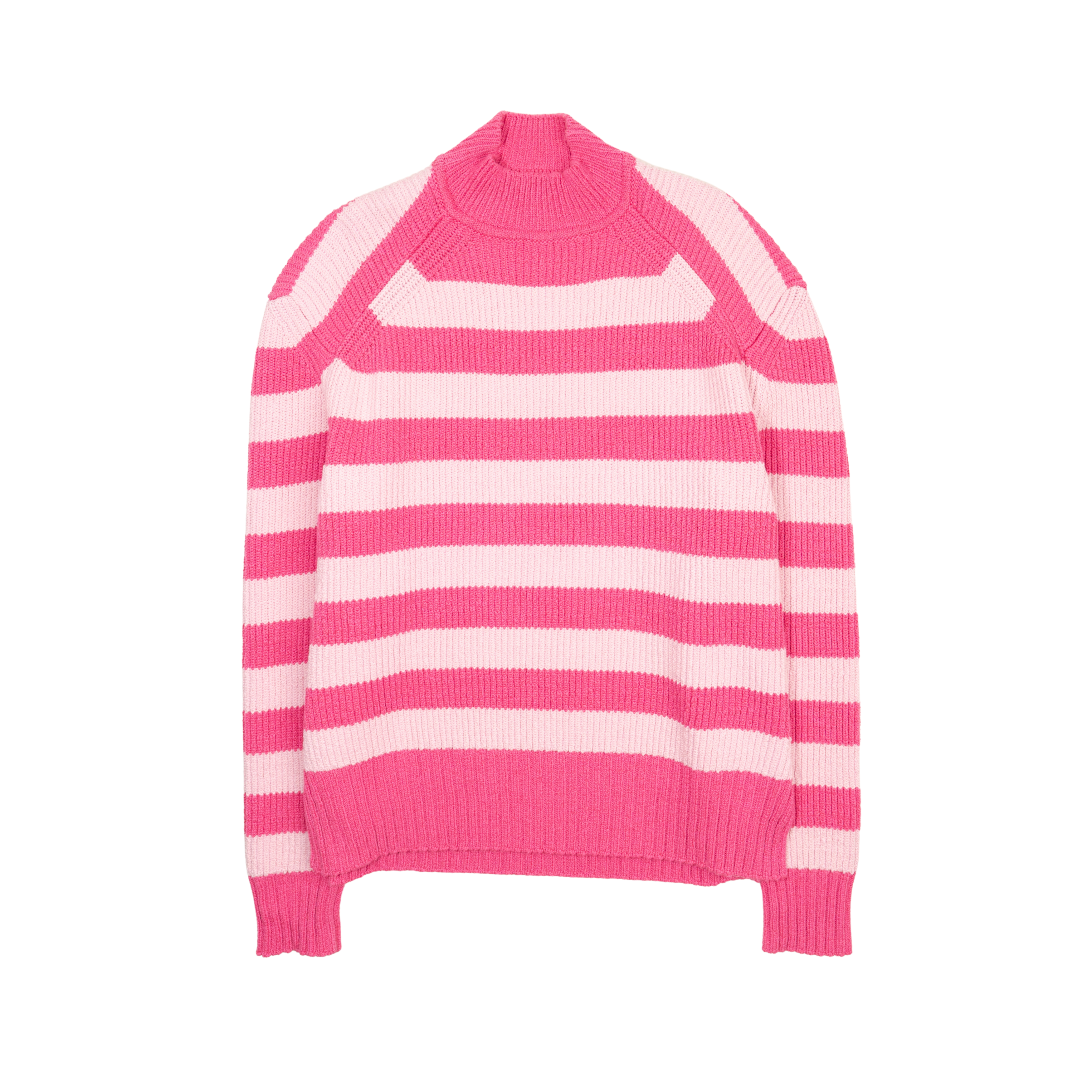 Jacquemus mock neck, long sleeved knit sweater with horizontal pink stripes.