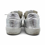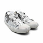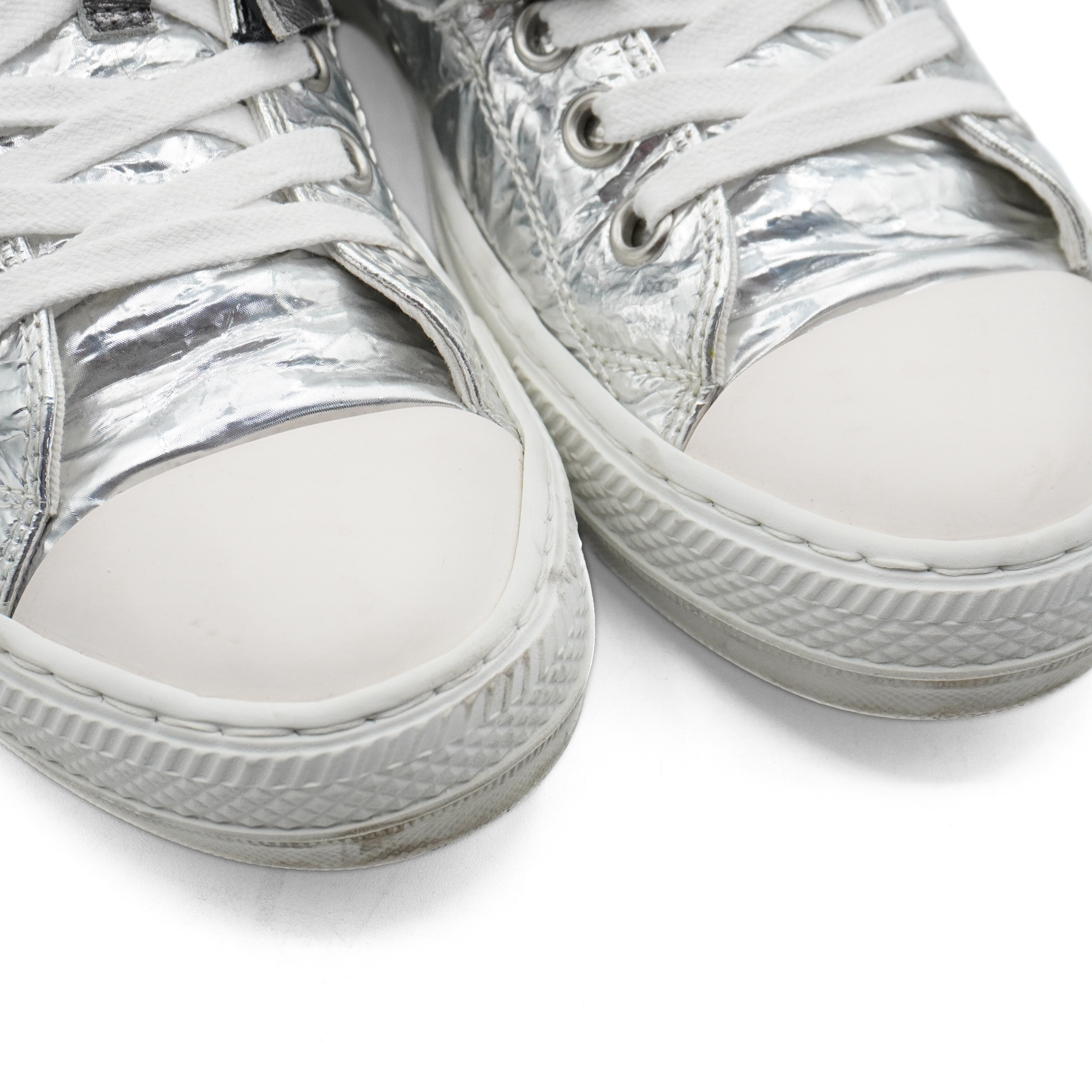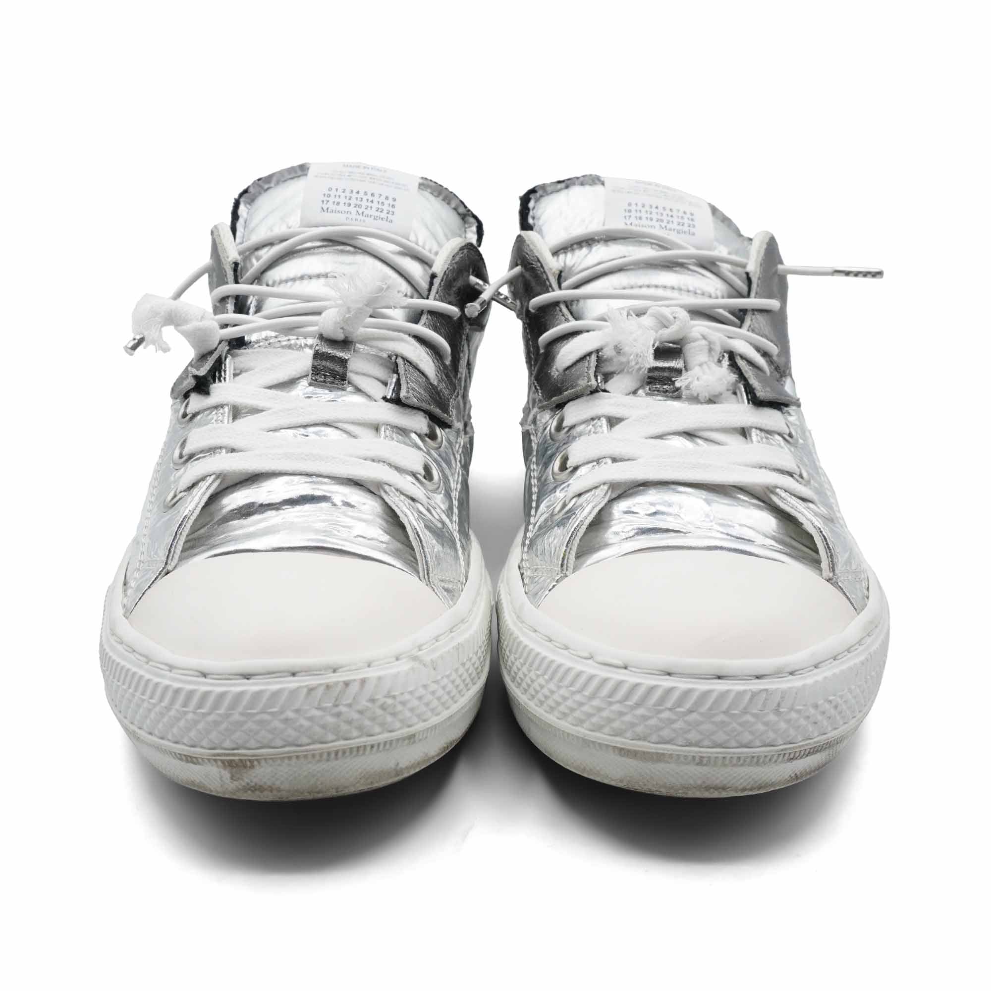 Maison Margiela 'Evolution' low-top sneakers in silver metallic patchwork leather with a multi lace design and a white rubber sole.