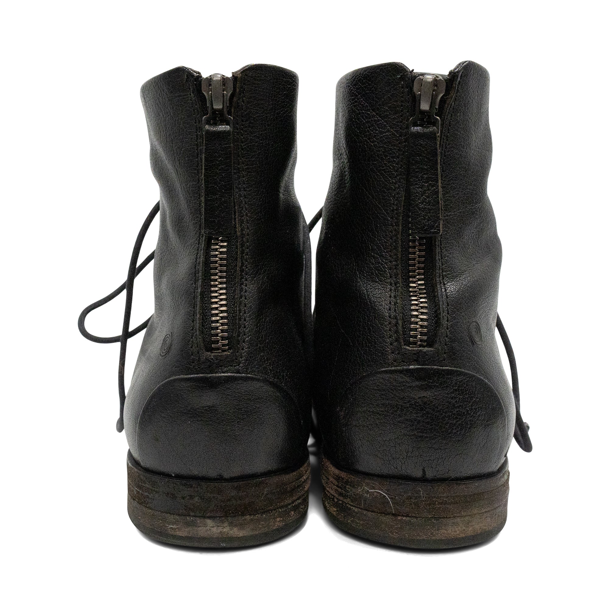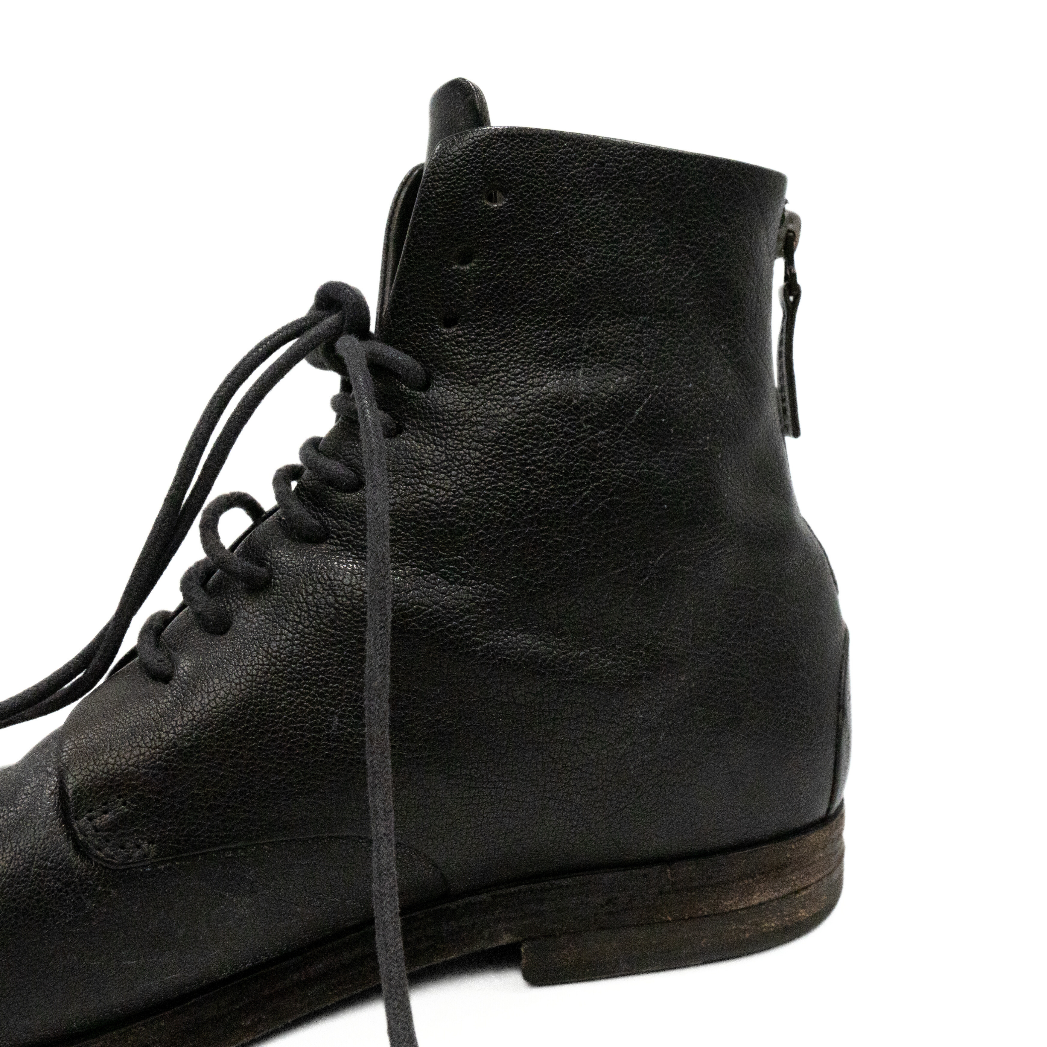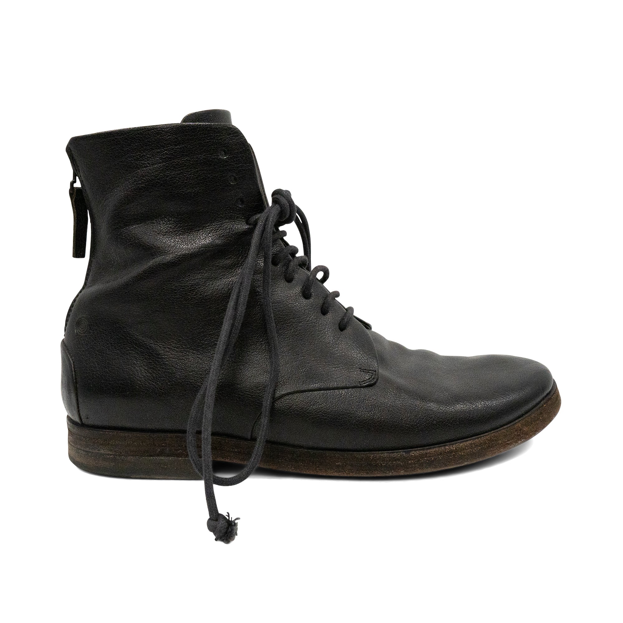 Marsell lace-up combat boots in black leather with zip back. Features tonal waxed laces, and a small embossed logo at the heel.