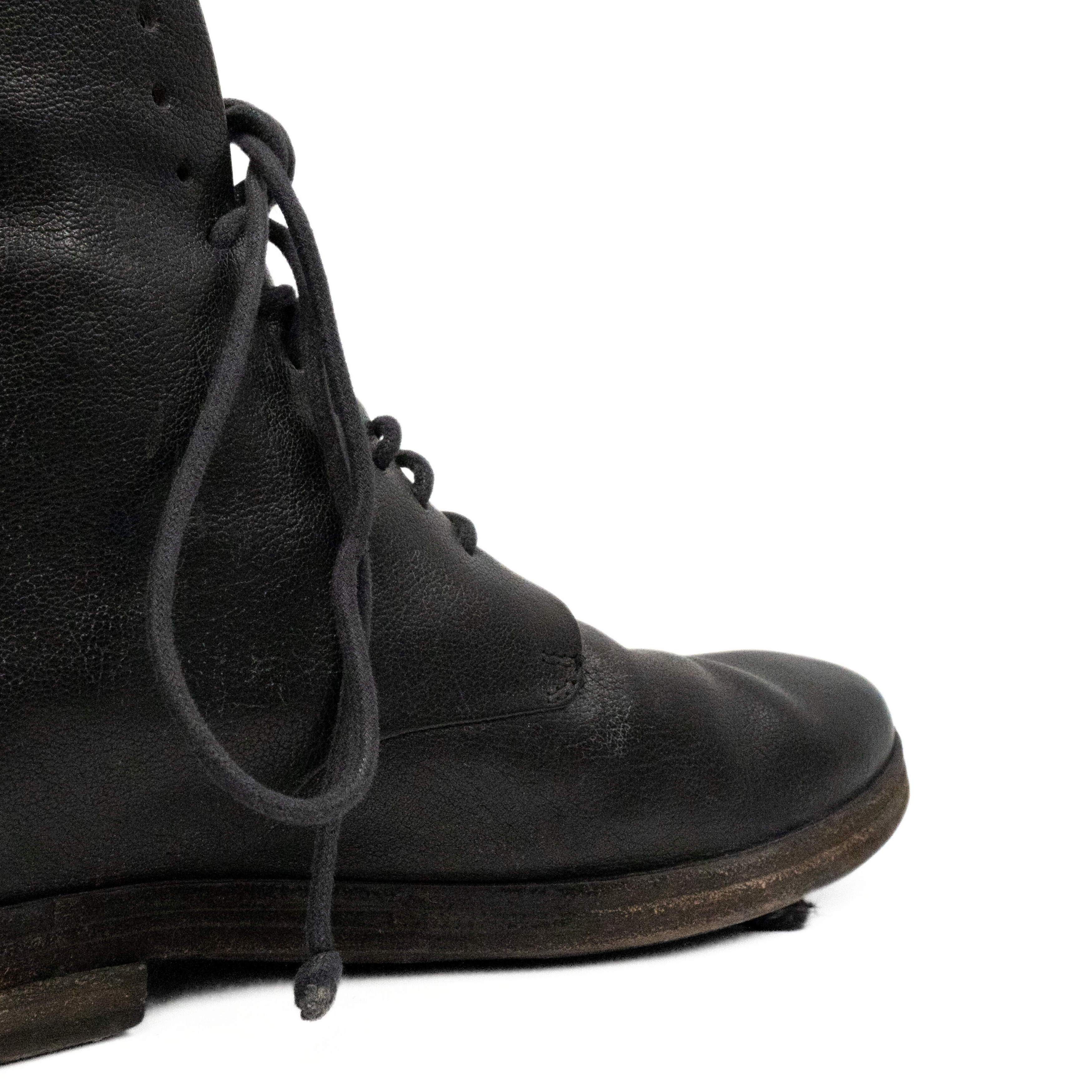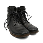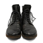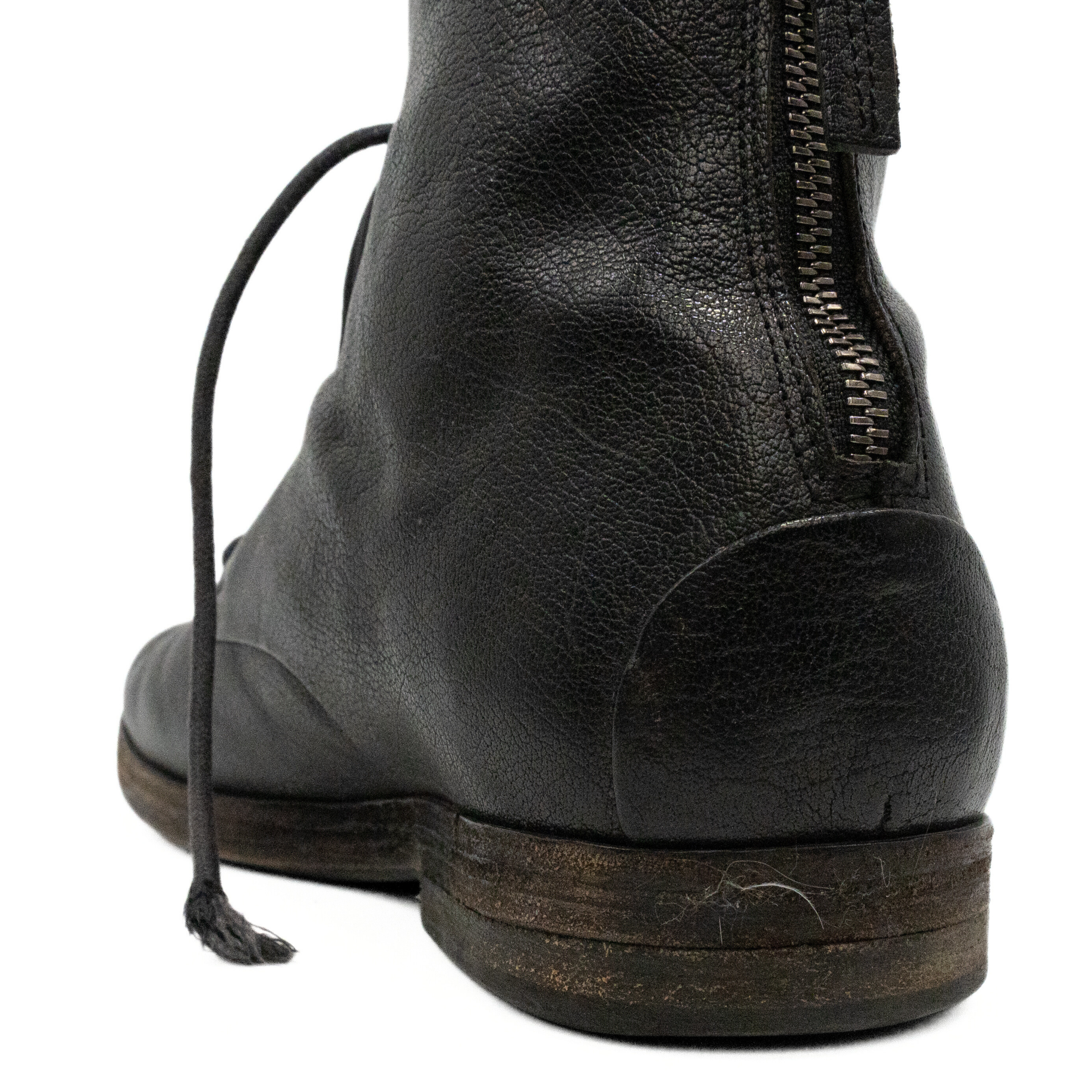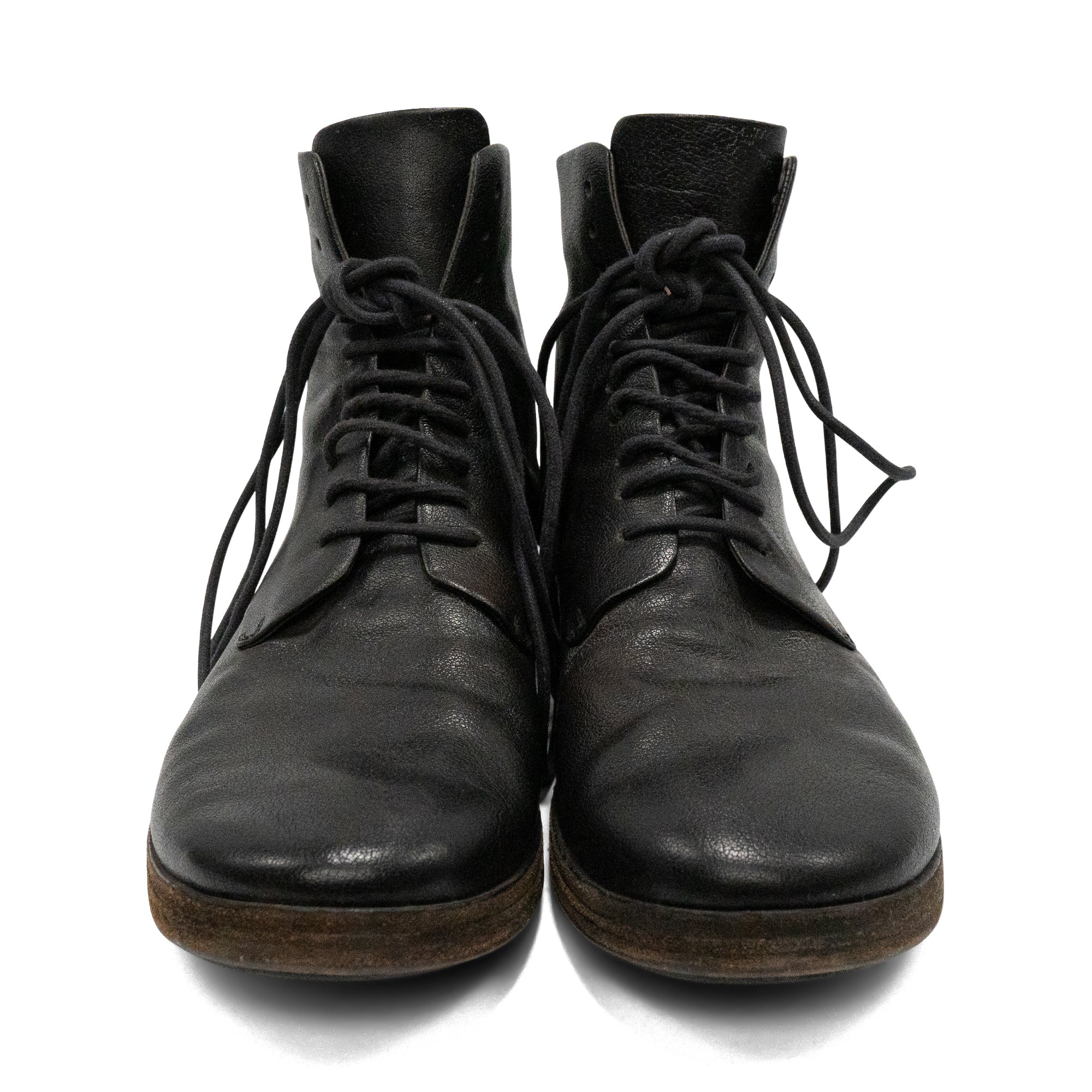 Marsell lace-up combat boots in black leather with zip back. Features tonal waxed laces, and a small embossed logo at the heel.