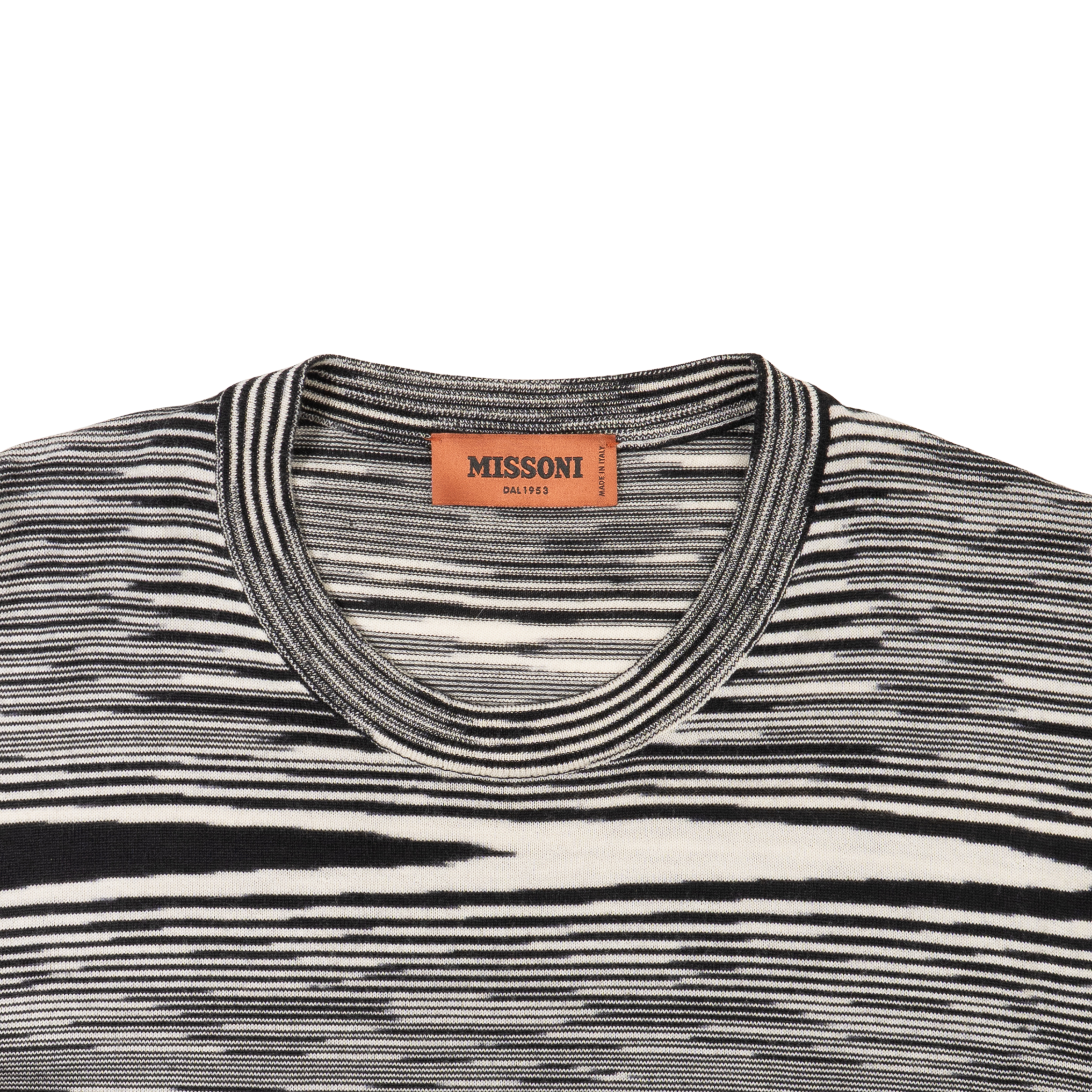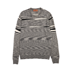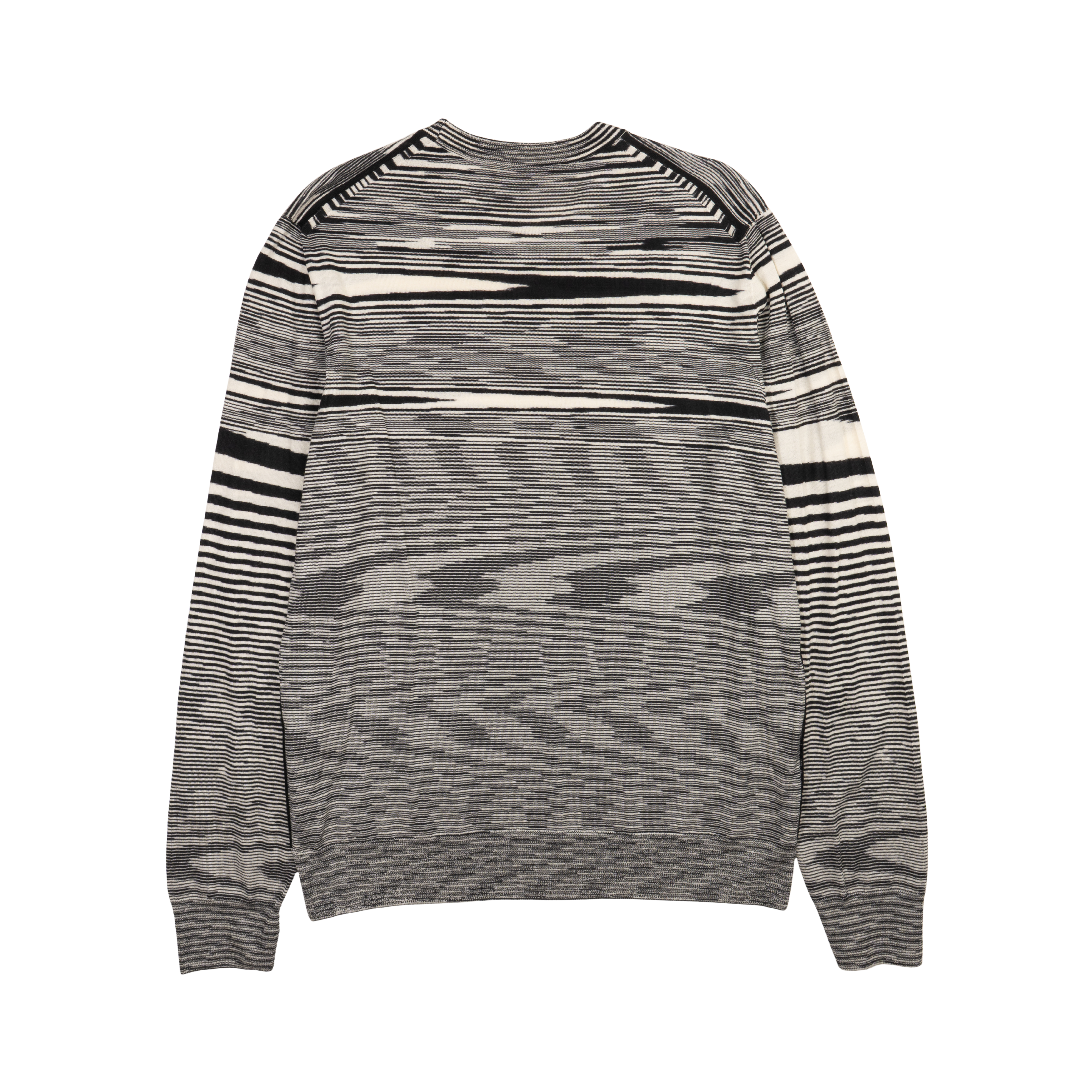 Missoni knit pull over crewneck sweater with black and white horizontal distorted stripes all over.