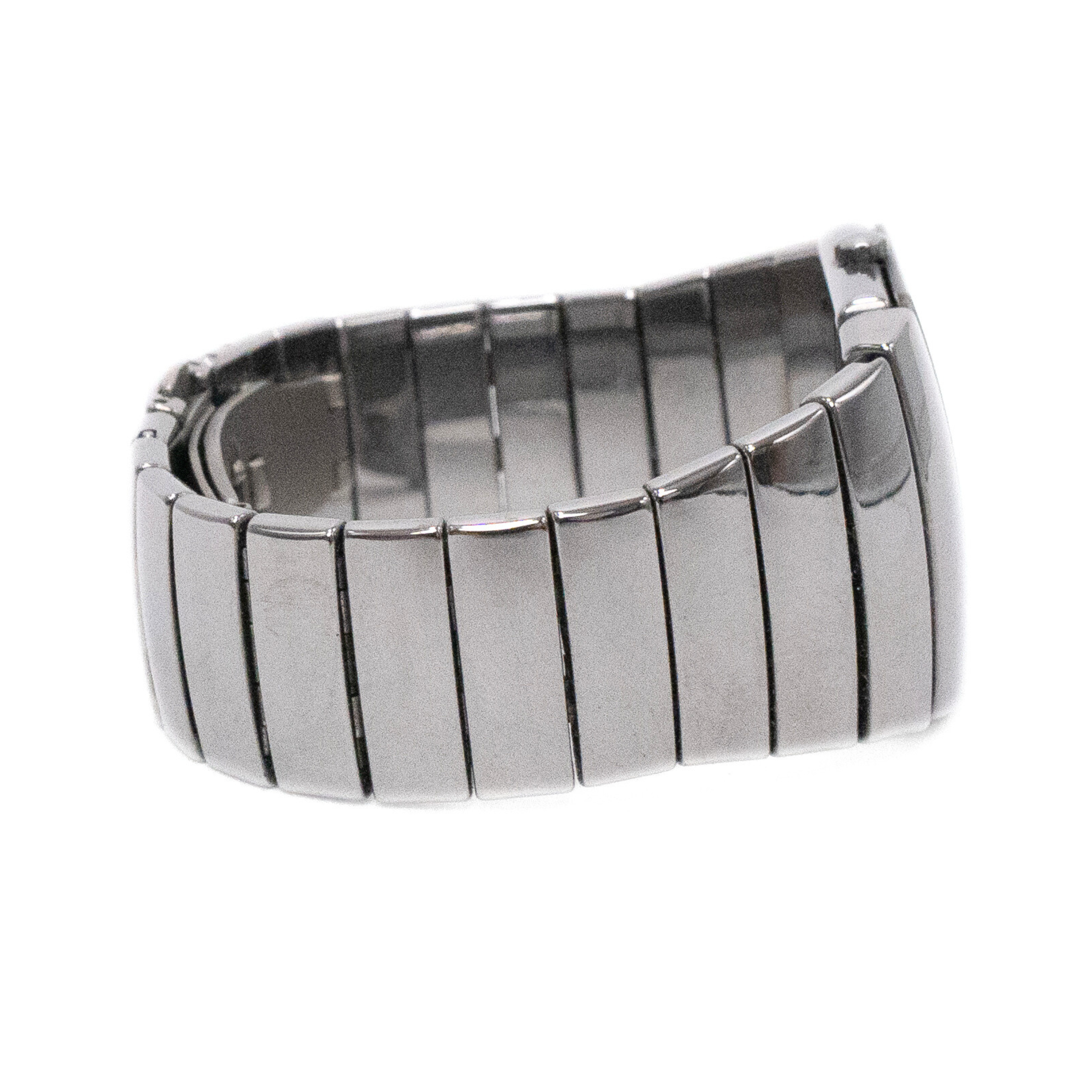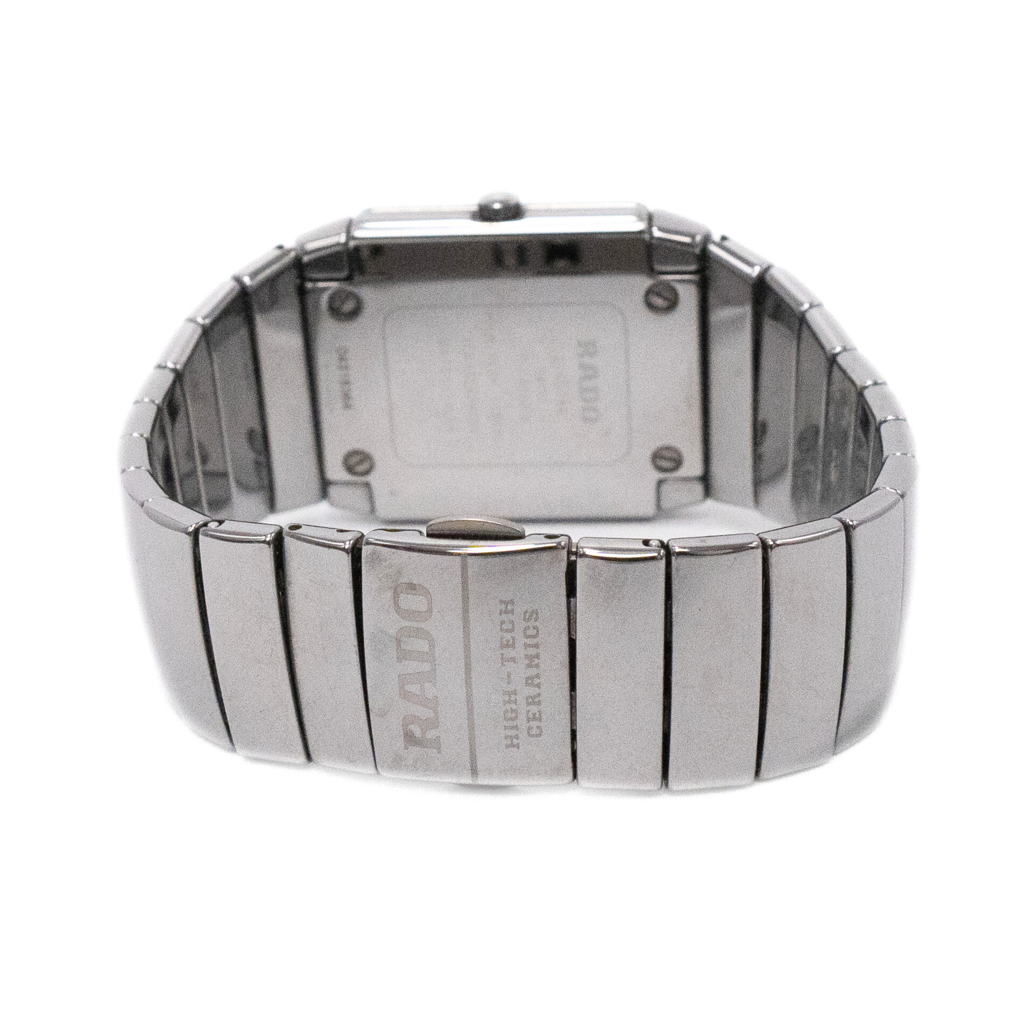 Rado 'Cintra' wrist watch in chrome silver ceramic with a square face, platinum toned bezel, a grey canvas dial, and a date display at the 6 o'clock position. The watch features a clasp closure with a hidden push button.