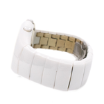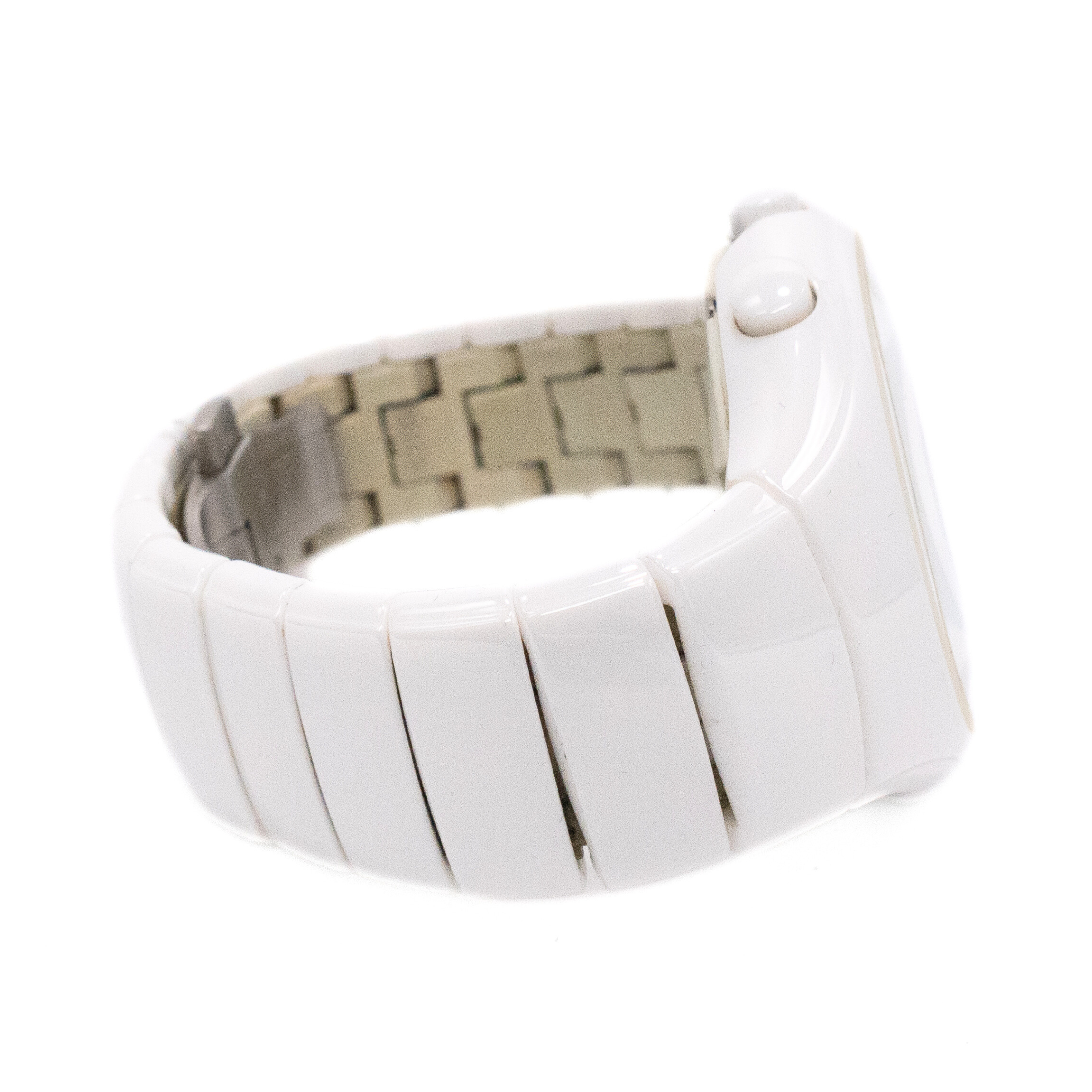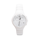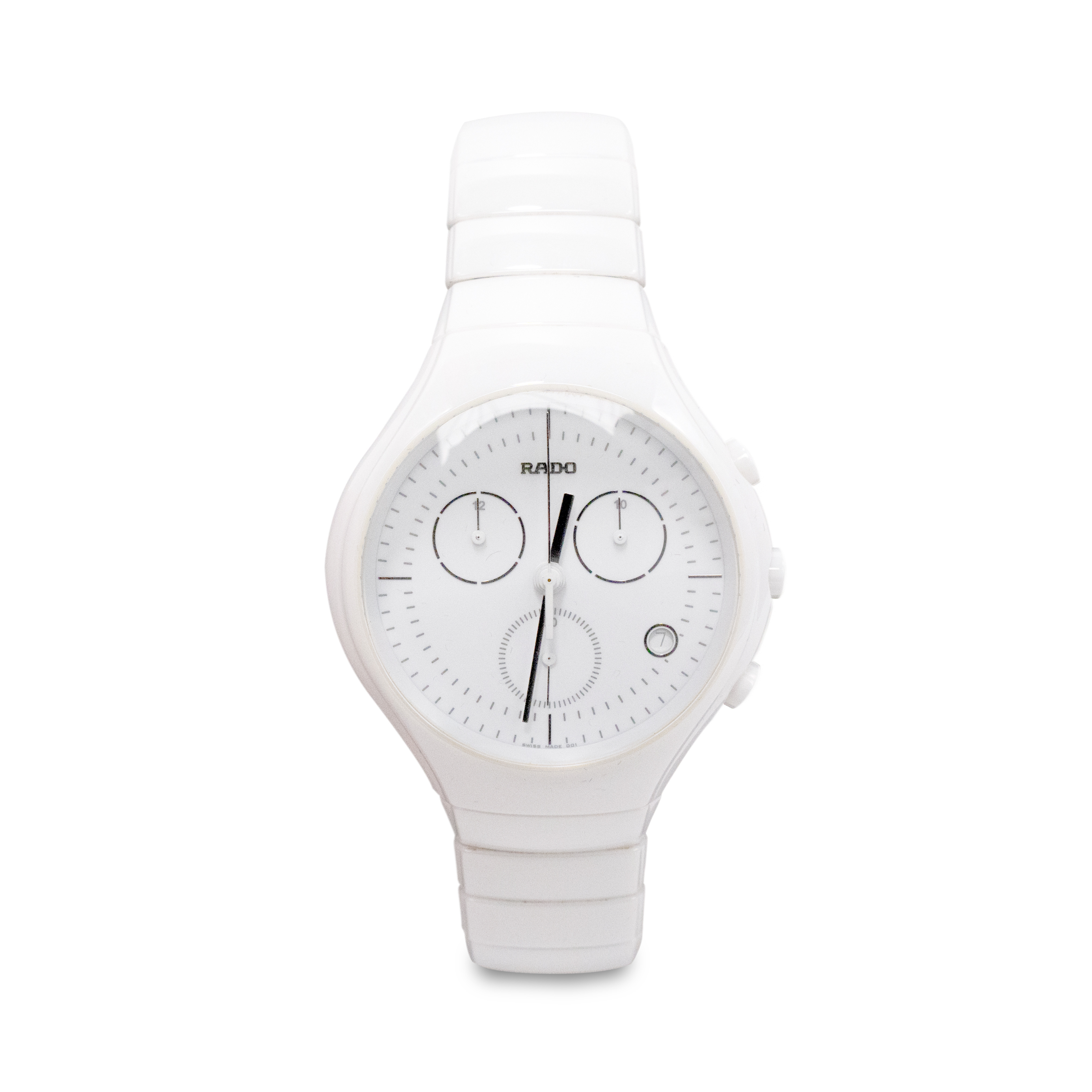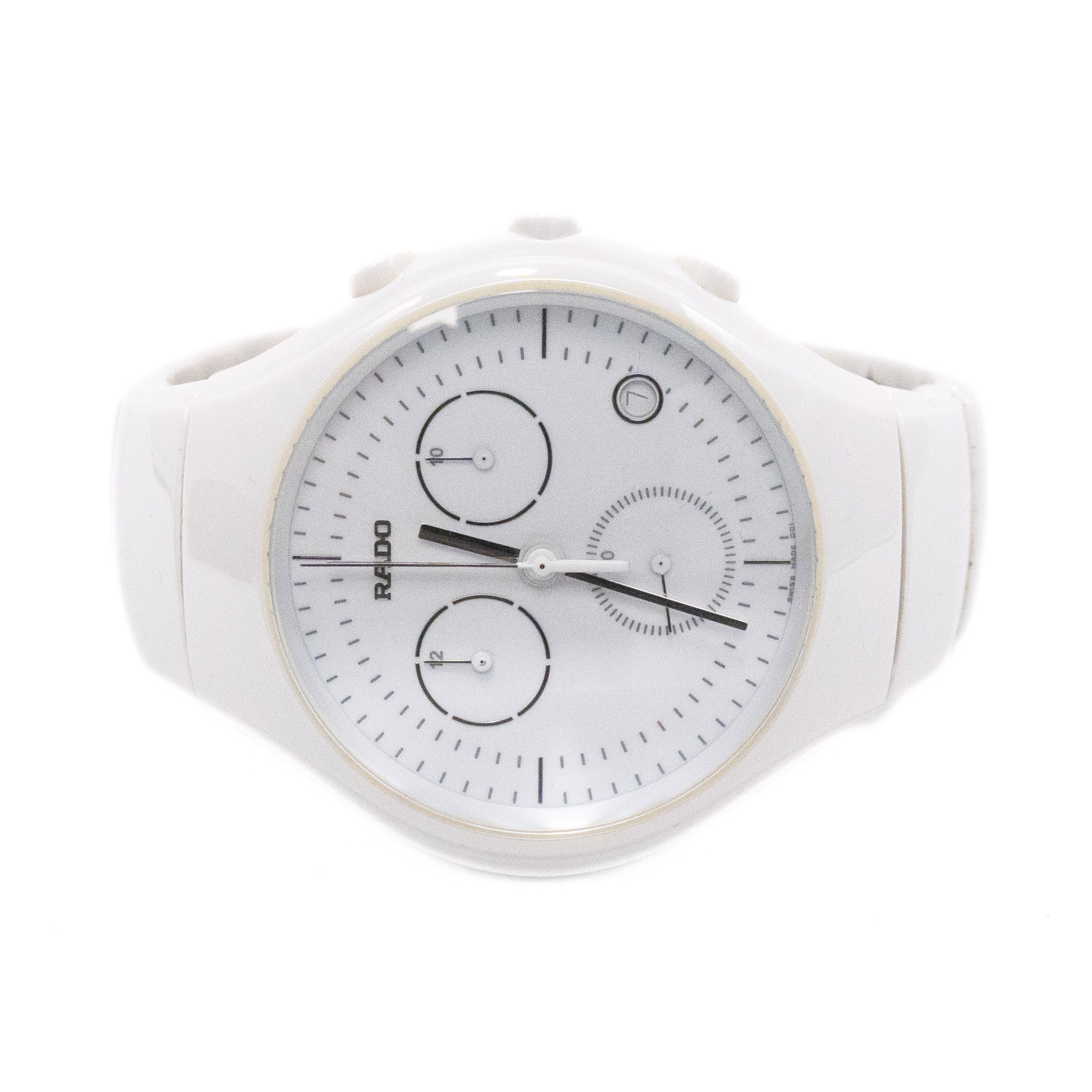 Rado 'True White Chrono' wrist watch in white ceramic with a circular face, a bright white dial, and a date display at the 4 o'clock position. The watch features a clasp closure with a hidden push button.