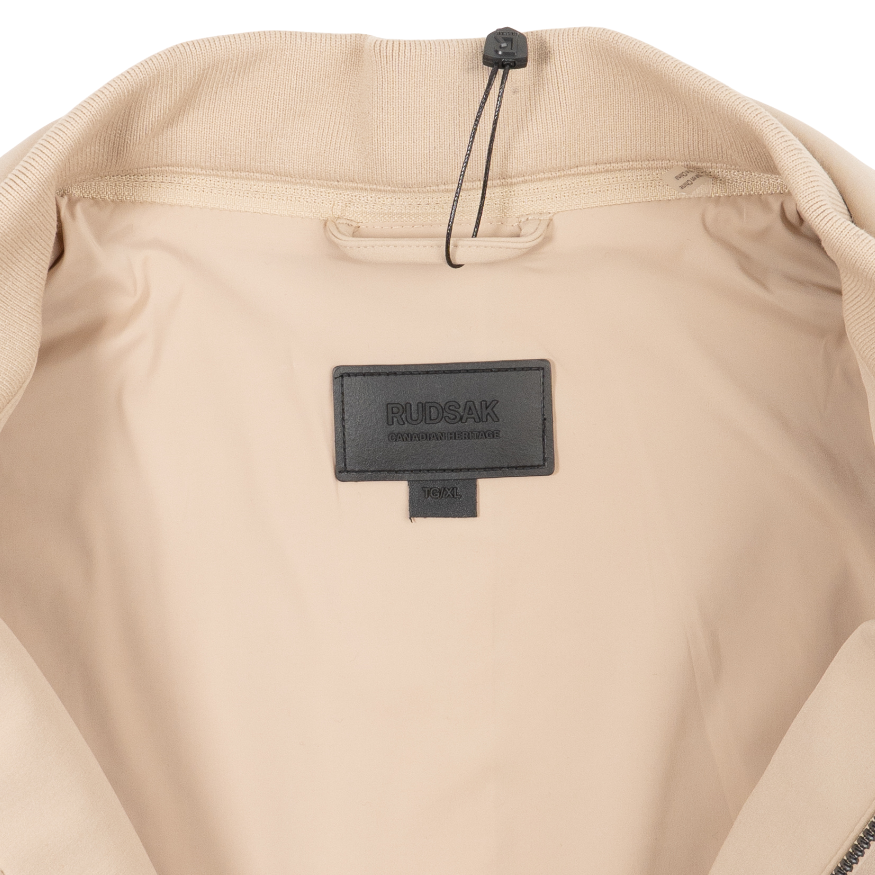 Rudsak 'Keith' blazer technical jacket in beige nylon with four pocket styling, notch collar, and button closure. Features a ribbed dickie collar zip off underlay.