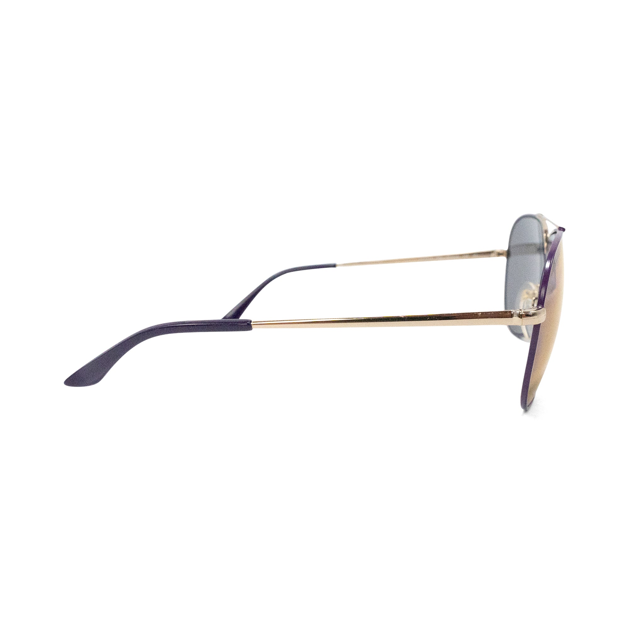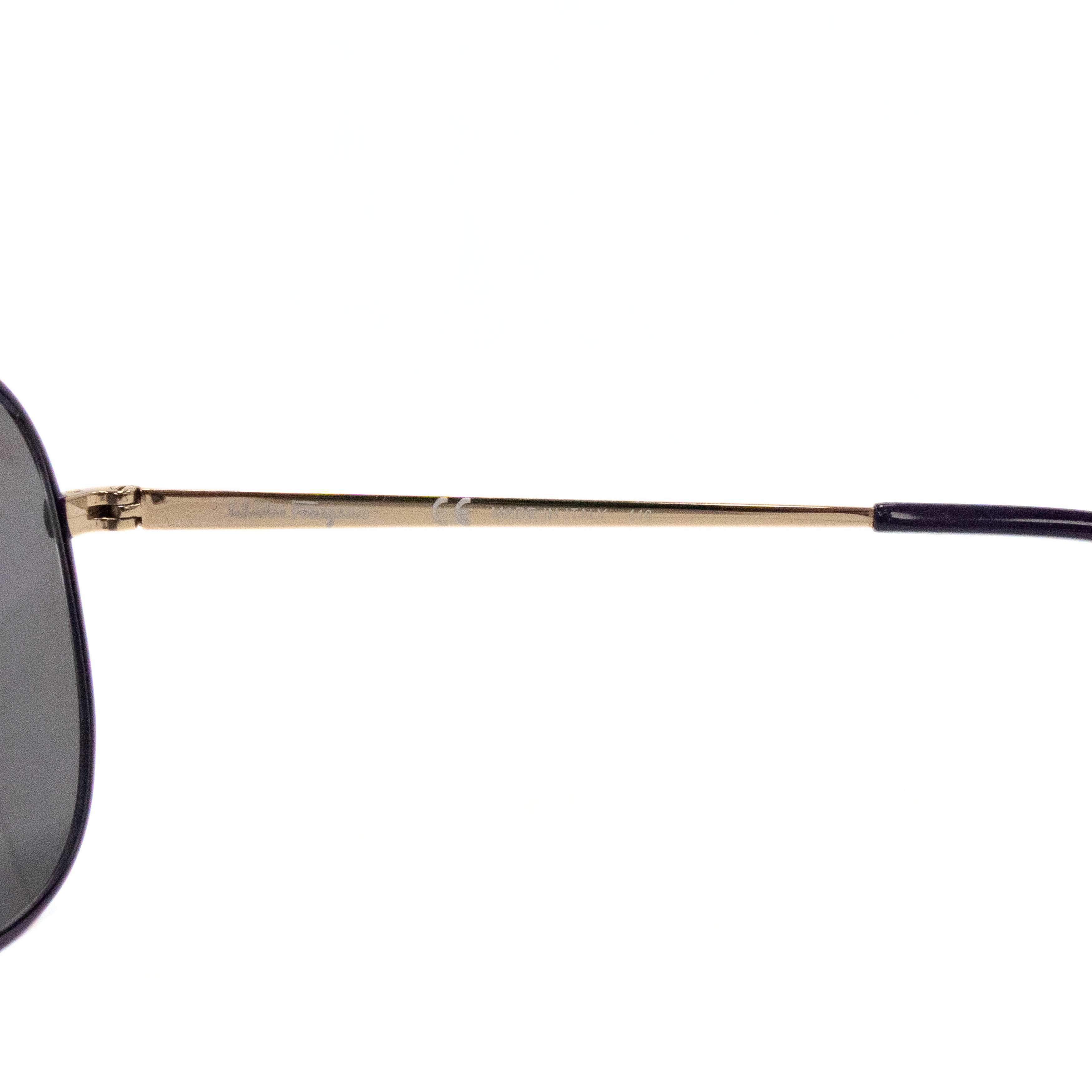 Salvatore Ferragamo aviator sunglasses with reflective lenses and purple and rose gold frames.