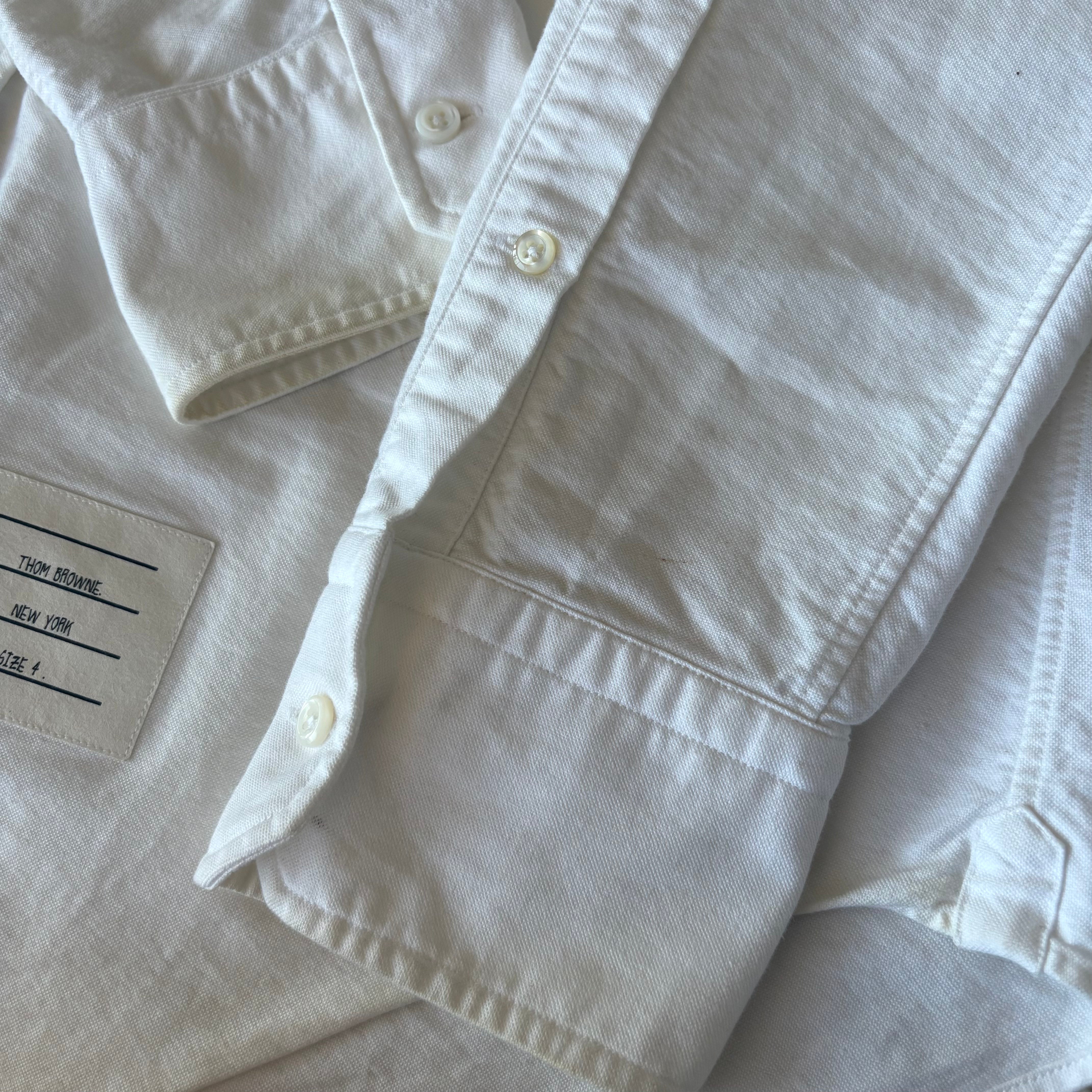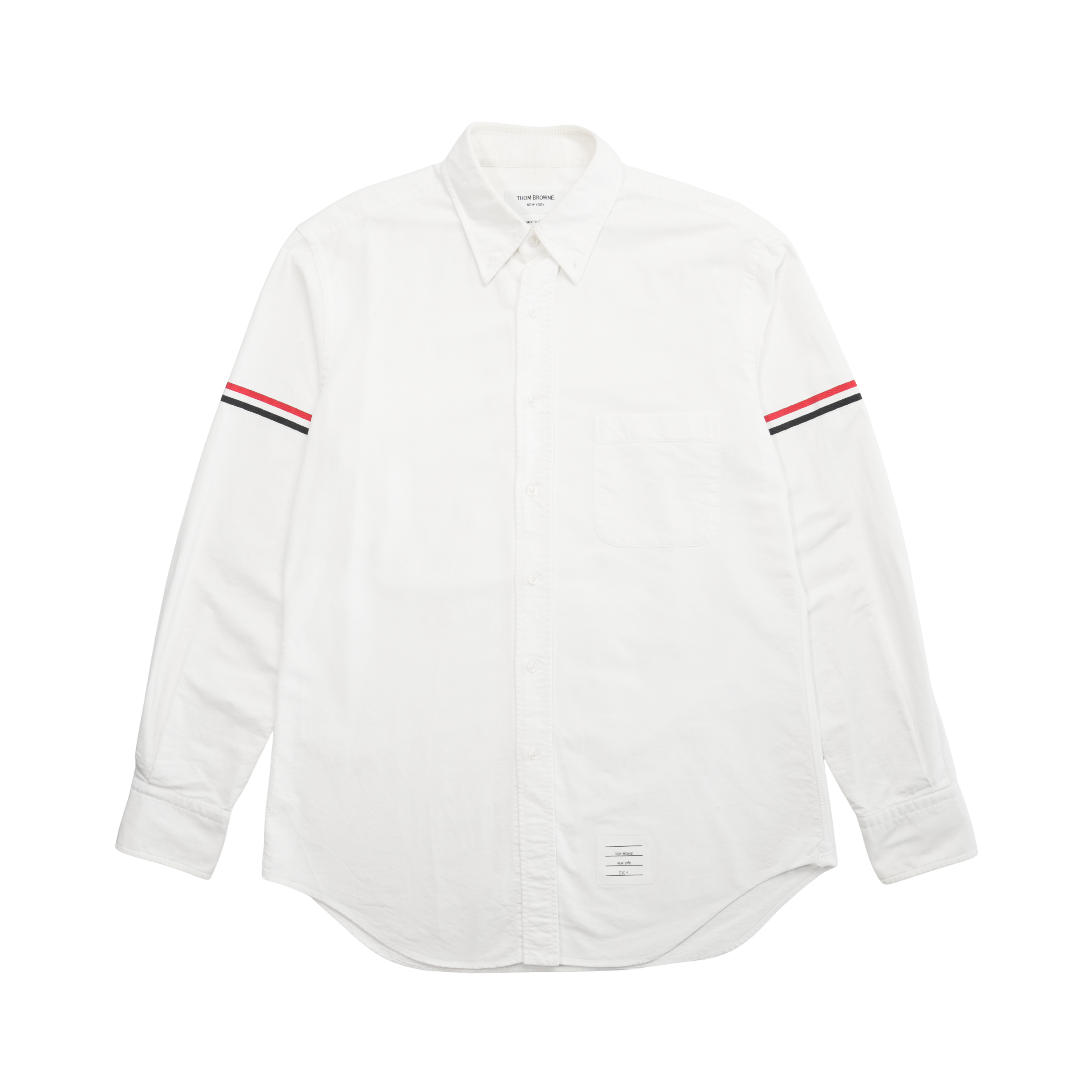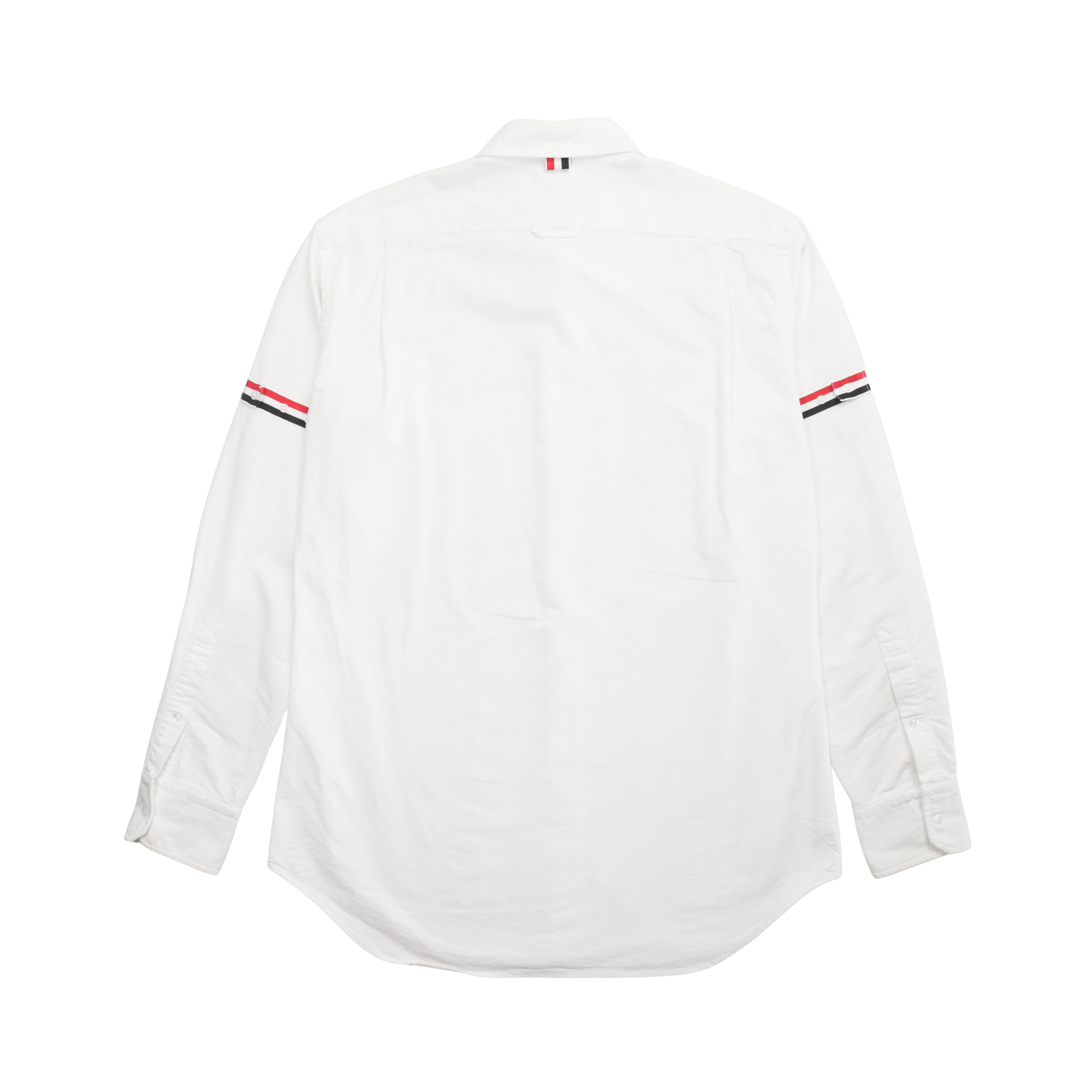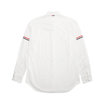 Thom Browne button-down shirt in white cotton with a small iridescent buttons, a chest pocket, and red and navy striped bands on the sleeves.