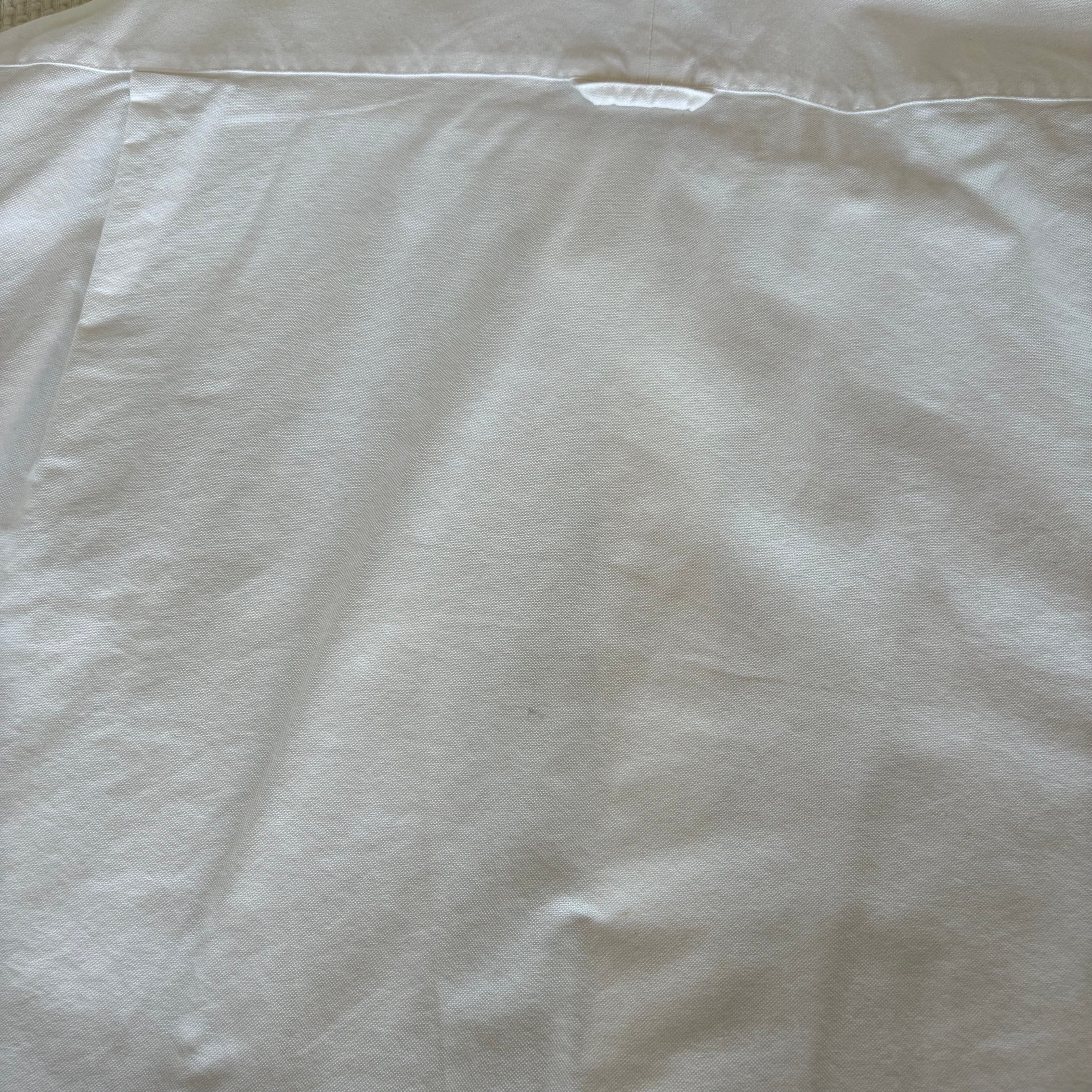 As is. Small stains throughout garment, staining at inner collar and sleeve cuffs.