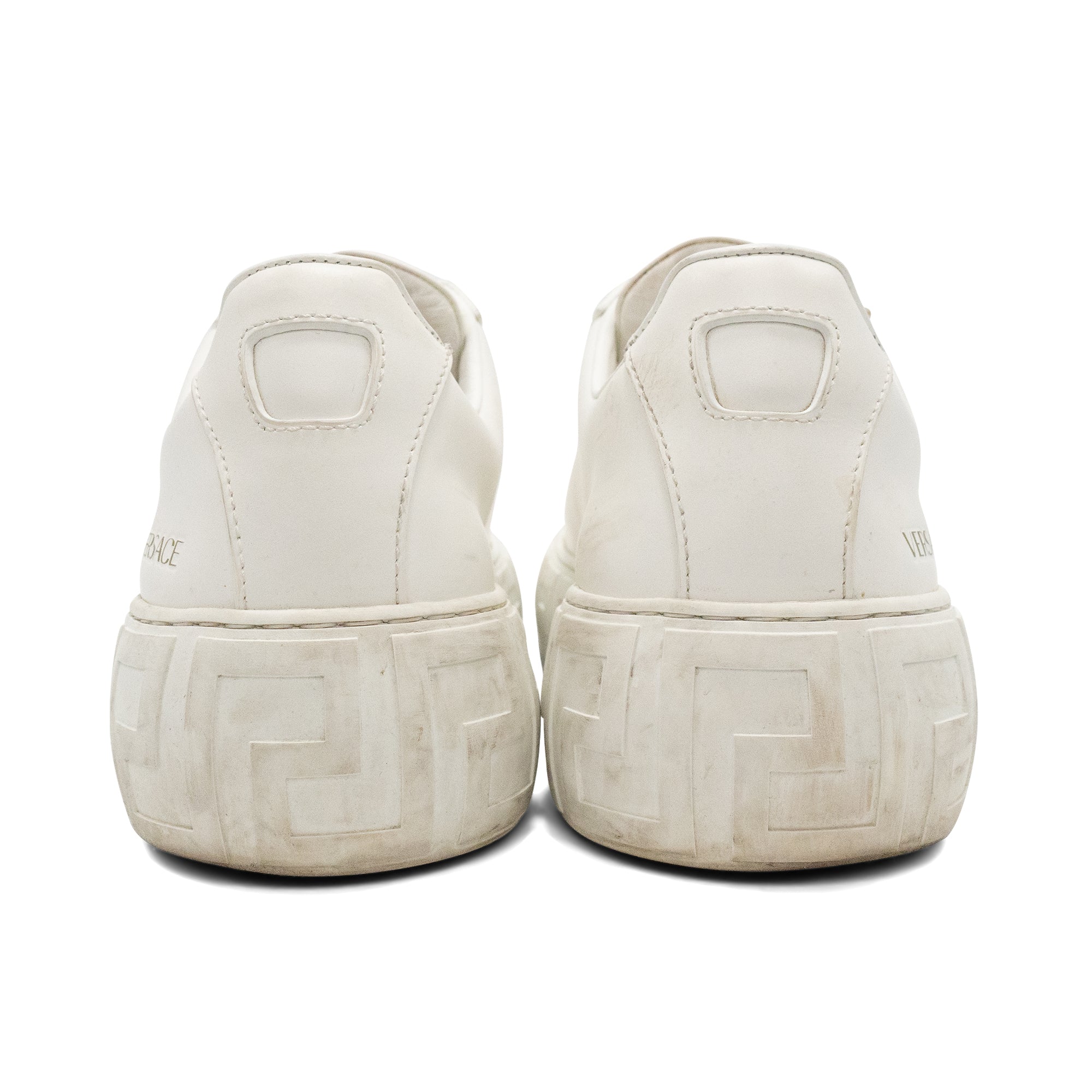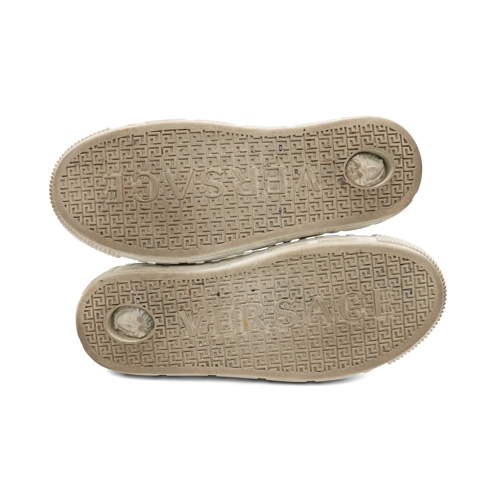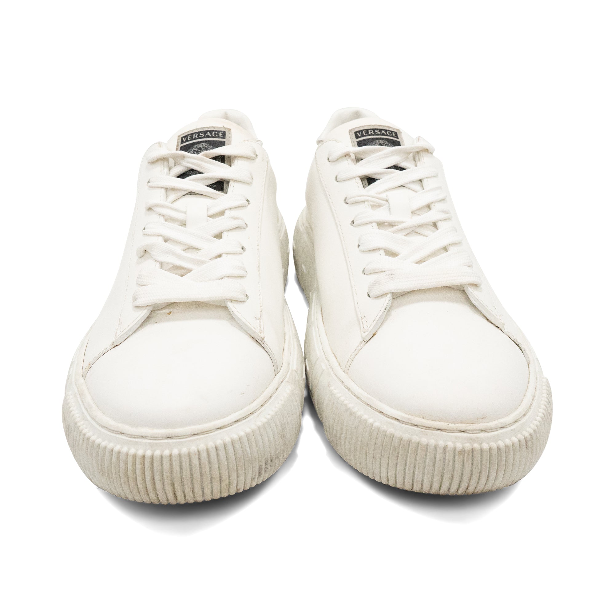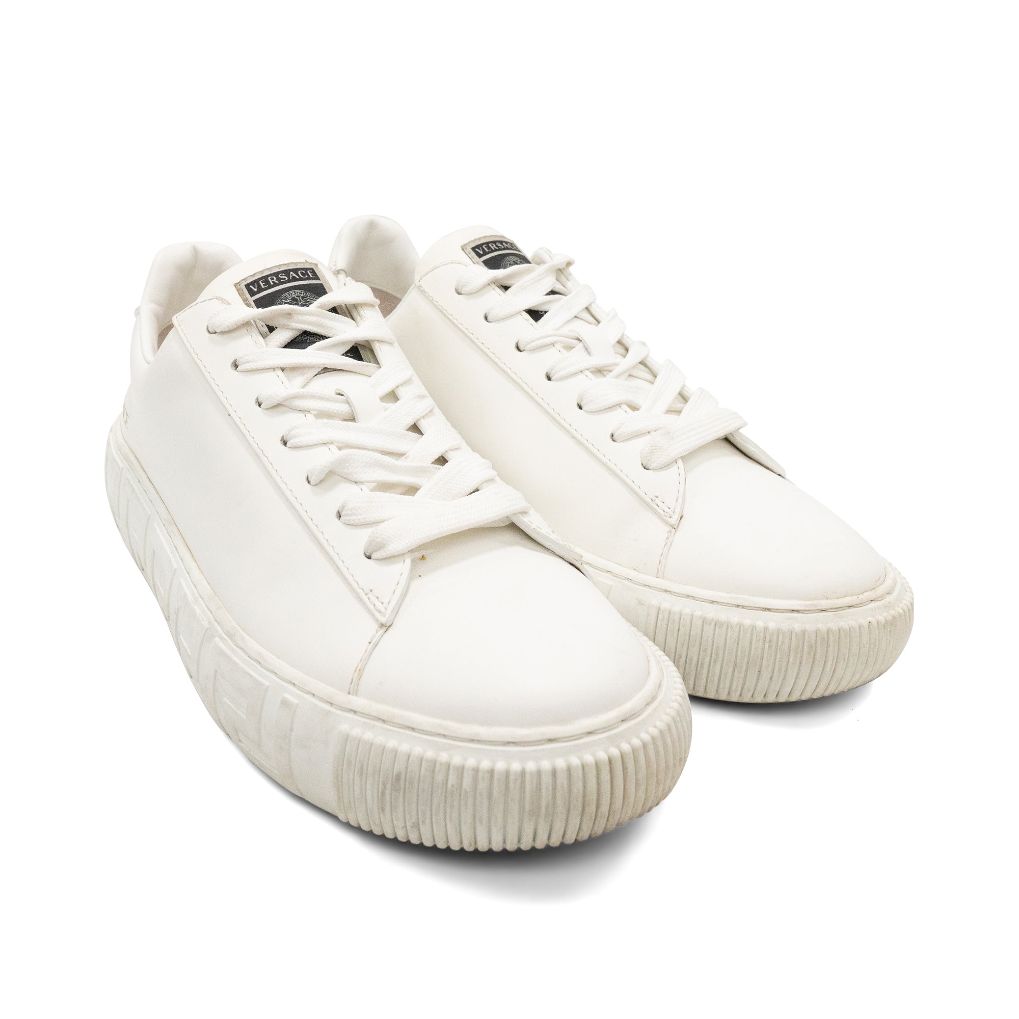 Versace 'Greca Nylon' lowtop sneakers in white nylon with thick rubber engraved Greca sole. New season Greca sneakers are made using responsible materials with certified recycled content.
