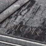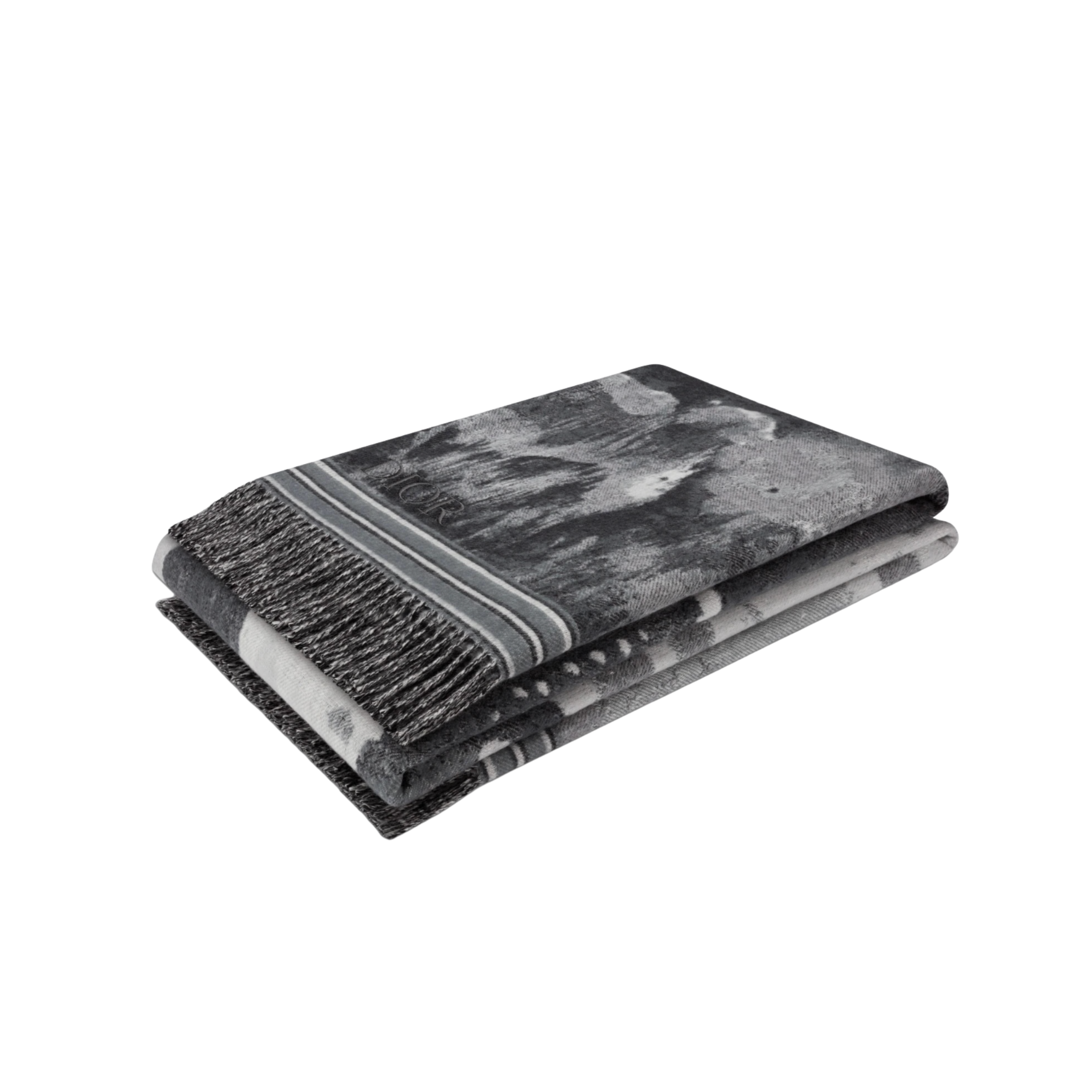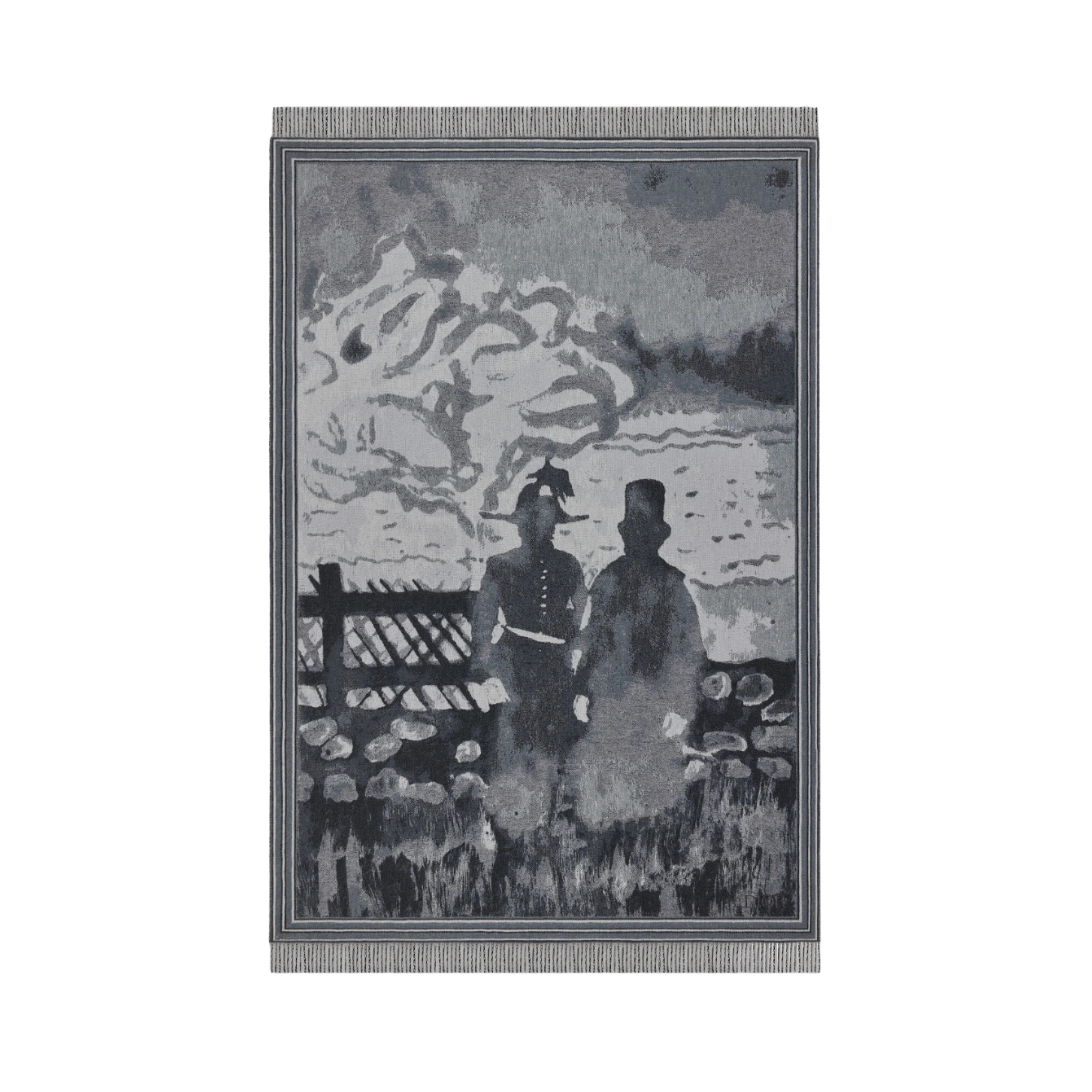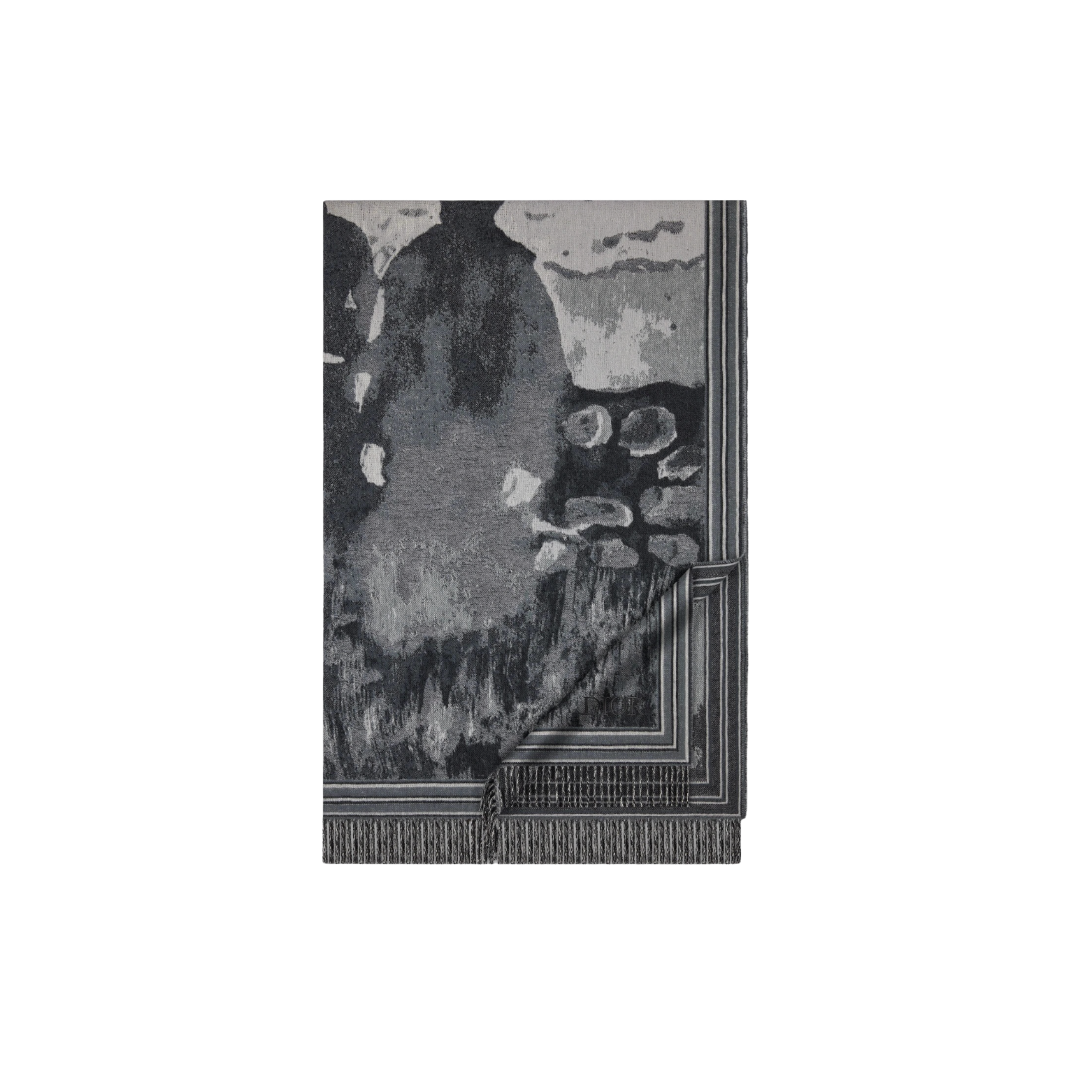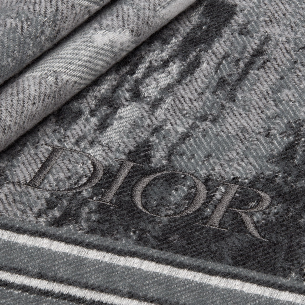 Christian Dior x Peter Doig blanket scarf in a grey tonal wool with fringe tassel ends and embroidered logo. Features imagery of two silhouettes in a rural landscape.