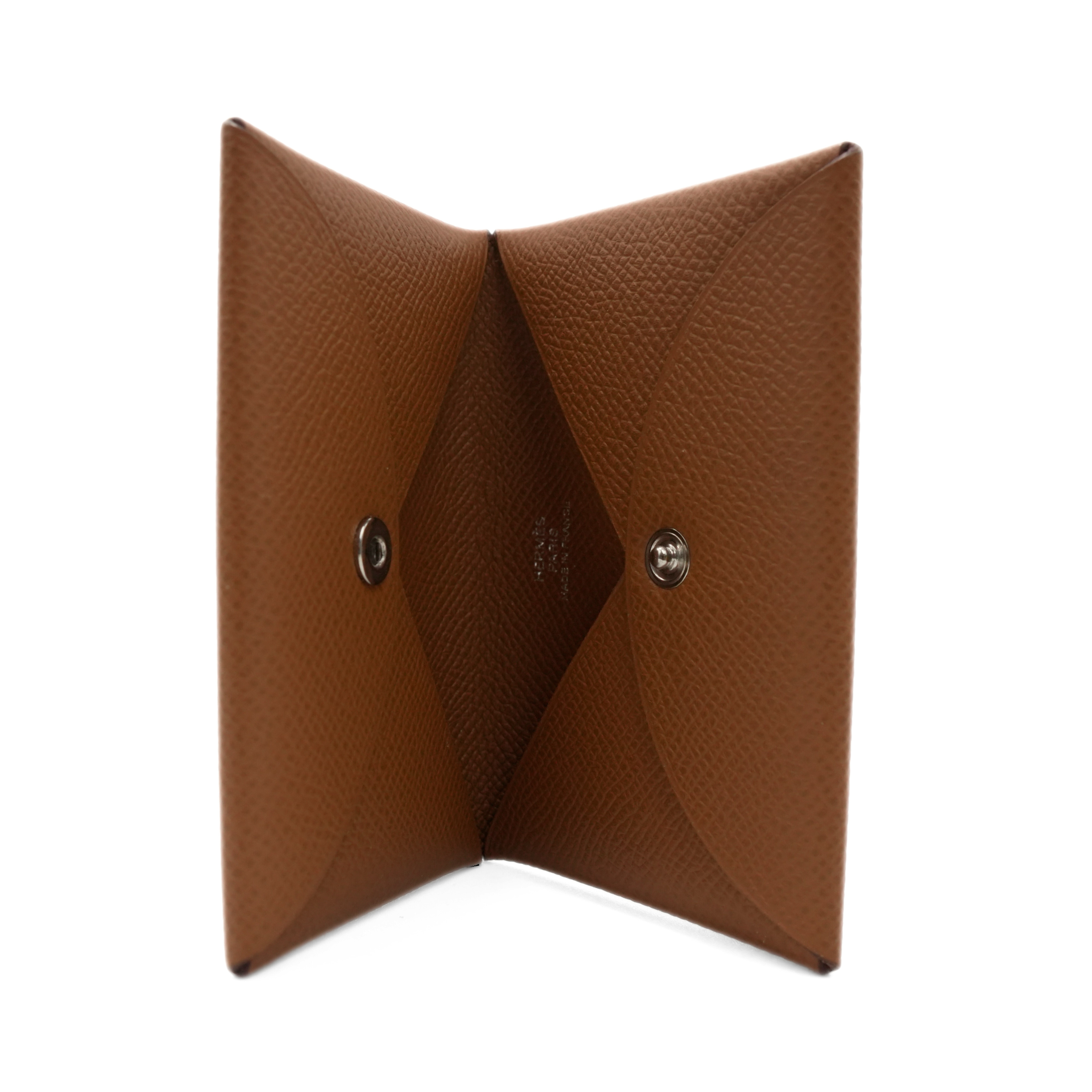 Hermes 'Calvi Duo' compact cardholder wallet in 'Gold' brown epsom leather with a silver snap button closure and two open interior pouches.