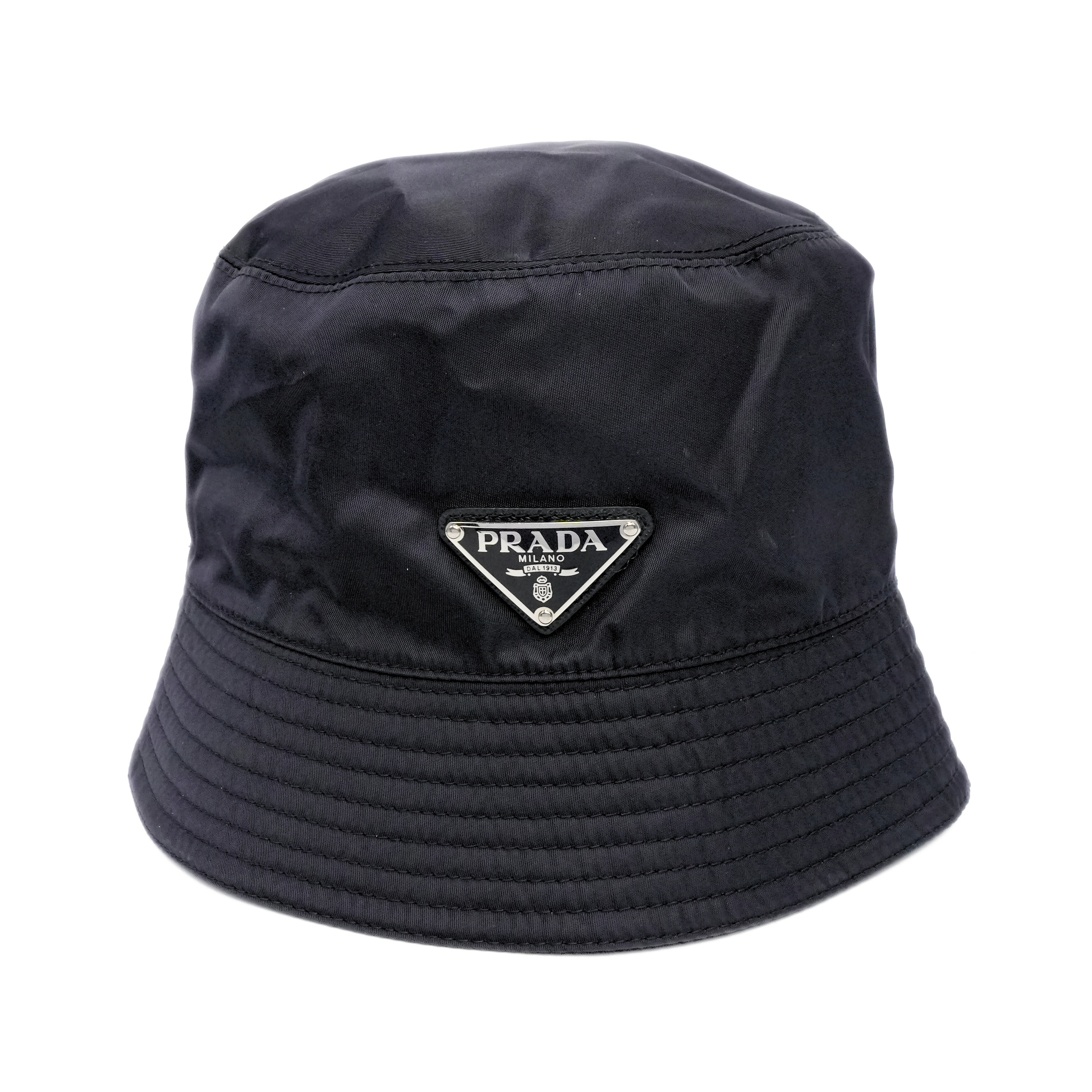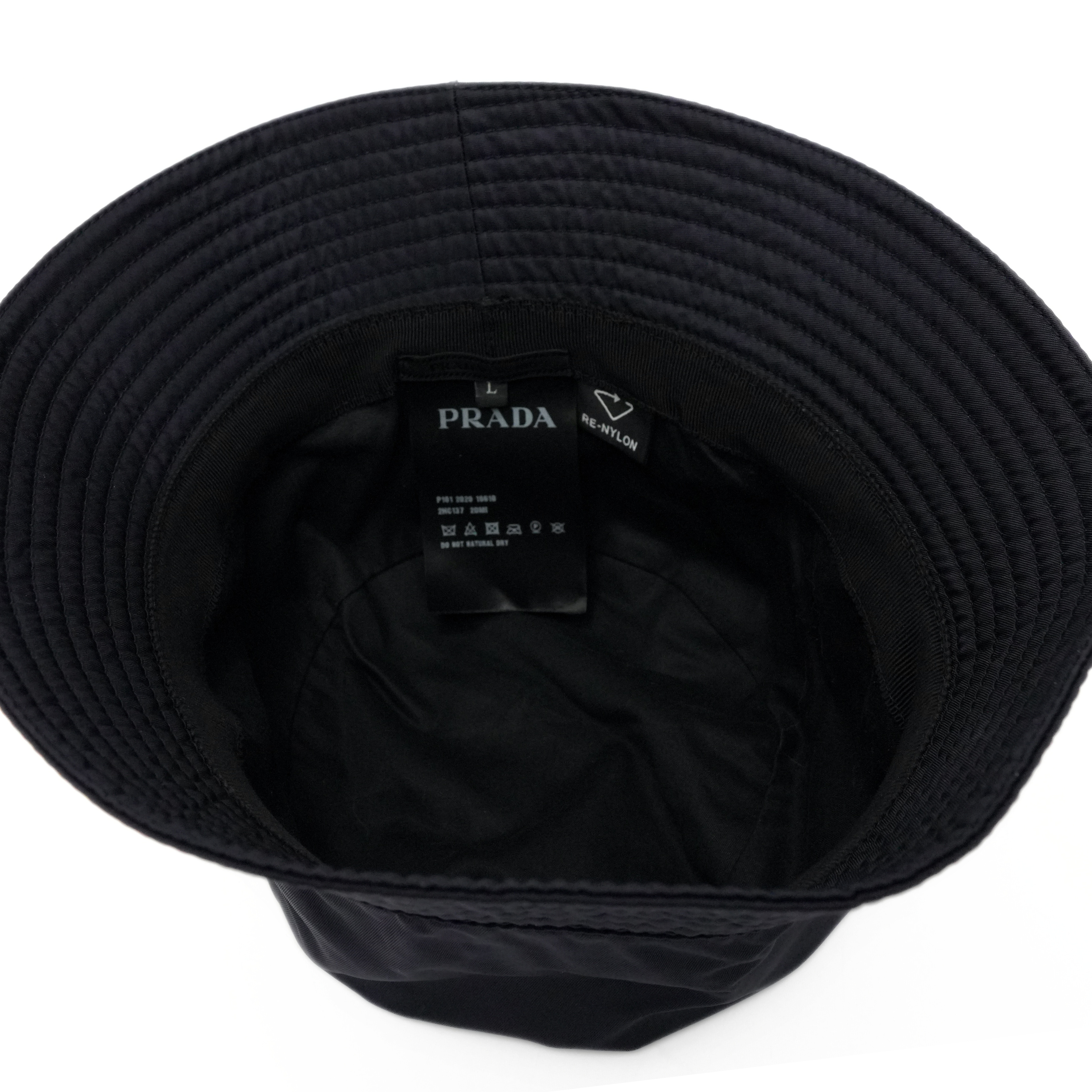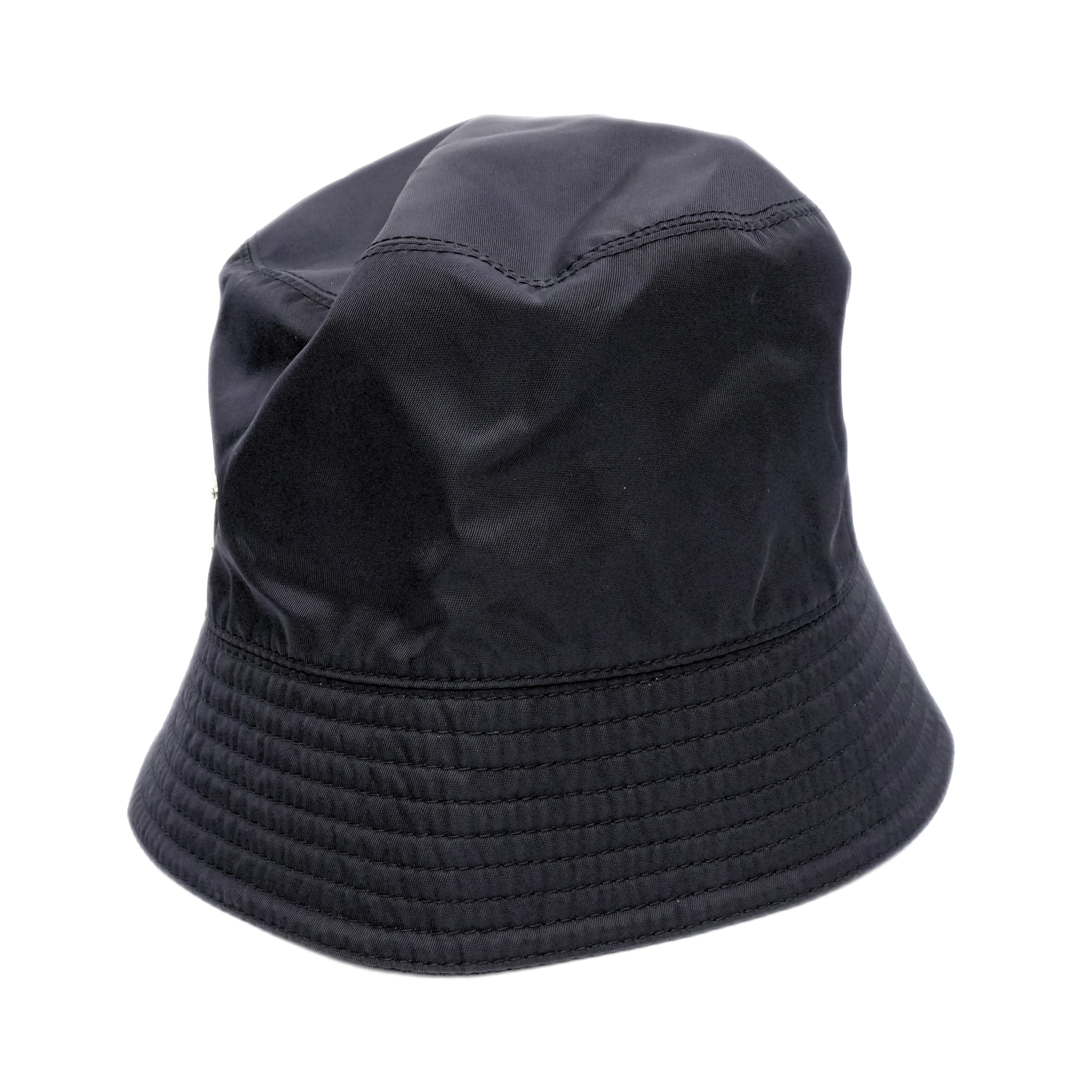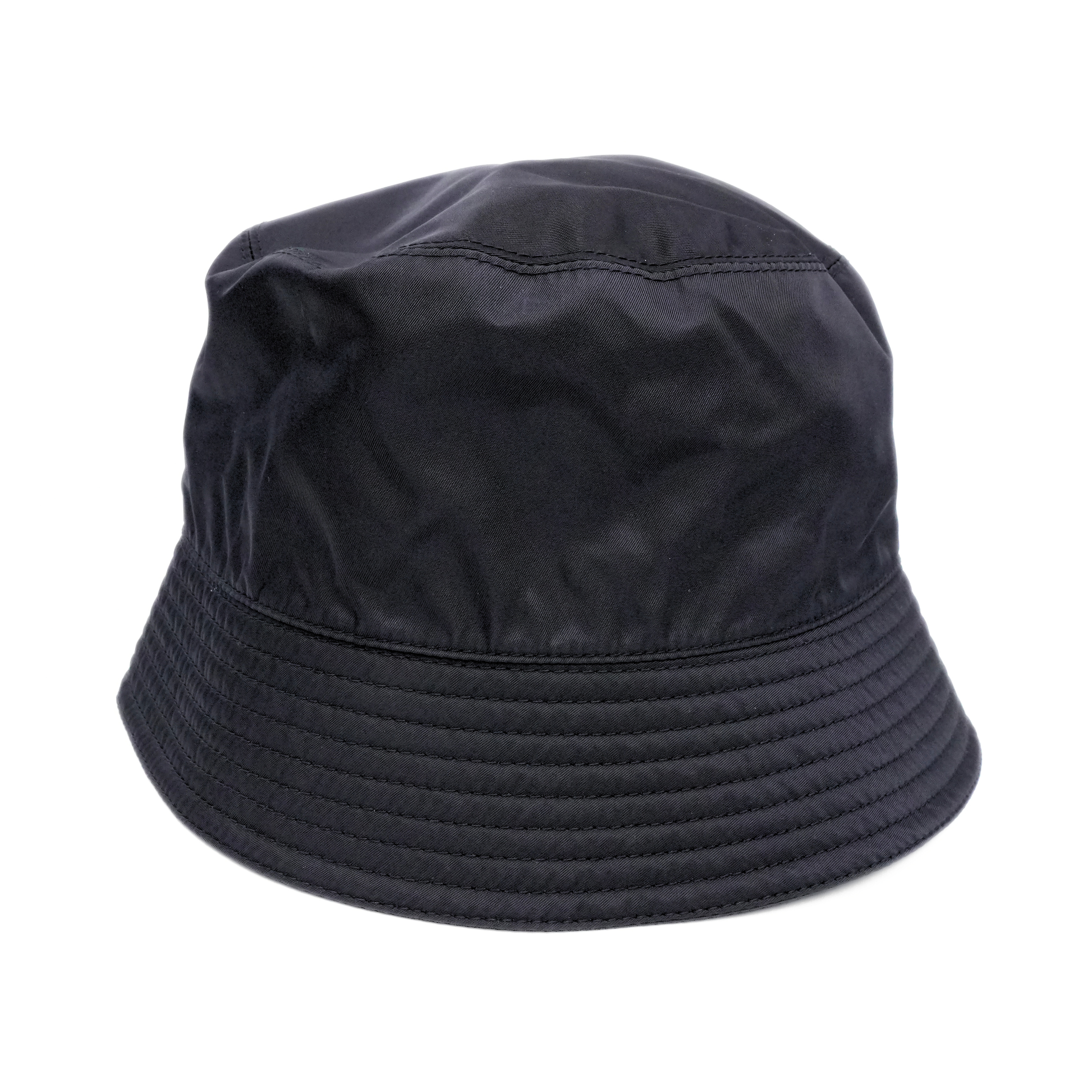 Prada bucket hat in navy blue nylon with a signature silver triangle logo on the front, a quilted brim, and tonal stitching.