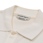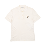 Alexander McQueen short sleeve polo shirt in white jersey with silver beaded skull patch on the chest with red, blue and green details.