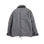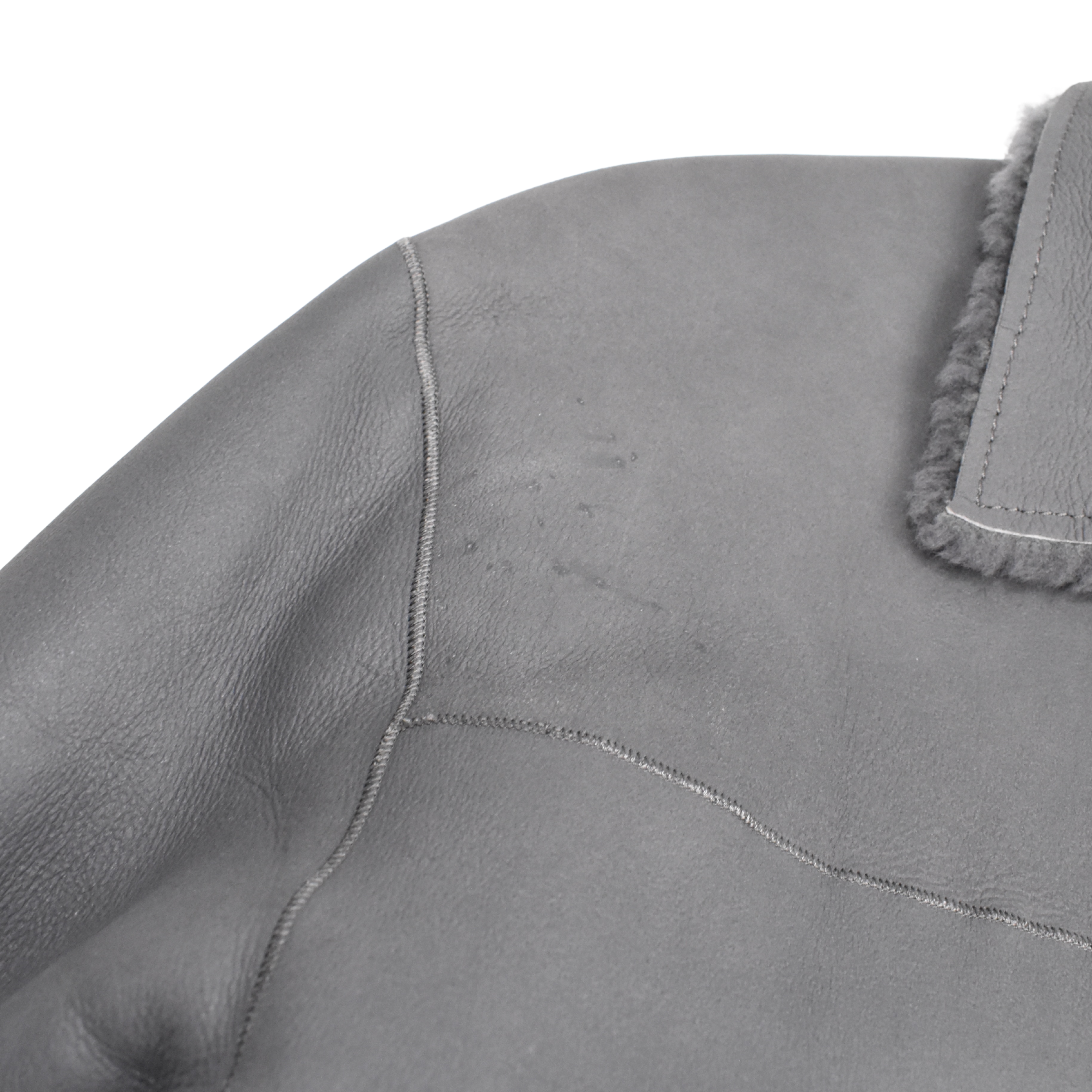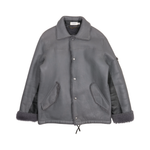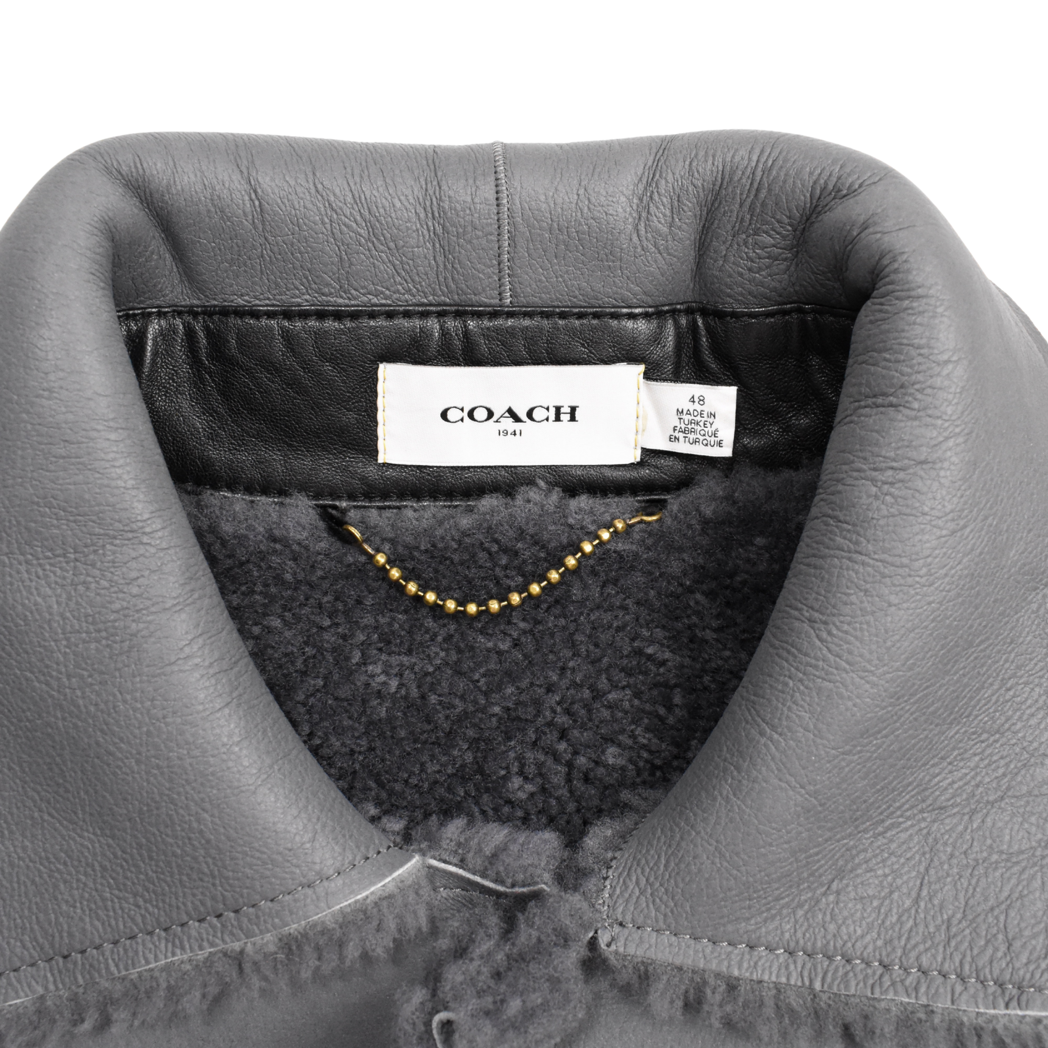 Coach jacket in grey leather with shearling lining, front snap closures, and flap pockets. Features a drawstring hem and black leather contrast sleeve panel.