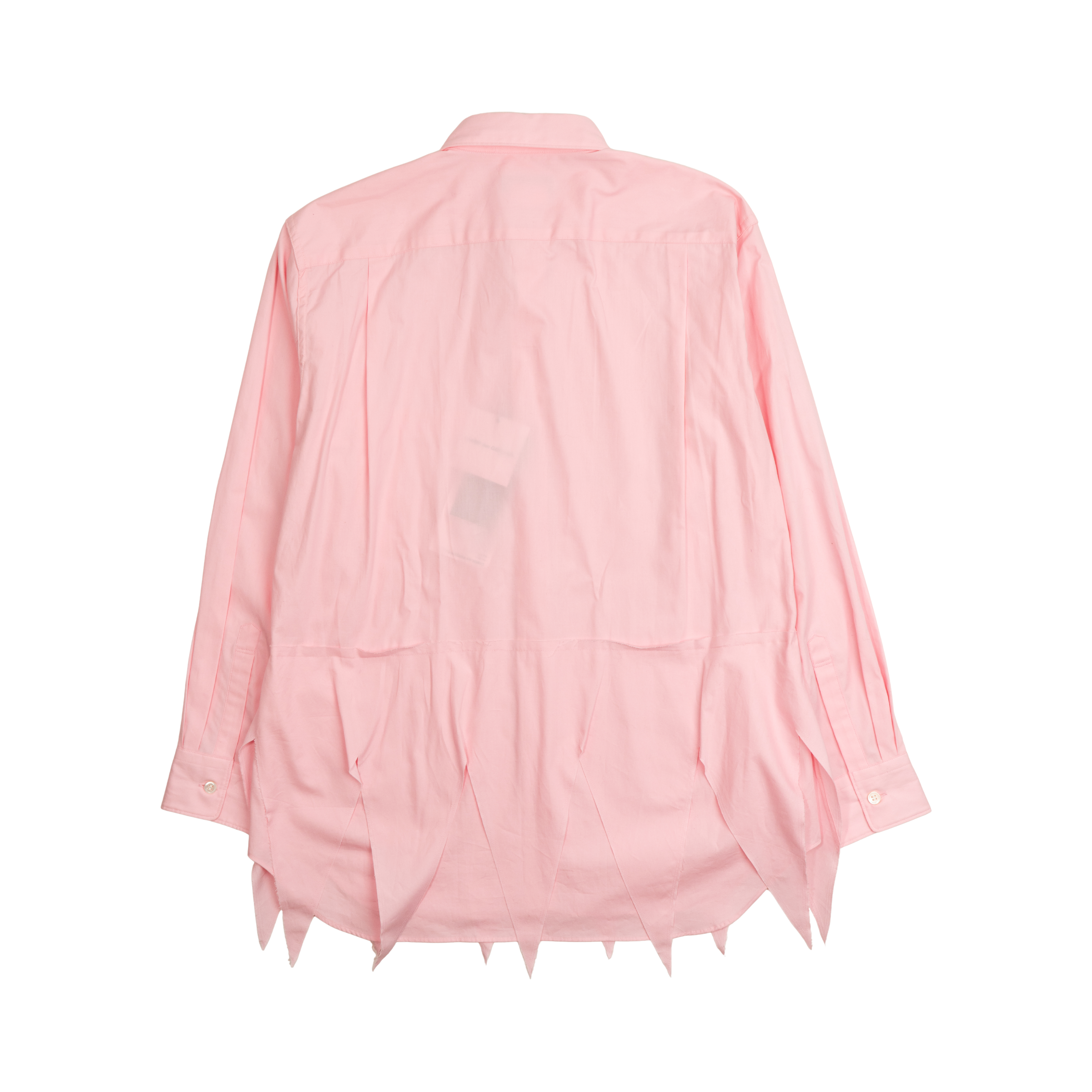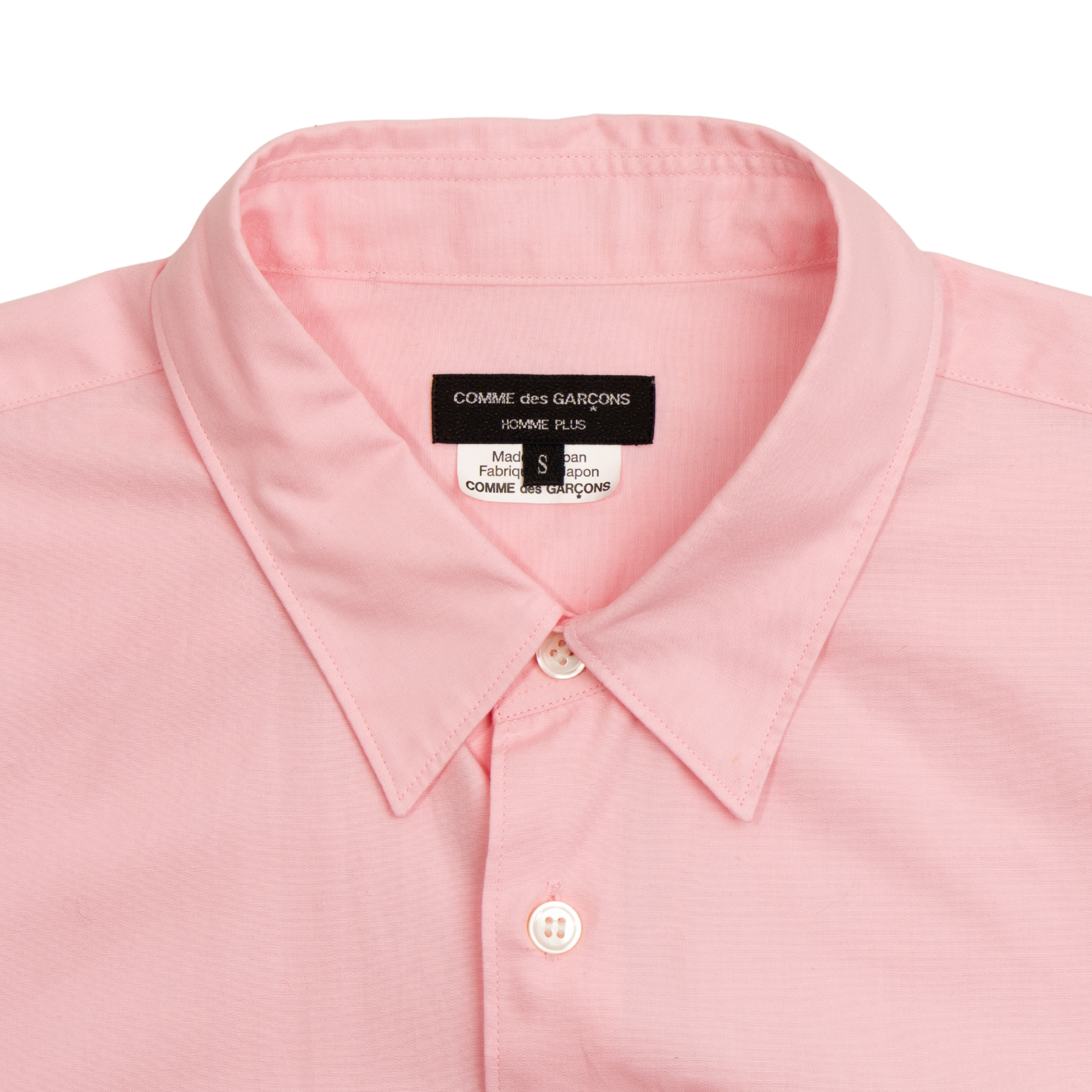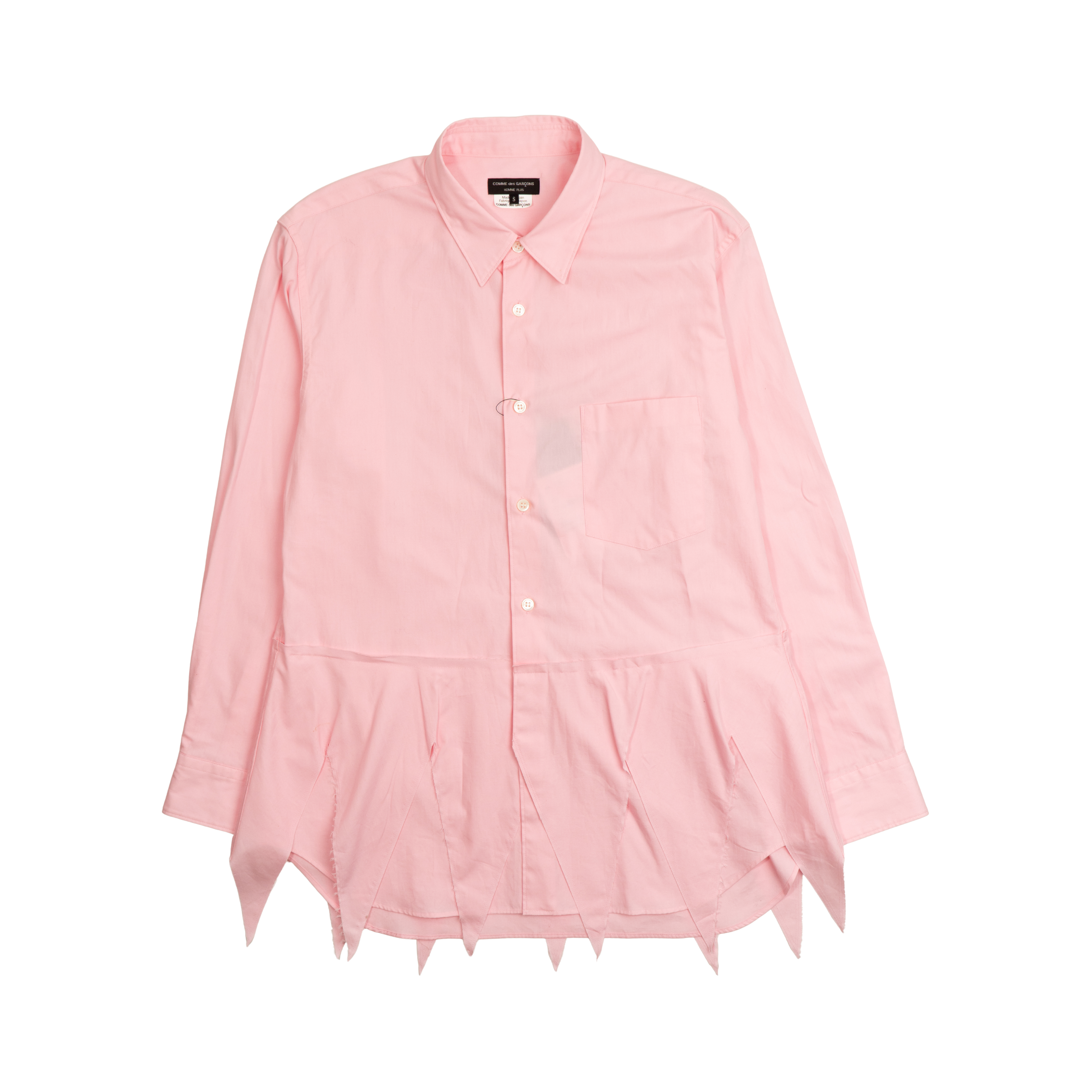 Comme Des Garcons 'Homme Plus' button down top in light pink cotton with bottom triangular hem panel, front button down closure with white opalescent buttons, patch chest pocket and shirt collar.