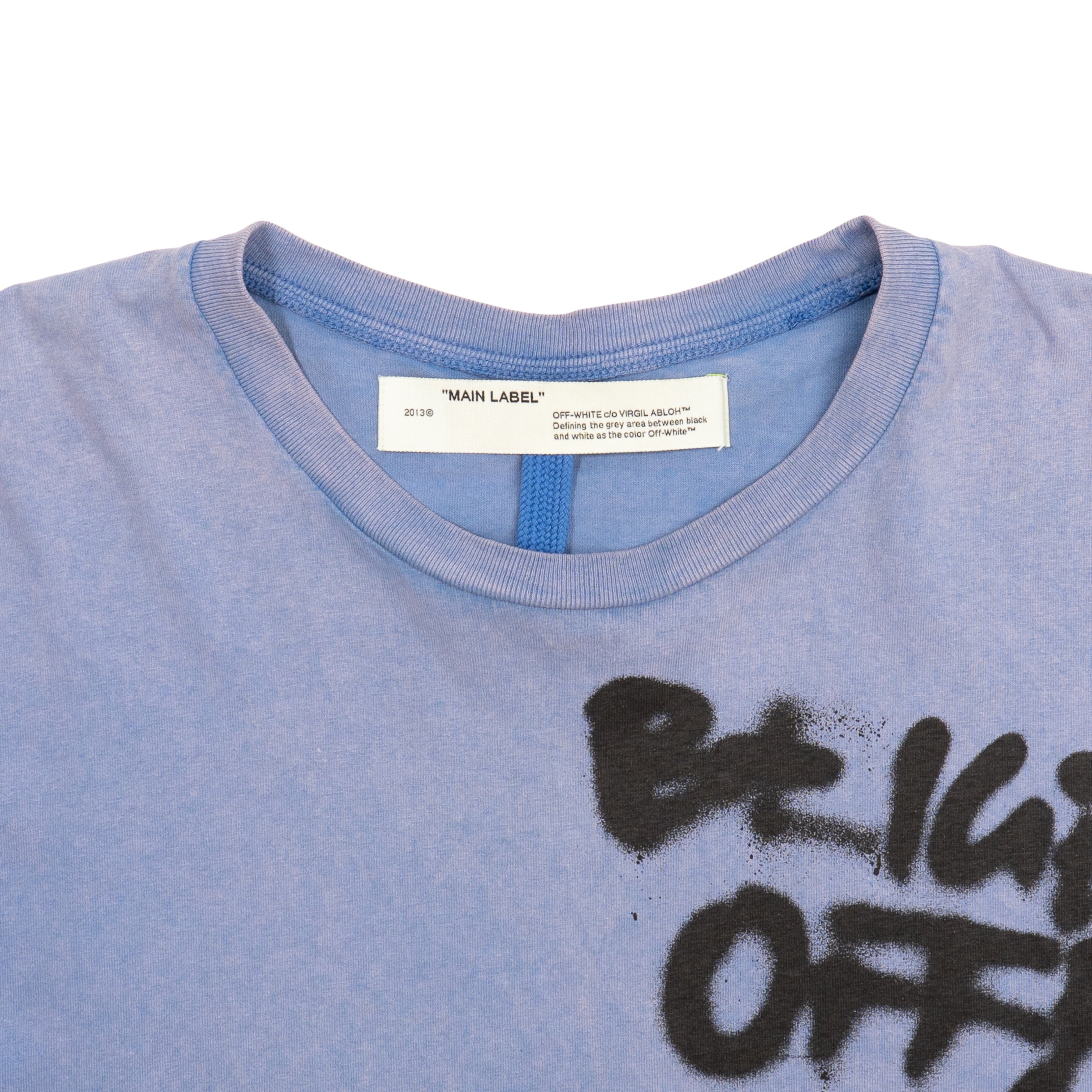 Off-White round neck t-shirt in pale blue with black spray paint text on the front chest and jump spray paint logo the back.